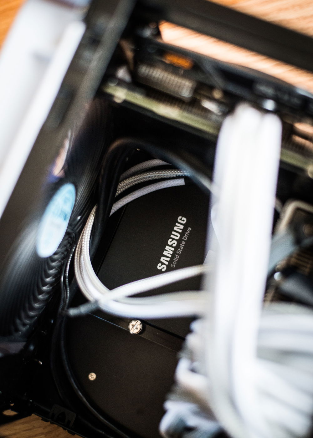 In order to maximize airflow and have neater cable management, I had make some sacrifices. This was one of them. I ditched the slim optical drive and 3.5” Storage Drive for a single 250GB SSD. I figured I can access my other hard drives via a dock if really needed. Once SSD prices drop even more, I may consider getting a larger one.