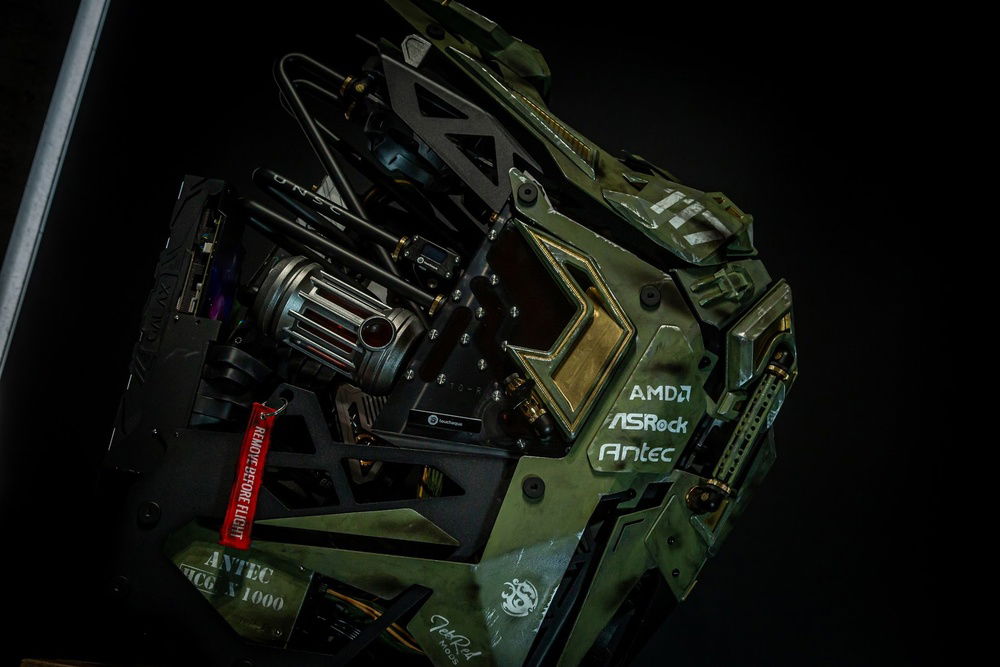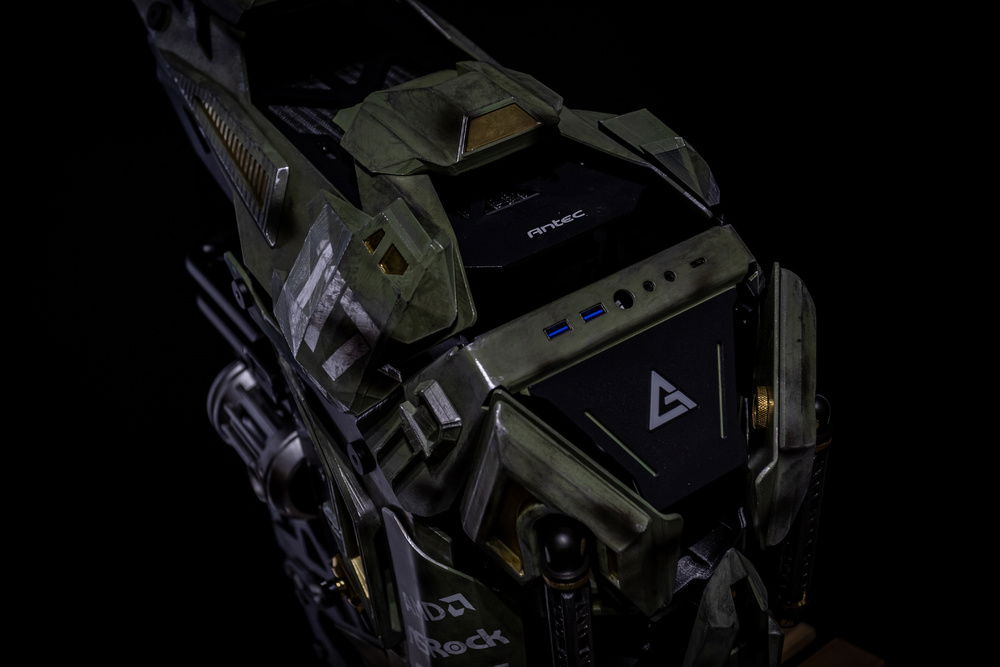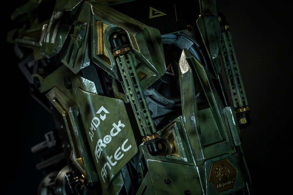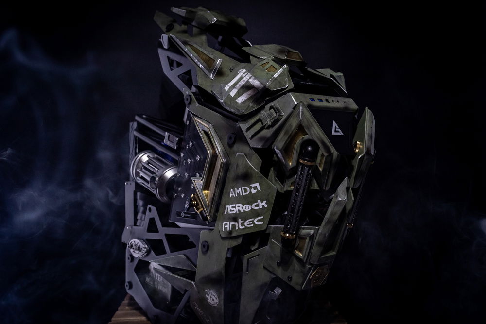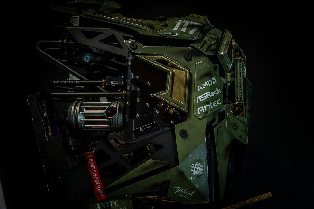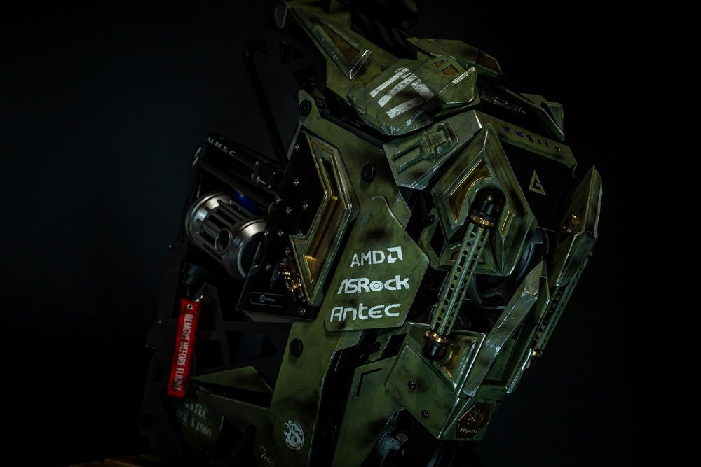 This build uses the Antec Torque chassis and is inspired by Master Chief from Halo. I wanted to do something different than all the other Torque builds I seen so I decided to keep the gpu stock cooler and mount it in the back to make it look like thrusters on a space ship or something lol. Being former military I love the army green color so I wanted this build to look like it has been through battle with damaged look and carbon scoring. Since I was only cooling the cpu and mounting the gpu in the back I wanted to fill out there space so I decided to create a "fuel cell" using a small res off the distro which I haven't seen before, it works well with this build I believe. More photos to come but I hope you enjoy