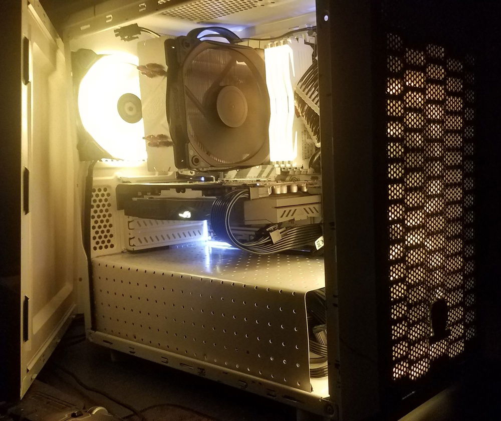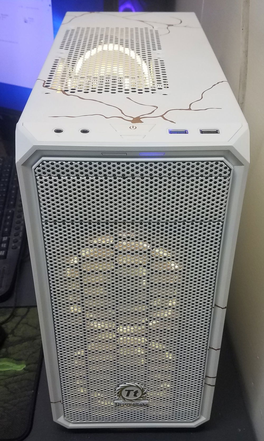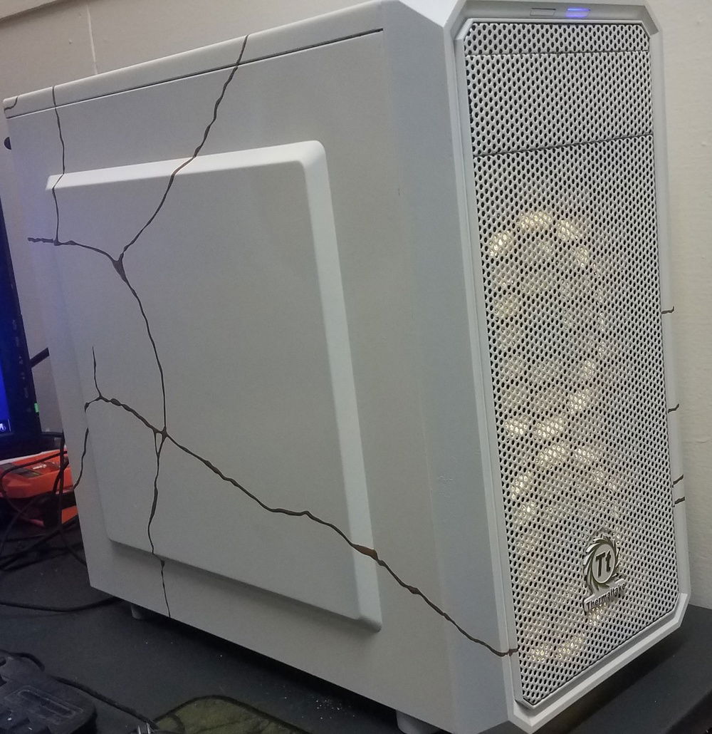 My first ever build to include any level of actual modding. Originally a black case it was resprayed in a white primer with metallic gold "cracks" and accents. Main modification was the PSU shroud which I made from a perforated metal drying rack I found in the corner of the shed. Template was made in the case using cardboard to serve as a template and the final product was made from the stainless steel tray. It was cut to size using just a pair of tin snips and then I filed off the sharp edges and bashed it into shape with a mallet. I then sprayed it to match the case white. I opted to paint the golden cracks on using a needle tipped bottle instead of a brush to give it more depth and a level of inconsistency to better represent the edges of cracks rarely being smooth, often marred with little chips missing. I had next to no tools and about that much experience, but here we are with a final product and I hope it helps convince someone that they can do it too!