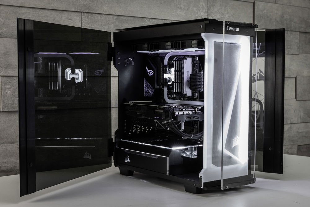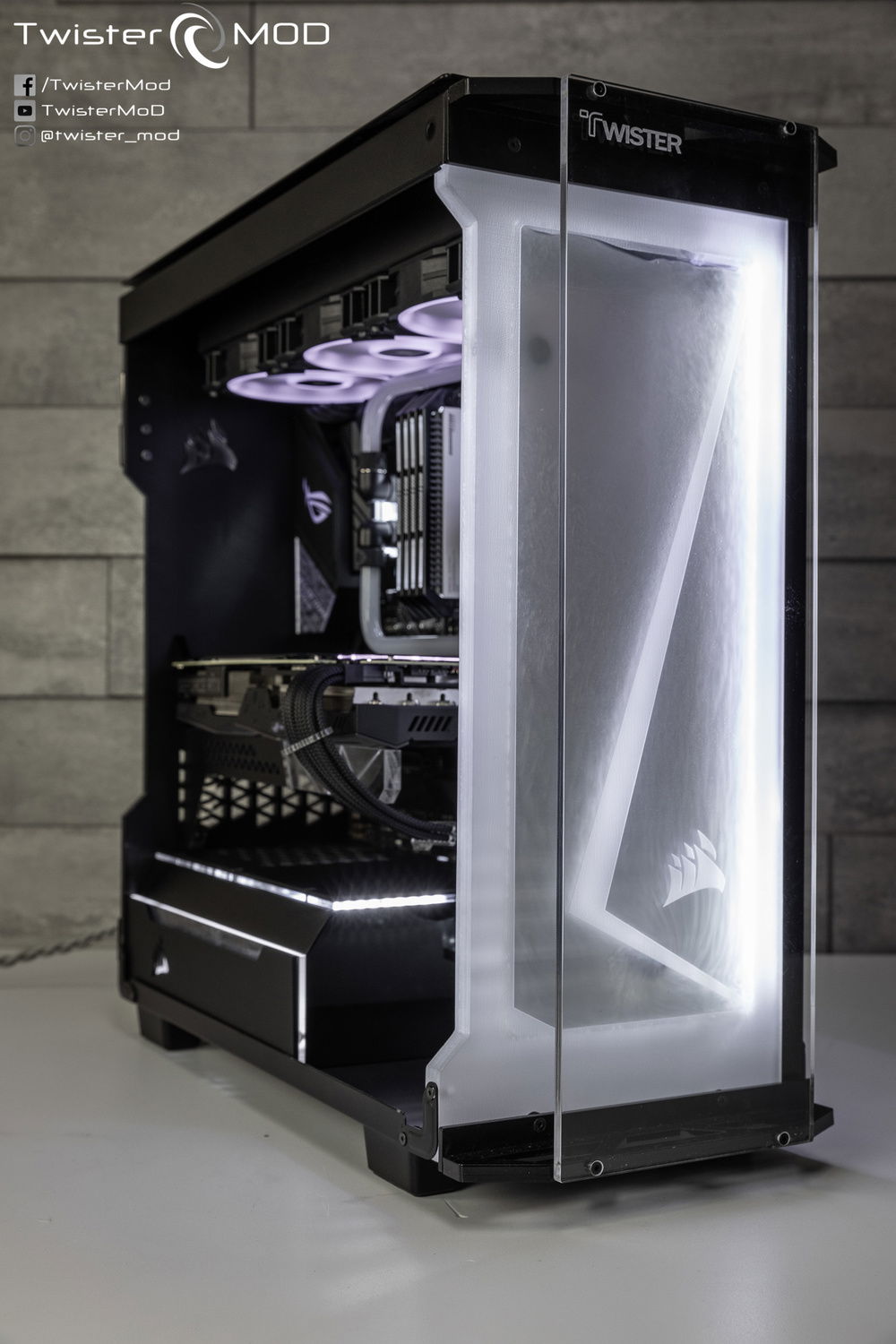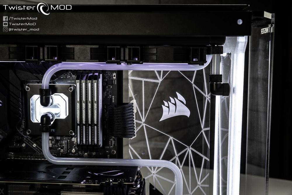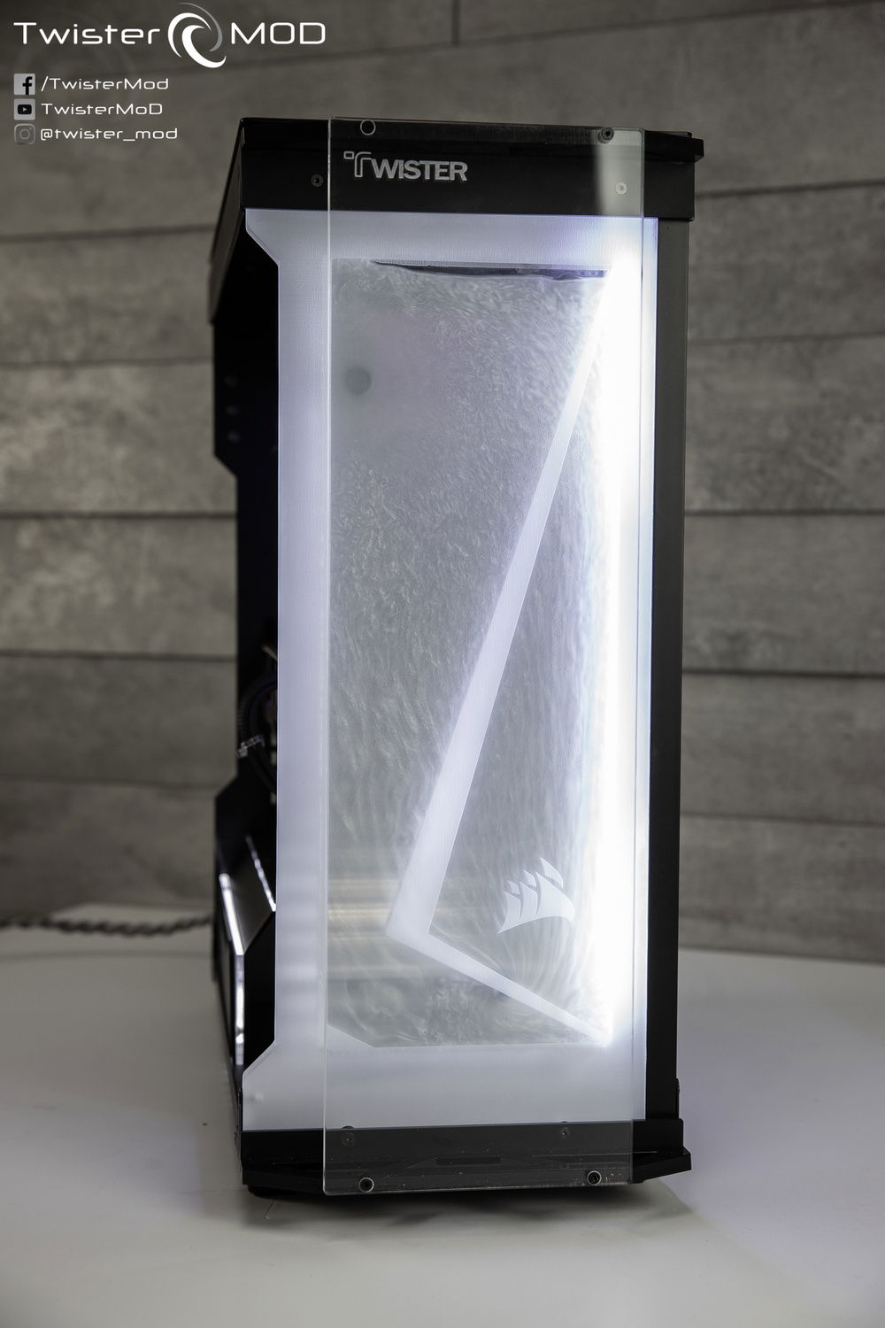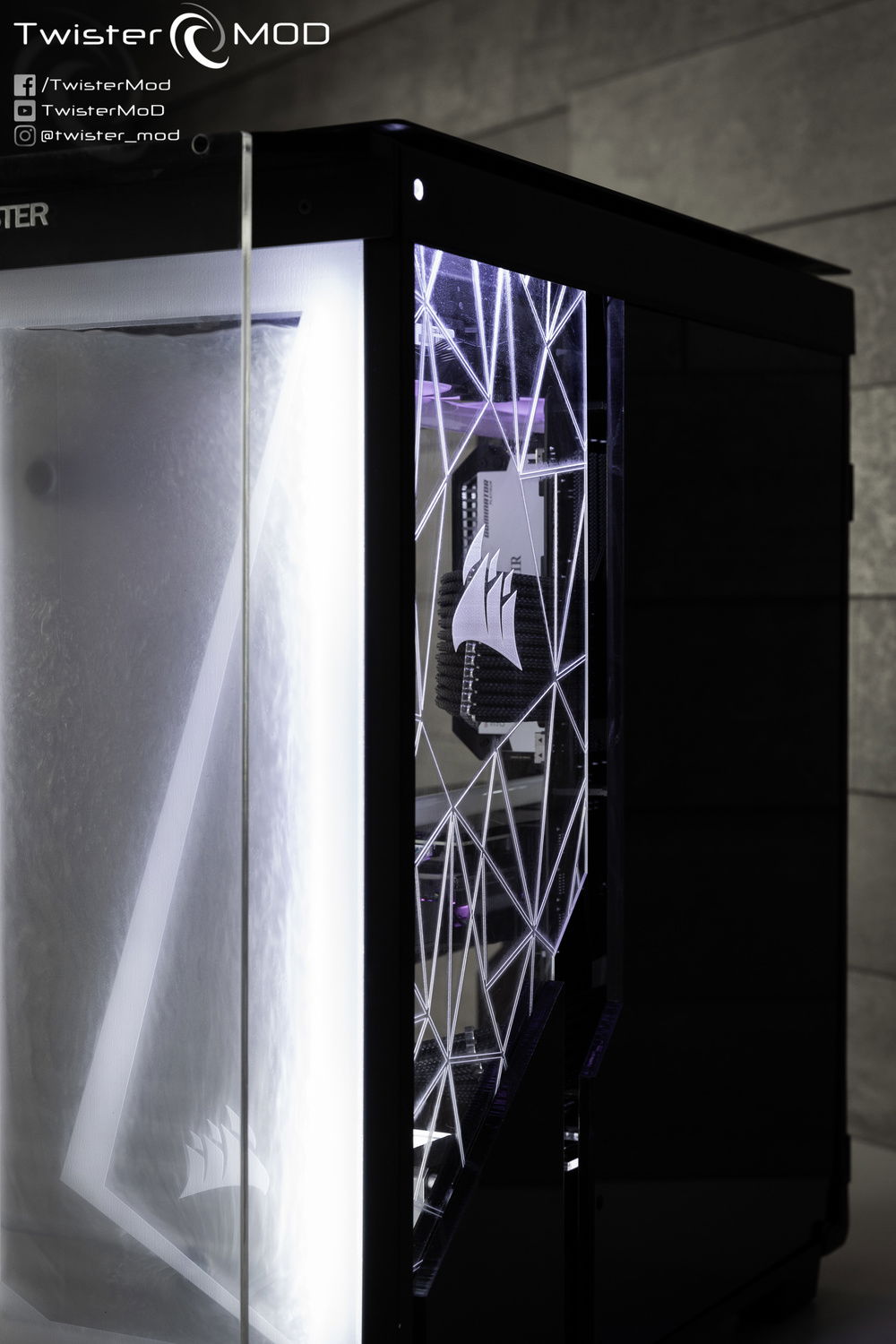 Inspired by the clean and elegant lines of the Corsair Obsidian 500D, the Twister Mod's Midnight enhances the already refined shapes by mixing transparencies and geometric engavings in a result of sure impact. The new Slate series cable combs and new aesthetic assets make their debut with geometries in line with the overall design, embellished with a completely handmade liquid tank, through which the effect of the new Twister Mod liquid stands out with awesome result.
