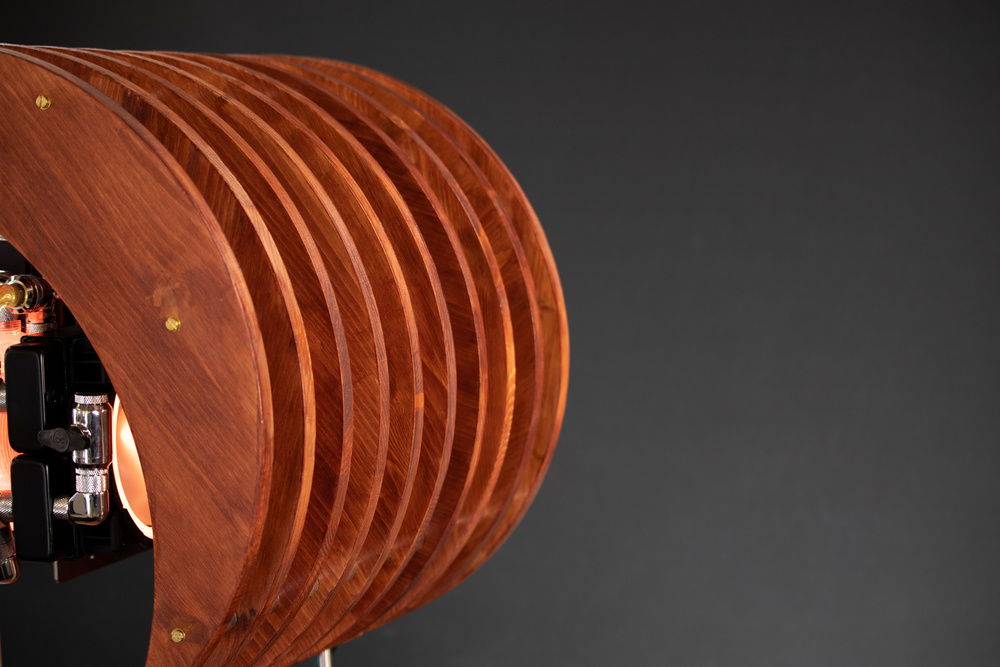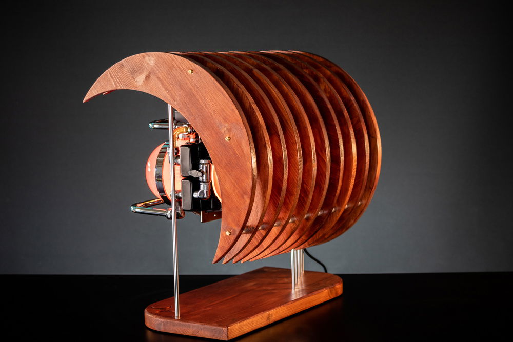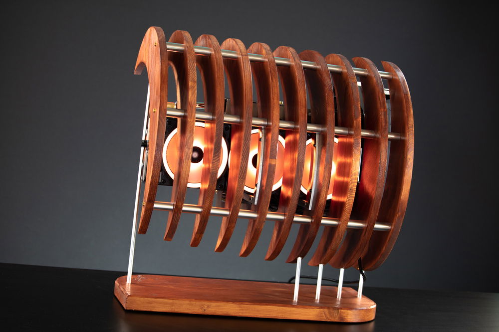 "Onda" is the Italian word for "wave". I had three major inspirations for the development of this project: wave, moon, skeleton. The structure is made out of crescent moons mounted to a constant offset that creates that wave look, and the way the crescents are spaced out and suspended from the base, reminds of those dinosaur skeletons that you can find in museums.