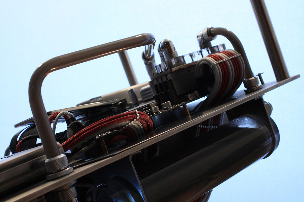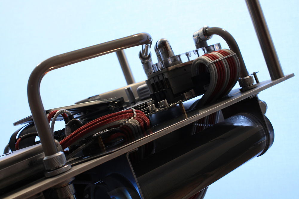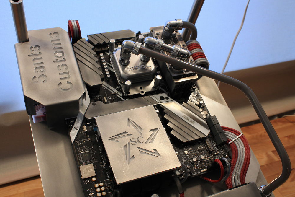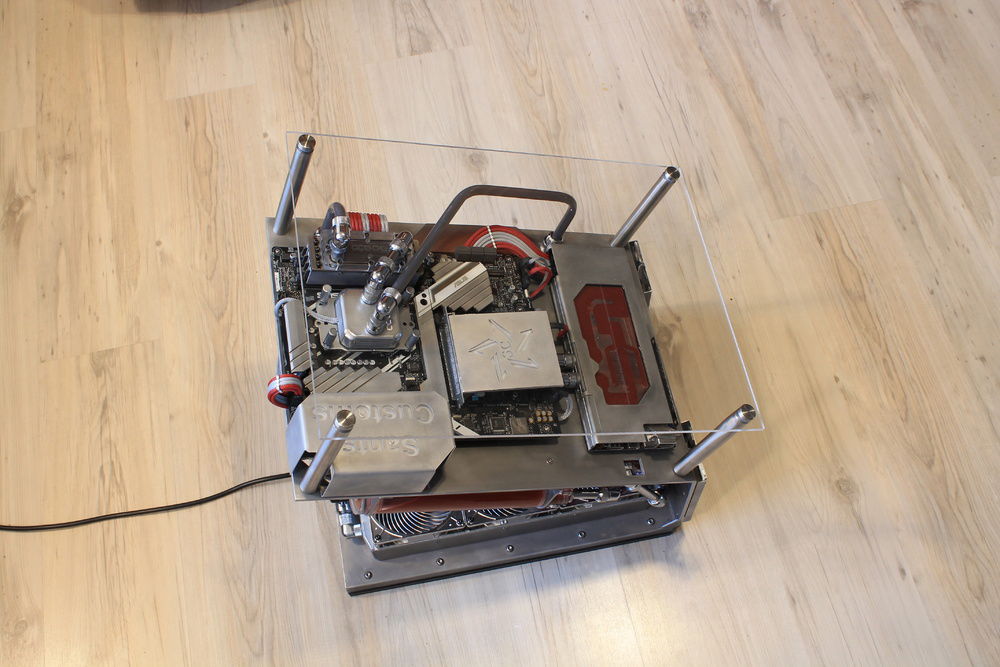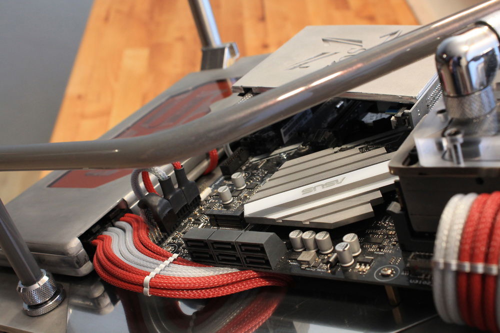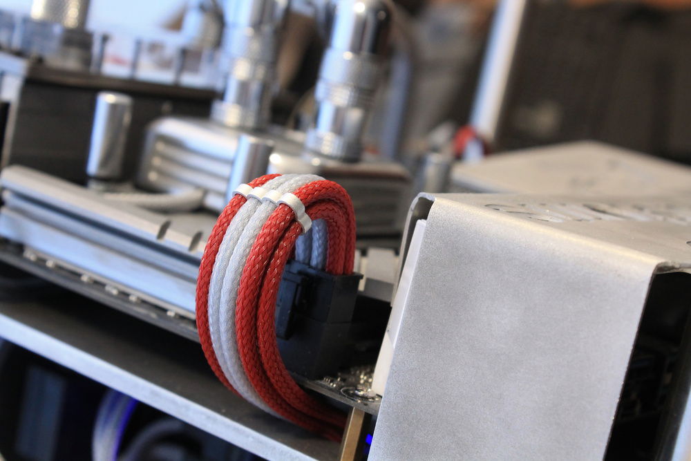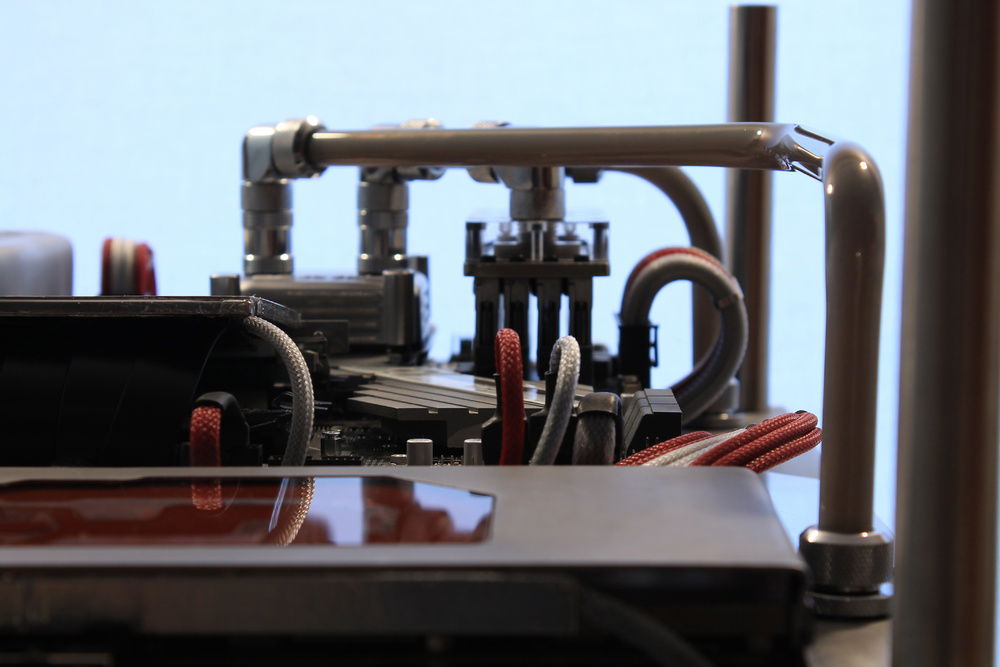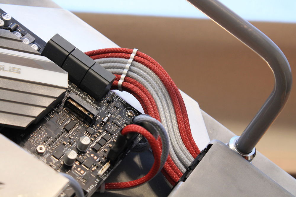 All the cutouts to the 5mm / 3/16 inch aluminium frame were done by hand. The cables are custom sleeved using MDPC-X's diamond red in combination with transparent sleeving.