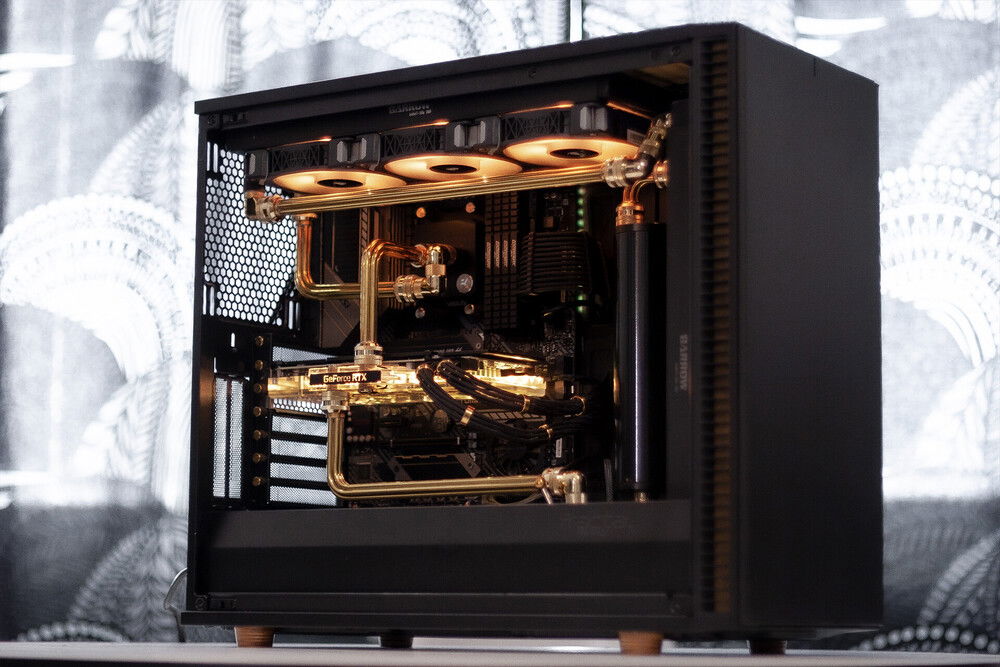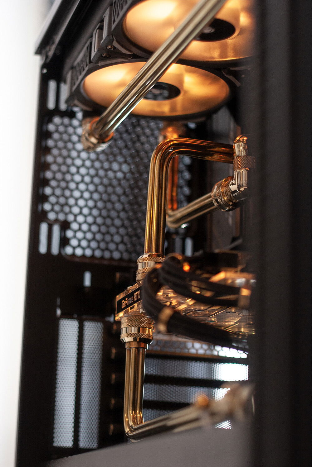 Polished brass build in Fractal Design's case. Each cooling line is made of five ⌀5mm pipes, hence the name V. Pipes are bent with custom made bending tool which had different radiuses for inner, outer and middle pipes.