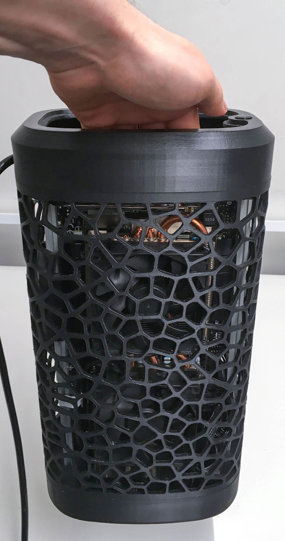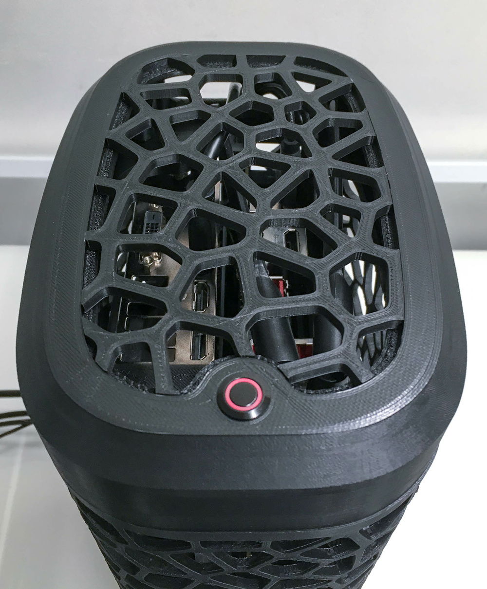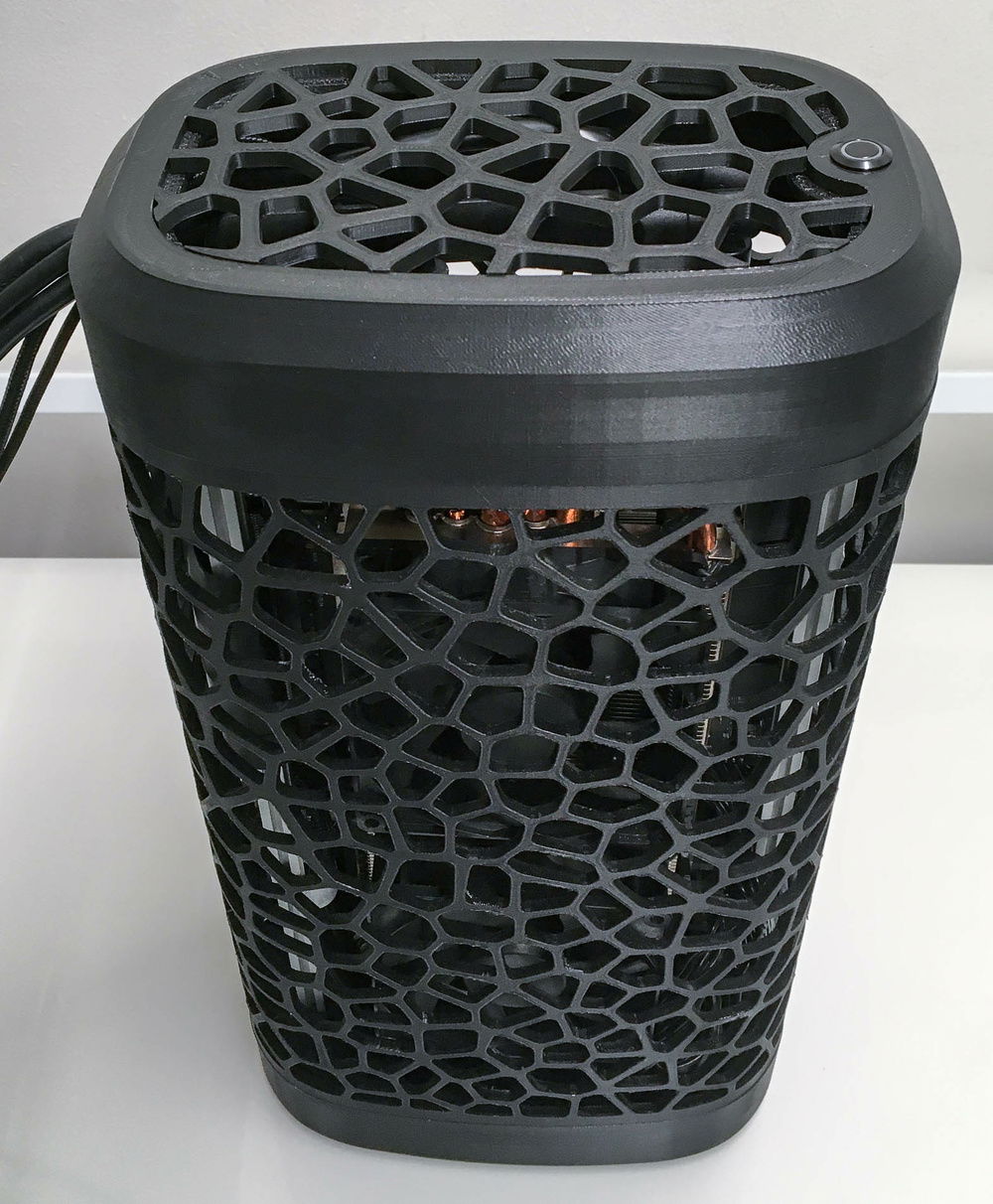 First try at a 3D printed organic shaped SFFPC. The idea came from the round build plate of a delta 3D printer and the minimal filament use of the voronoi pattern. Layout is vertical sandwich using a 30cm PCI-e riser cable and two aluminum extrusions that hold all components.