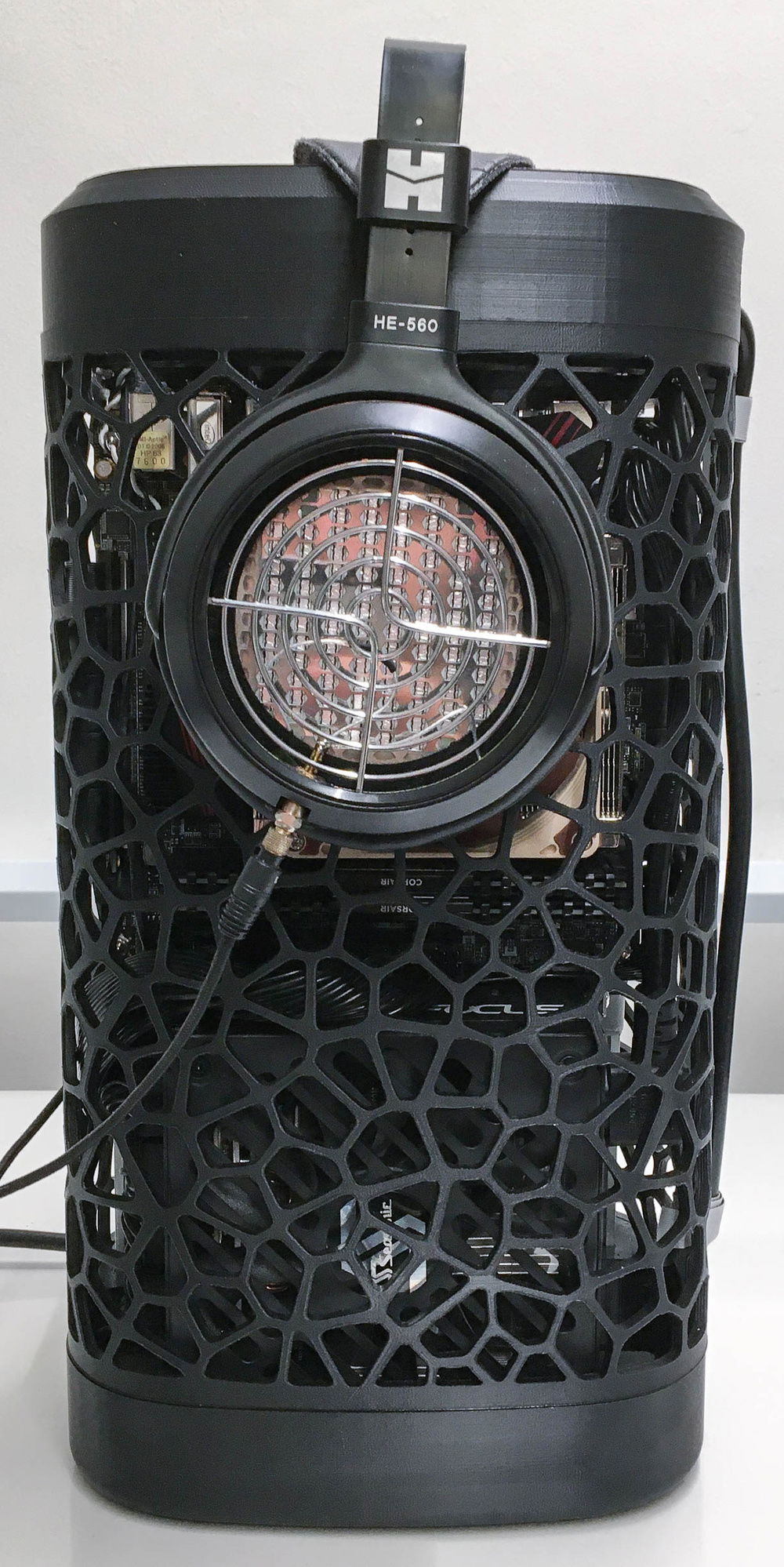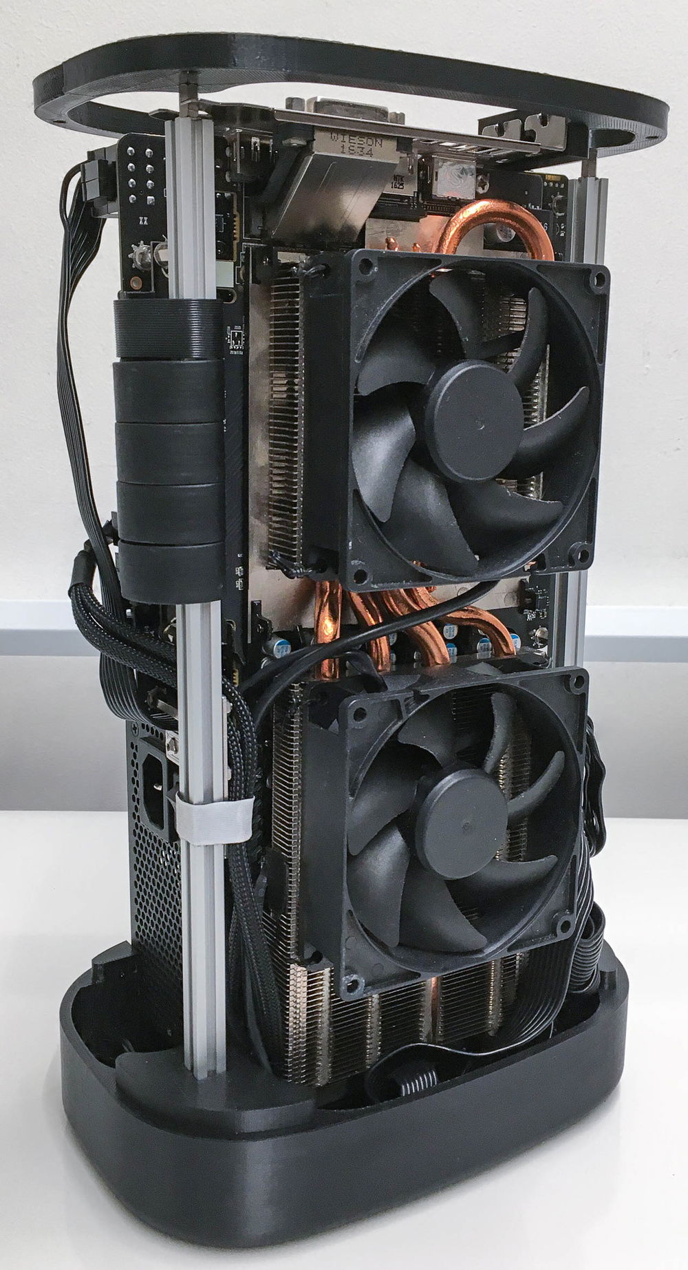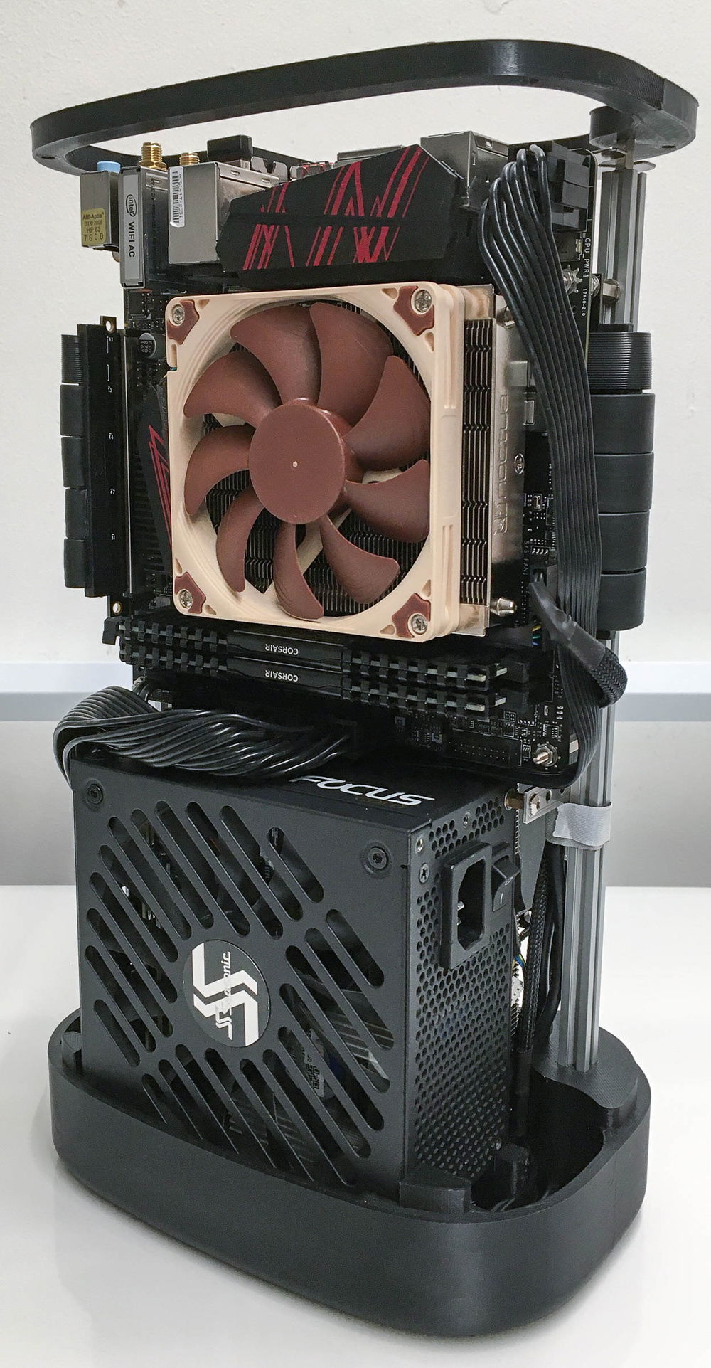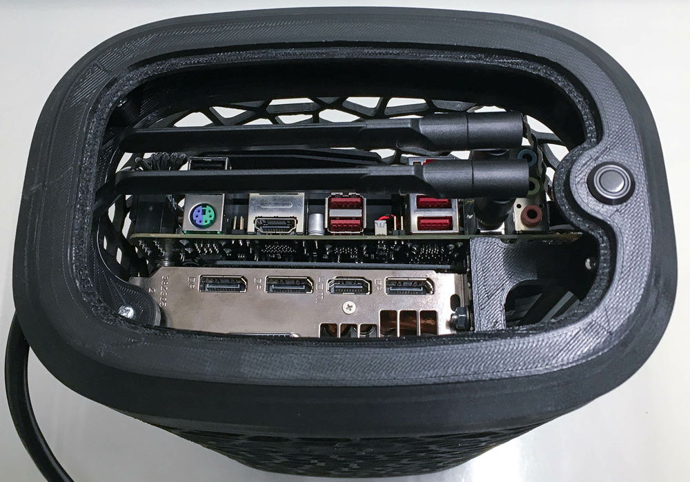 First try at a 3D printed organic shaped SFFPC. The idea came from the round build plate of a delta 3D printer and the minimal filament use of the voronoi pattern. Layout is vertical sandwich using a 30cm PCI-e riser cable and two aluminum extrusions that hold all components.