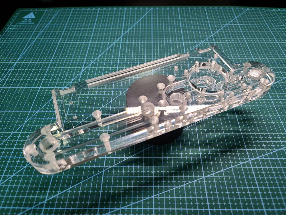 EK DDC3.2 pump with ICE pump heatsink mounted on custom made distro plate