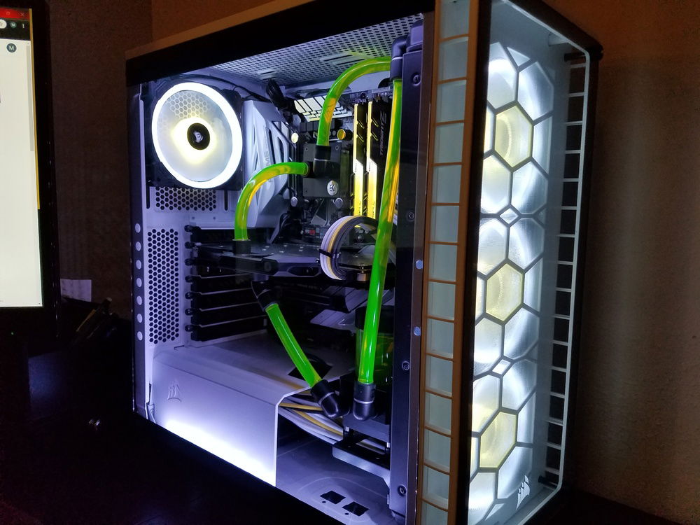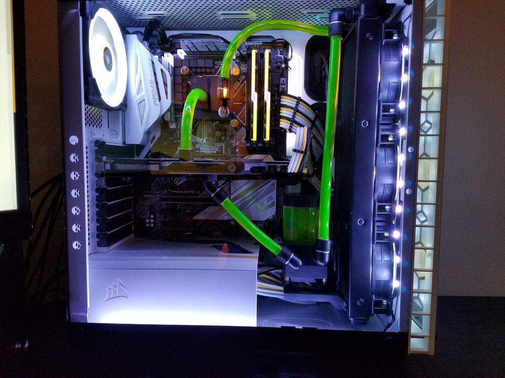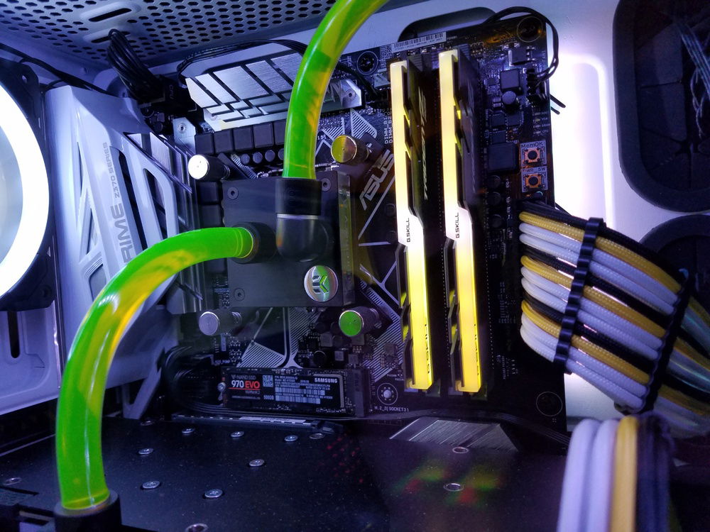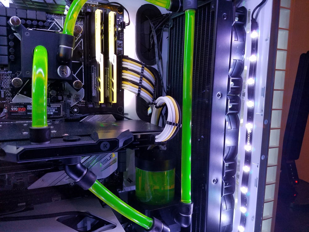 Project YellowJacket is my first endeavor in liquid cooling. I decided to go with the EK Fluid Gaming A360G full kit because it is had everything I needed in one unit (though I would recommend purchasing some aluminum adapter fittings to make pipe routing easier). YellowJacket is also my first attempt to make a "showcase" pc, complete with custom cables from Cablemod. The corsair 460x Crystal case is an absolutely beautiful case, though a bit snug for a full water cooling loop. All in all I am very proud of this pc, but I would welcome any constructive criticism to me help improve as a builder.