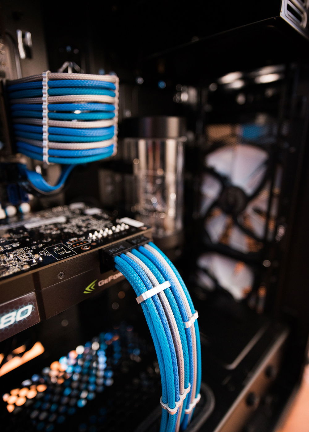 The HX750i is perfect for this build. It replaced my old HX1000 from 2009 for this build. It fits the color scheme, and it also comes fully modular. I picked this particular power supply because I used the HX1000i on Project-ARK and was familiar with the pin-out and cables for sleeving. Using this power supply made sleeving much easier. Corsair's Zero Fan mode is awesome. Keeps it nice and quiet and only kicks on when needed. Plus, dat efficiency. Only thing that annoys me about Corsair's current HX line is how difficult it is to get the plugs to snap into the sockets. Even removing them is a pain.