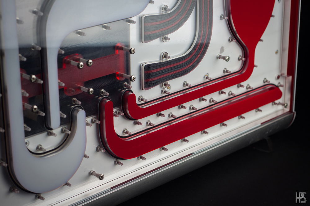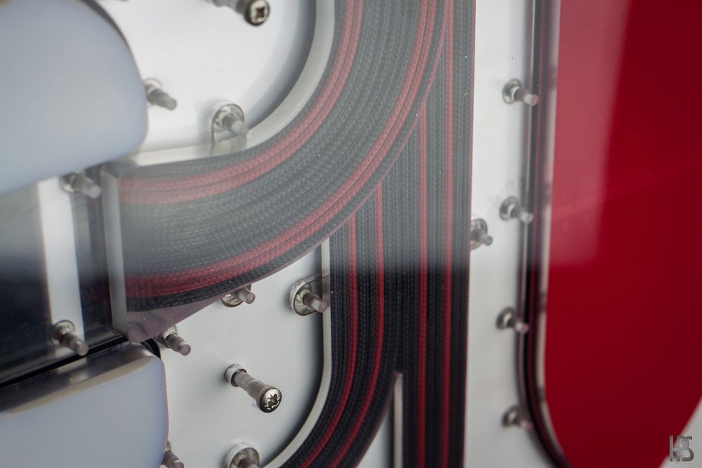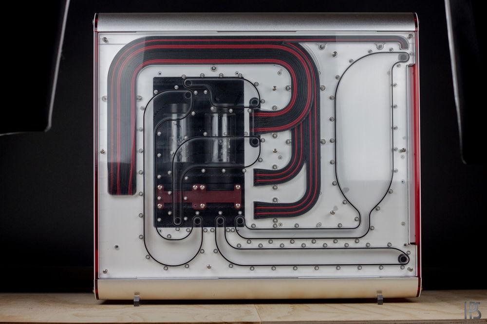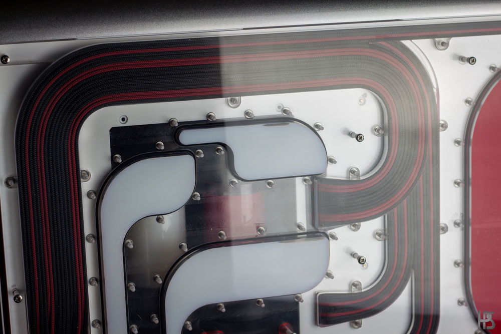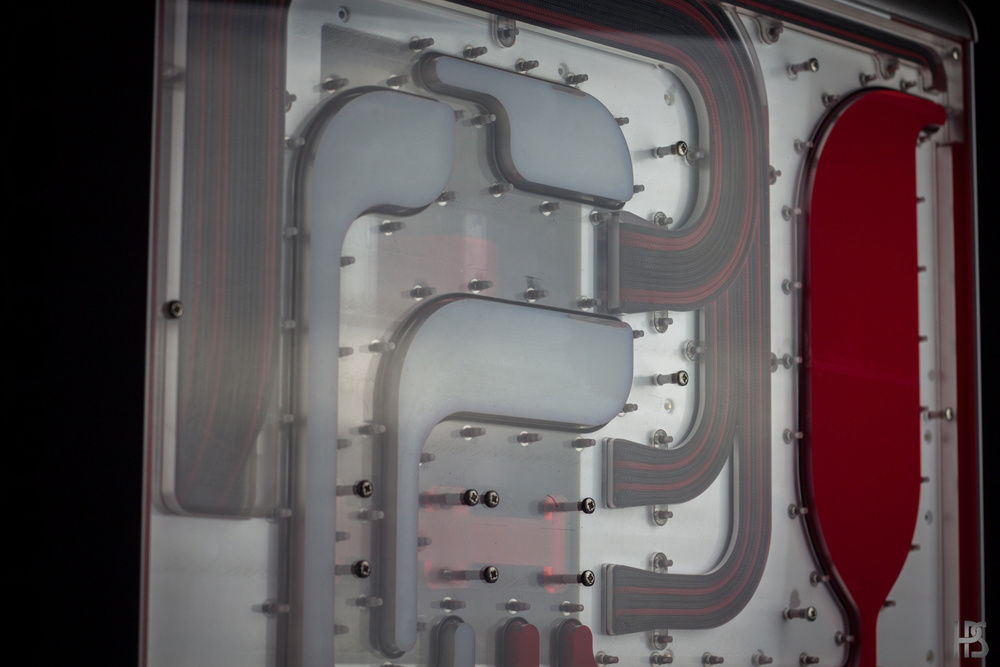 The side panel is made from a 25 mm thick acrylic plate that has been CNC machined to make room for the watercooilng and cables.