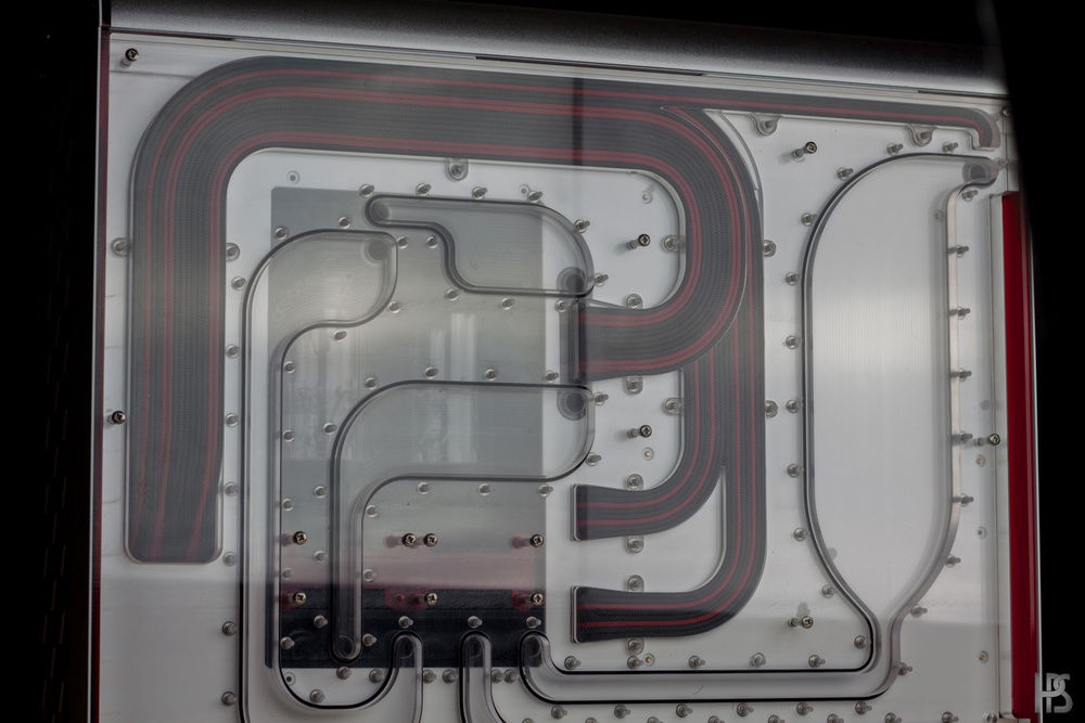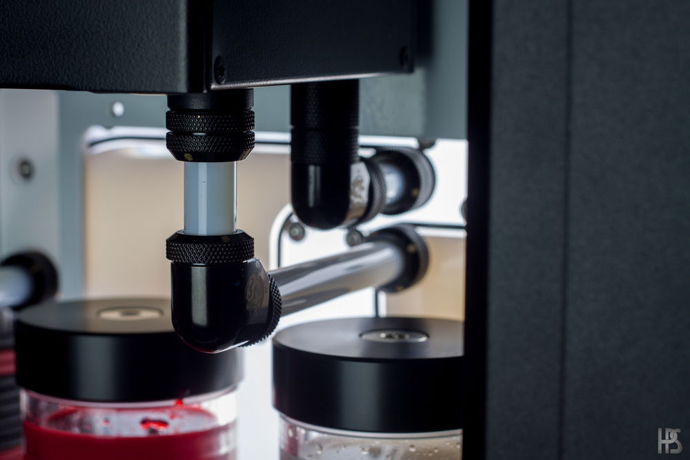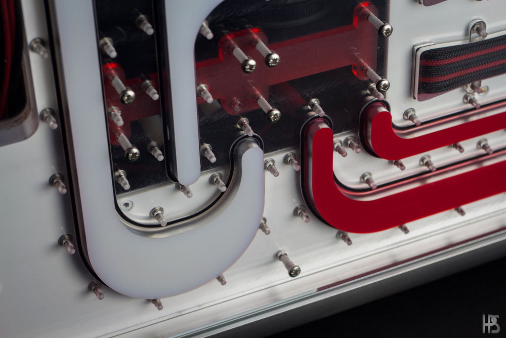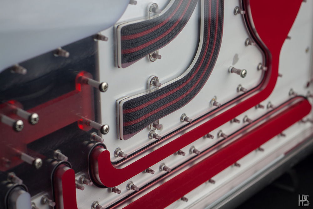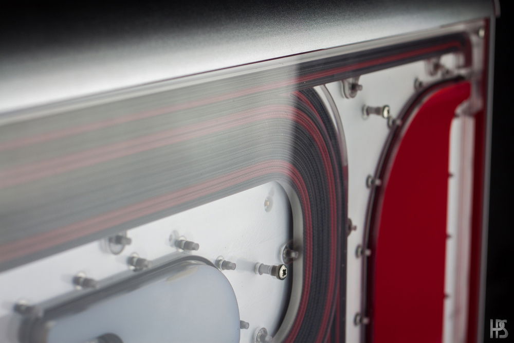 The side panel is made from a 25 mm thick acrylic plate that has been CNC machined to make room for the watercooilng and cables.