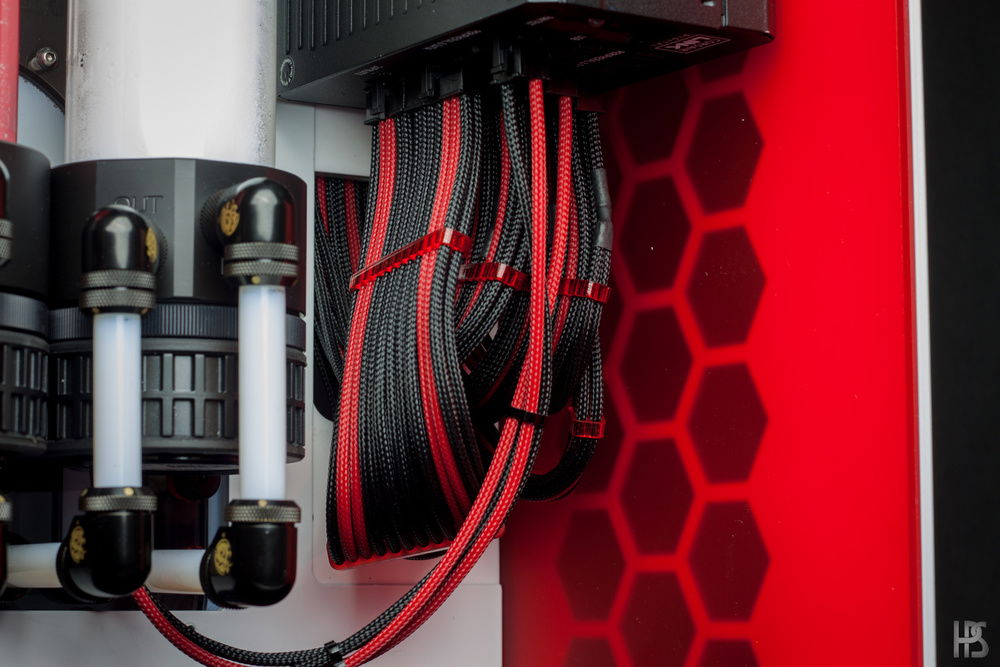 For this build I made a complete sidepanel with integrated cable routing and water routing channels. All cables beside the pump cables runs into this plate, and is neatly routed to the PSU.