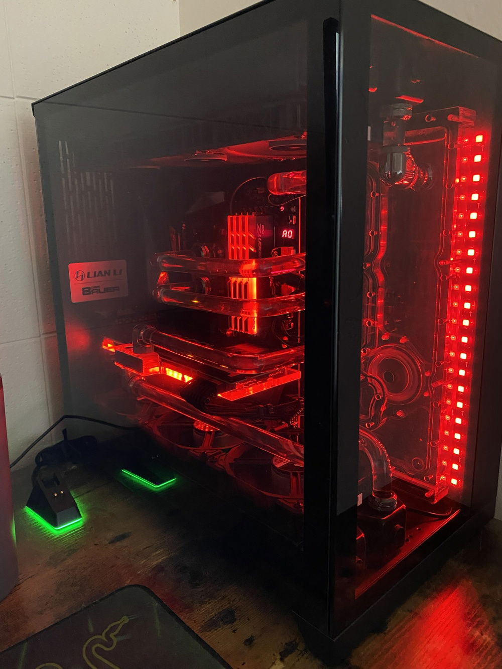 Lian Li PC011 Dynamic case, AMD 3900X CPU, Gigabyte X570 Aorus Master Motherboard, EVGA 2080ti, 32 GB TrridentZ RAM. 1TB Samsung M.2 SSD for OS, 2TB Intel M.2 SSD for games, 4TB WD HDD for storage. Custom loop with D5 pump Bitspower fittings, Alphacool CPU and GPU blocks, 2 Alphacool 360 radiators. Custom plexi distro plate 6 Corsair 120 fans. Seasonic Prime 850W Platinum power supply