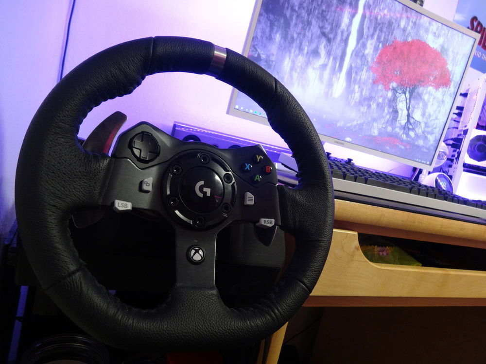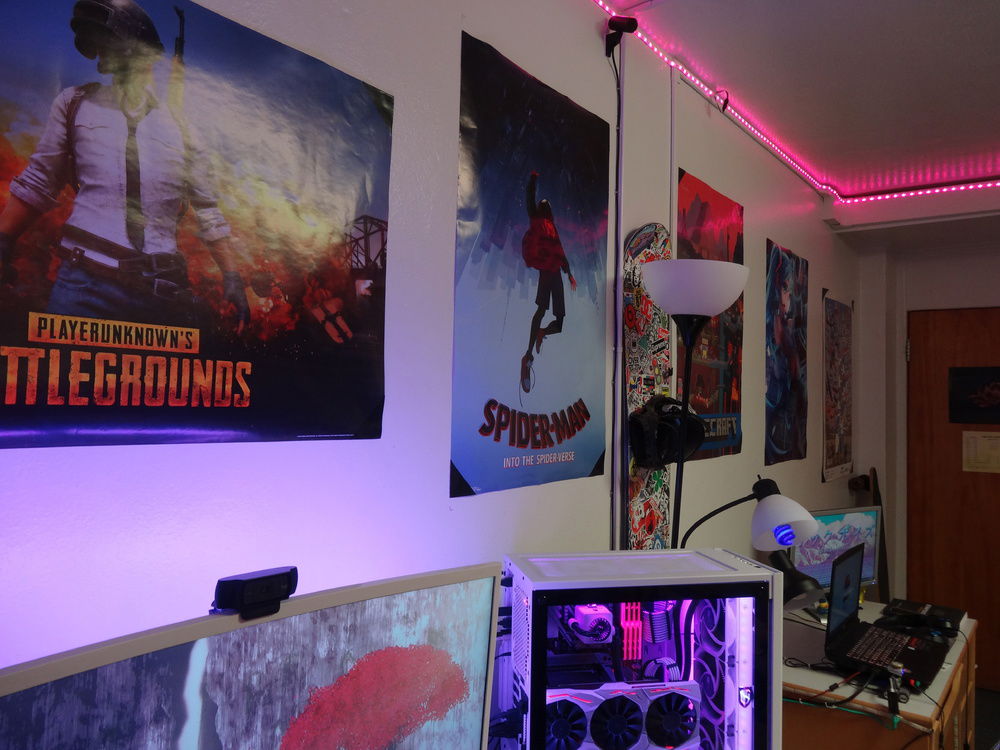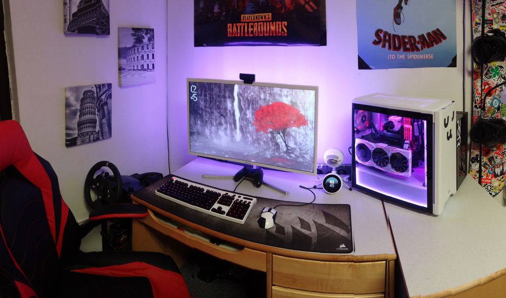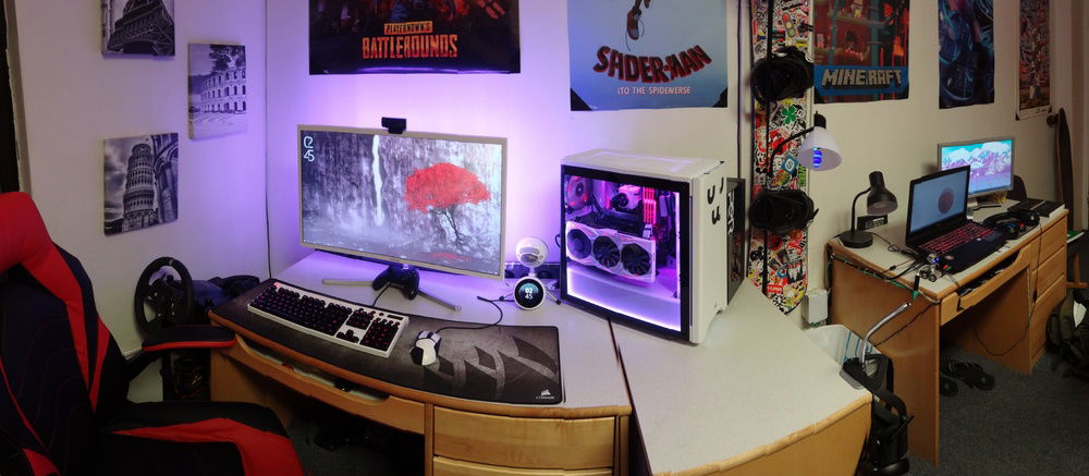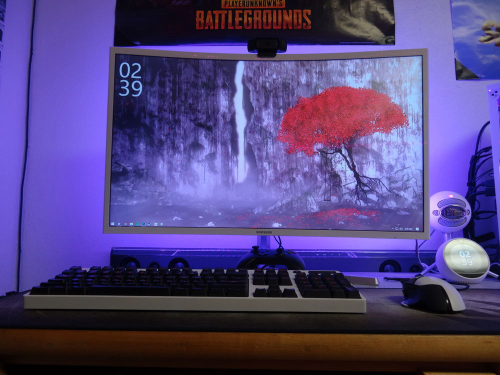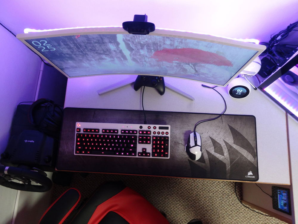 Monitor: Samsung C32F397FWN Curved 1920x1080 Keyboard: Logitech G810 Orion Spectrum (Painted white) Mouse: Logitech G502 Proteus Core (Painted white) Webcam: Logitech C920 1080p Mousepad: Corsair MM300 Microphone: Blue Snowball iCE Clock: Amazon Echo Spot (white) Speakers: Samsung Soundbar with Subwoofer (too lazy to try to figure out which one) Racing Wheel/Pedals: Logitech G920 Driving Force Flight Sim Hardware: Logitech Pro-Flight Yoke + Throttle + Rudder Pedals VR System: Oculus Rift CV1 with 2 wall mounted sensors Spotify Tablet: LG-V410 Headphones: Kingston Hyper-X Cloud Core 1 Controller: Xbox One Wireless Controller + Xbox 360 Wired Controller