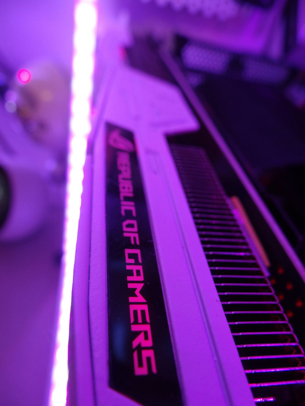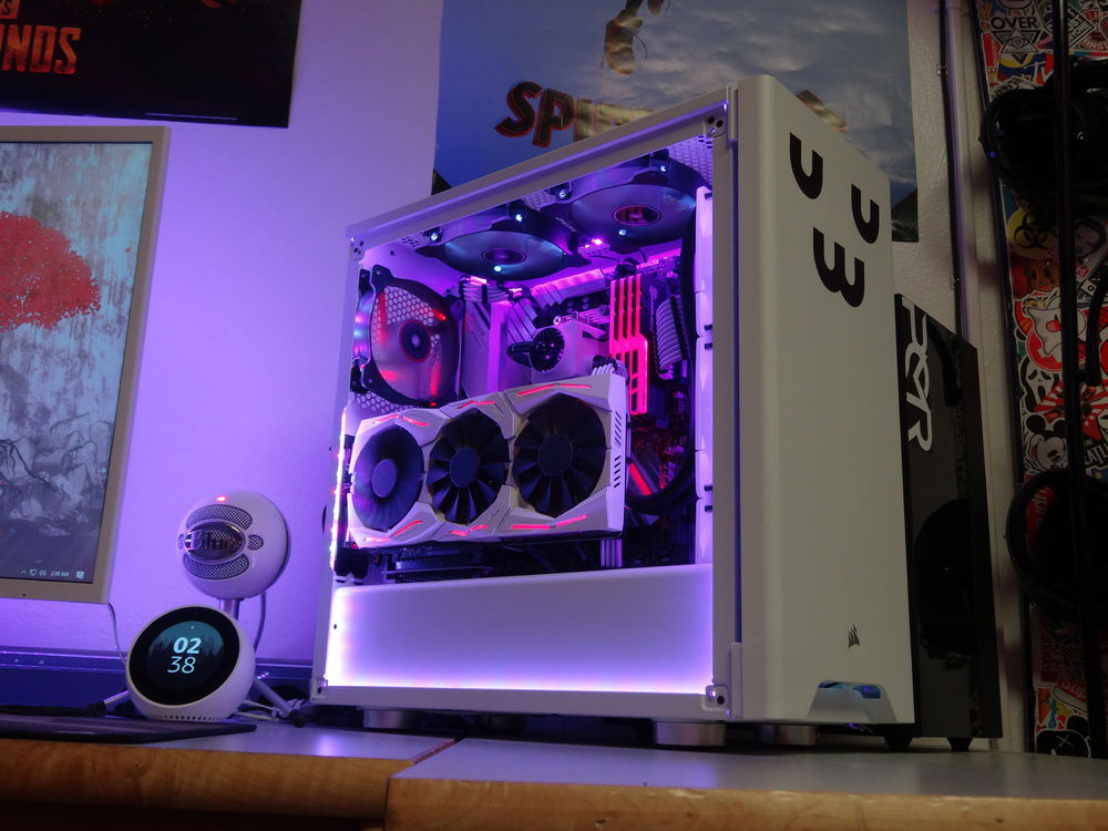 CPU: AMD Ryzen 5 2600 @4.00ghz GPU: Asus ROG GTX 1070 Strix Gaming (Painted white) RAM: 32gb (4x8gb) DDR4 G.Skill TridentZ RGB 3200mhz Mobo: Asus Prime X470-Pro Storage: Samsung 970 Evo Plus 1tb NVME SSD Storage: Samsung 630 256gb SSD Storage: SPCC 128gb SSD Storage: WD Black 1tb HDD Storage: Seagate 500gb HDD PSU: Corsair CX750M 750W CPU Cooler: DeepCool Captain EX360 RGB White Expansion Card: Inatek Superspeed PCIE-USB3.0 Case: Corsair Carbide 275R White w/ tempered glass Cable Extensions: EZDIY-FAB white extension kit Fans: 3x Corsair AF120 (2x white, 1x red) LED Strip: LDH 16.4ft RGBW