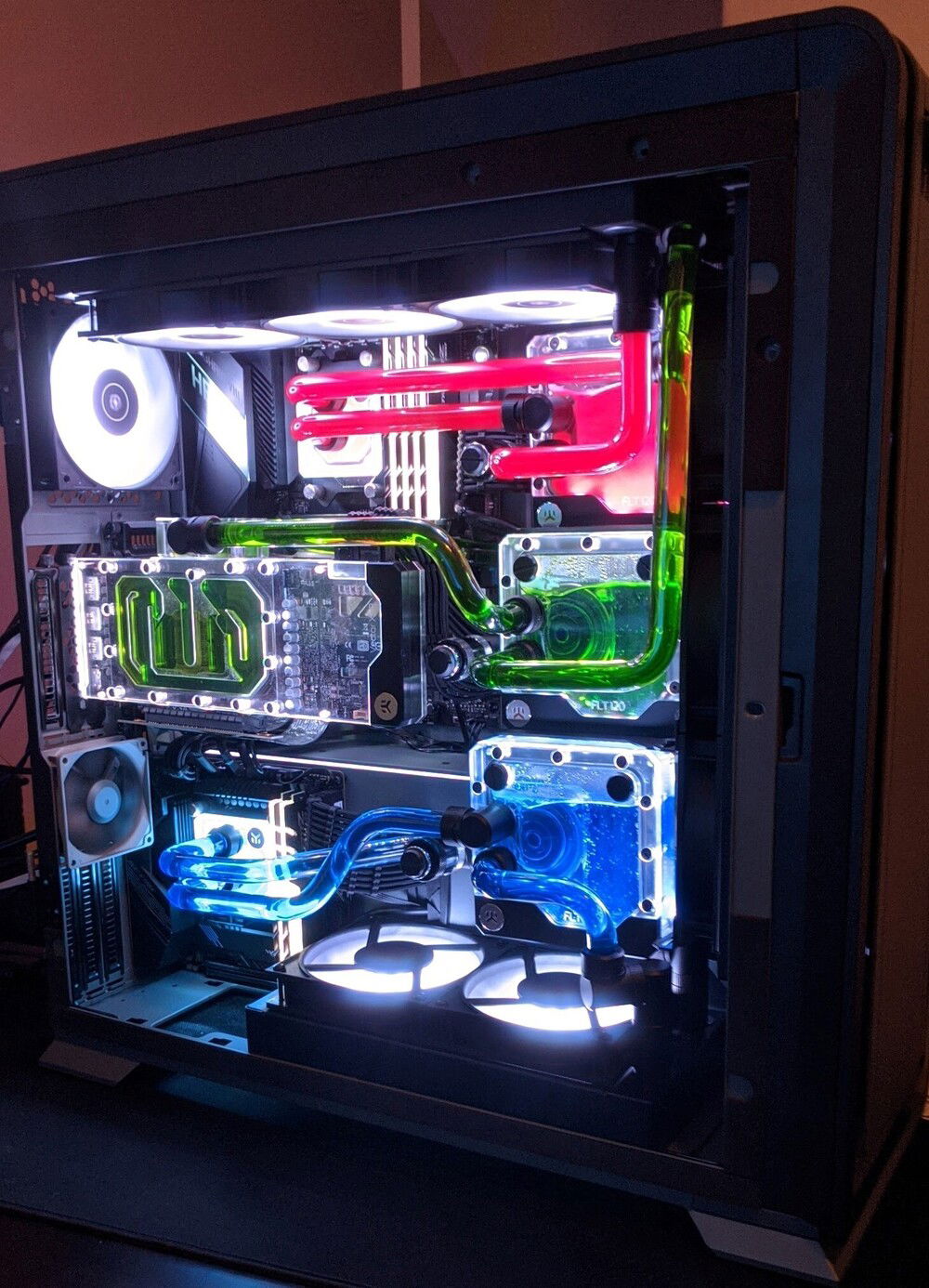 R.G.B. Build consists of three idependent loops, wanted to keep the theme RGB with using R=AMD G=NVIDIA B=Intel and used red, green and blue coolant from Alphacool Eiswasser Crystal. Appreciate checking out the build and may your build be blessed with no leaks, no issues and all the frames.