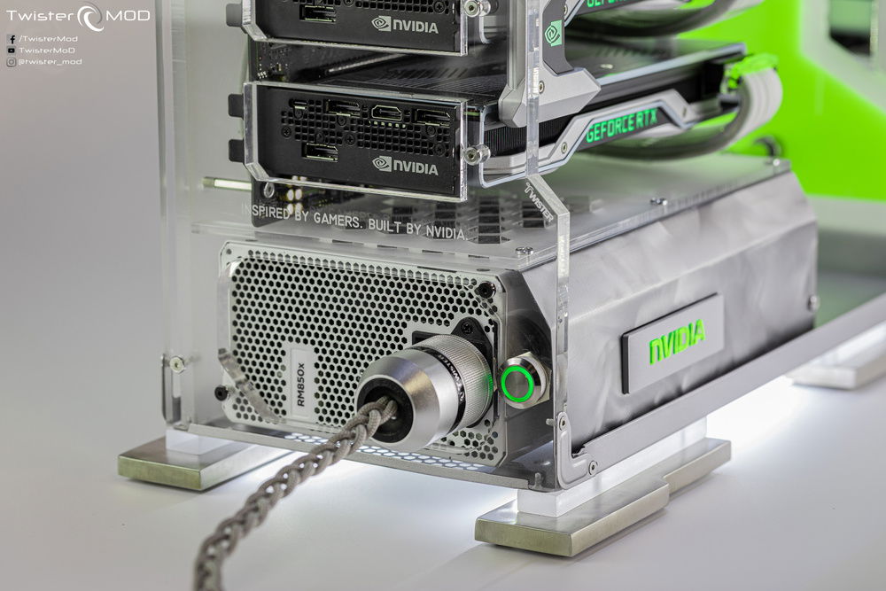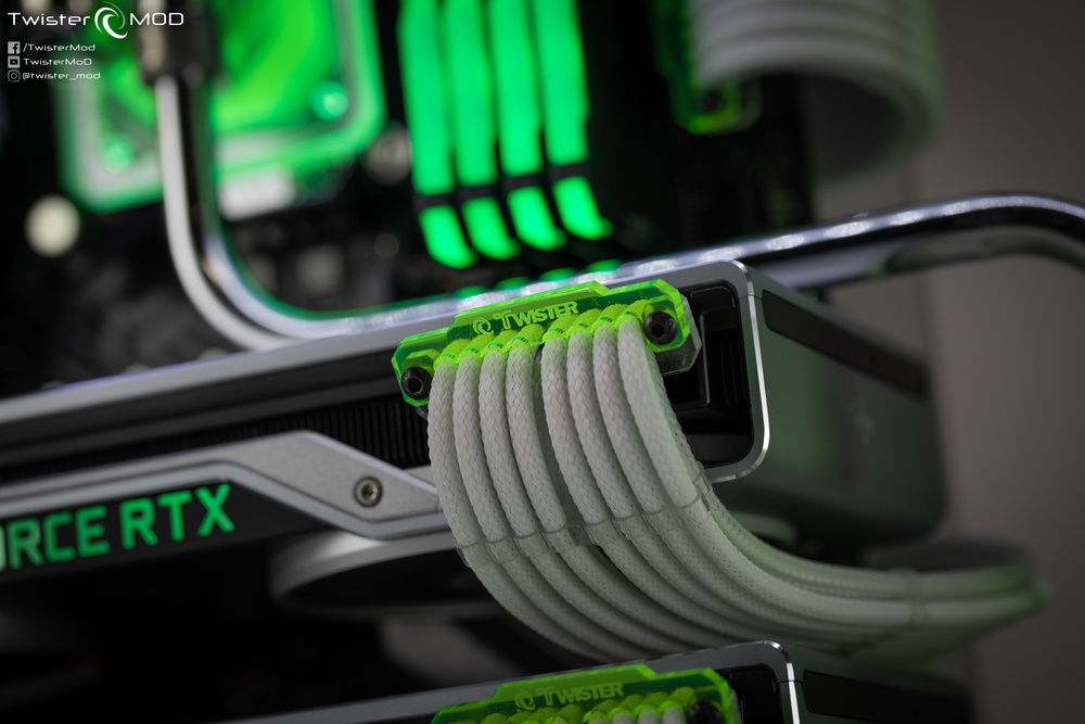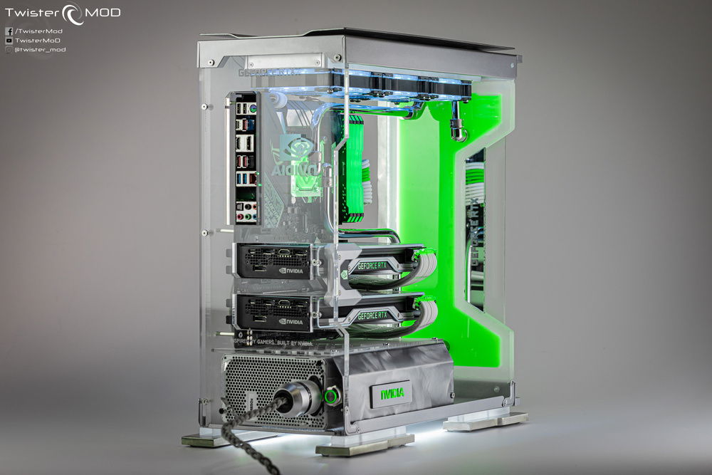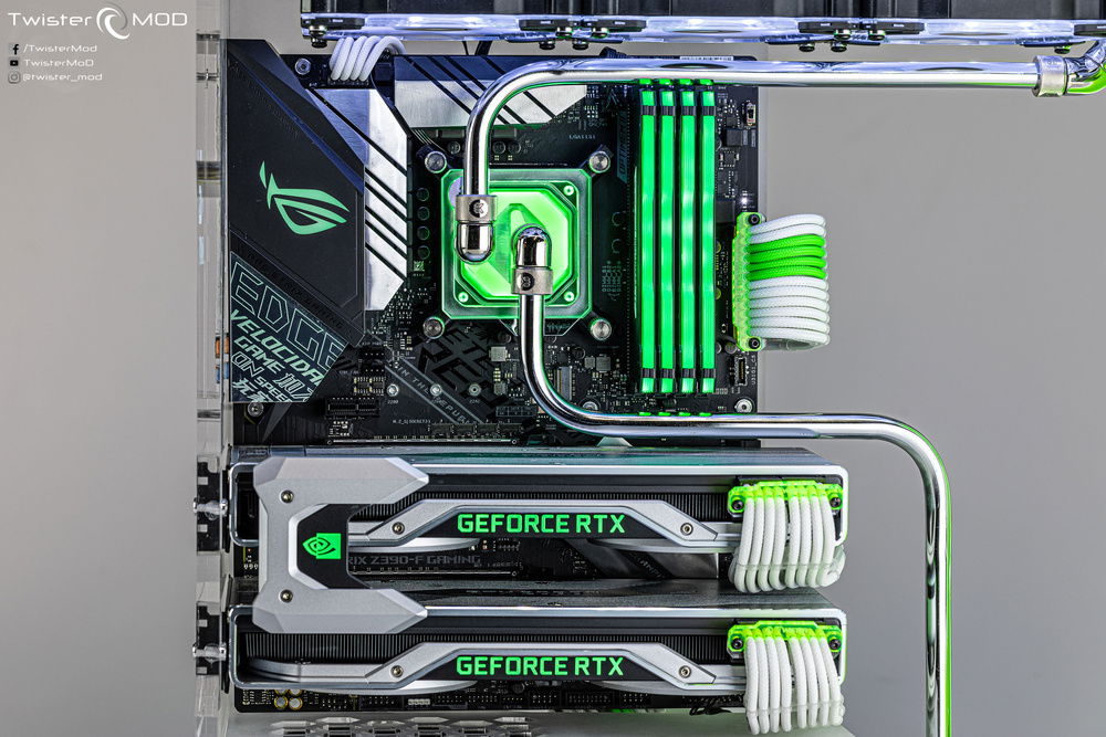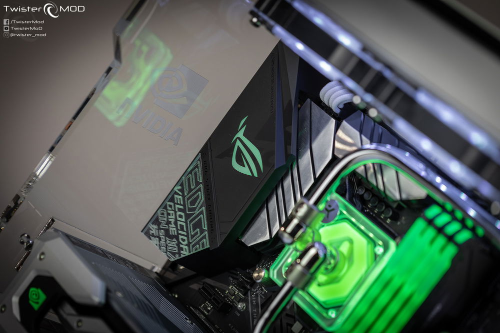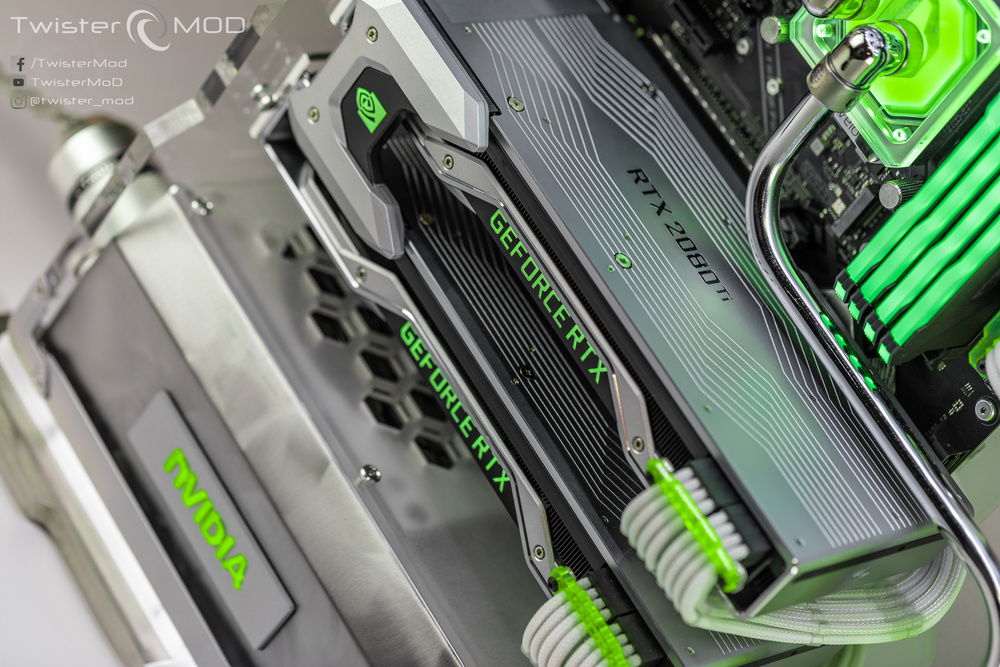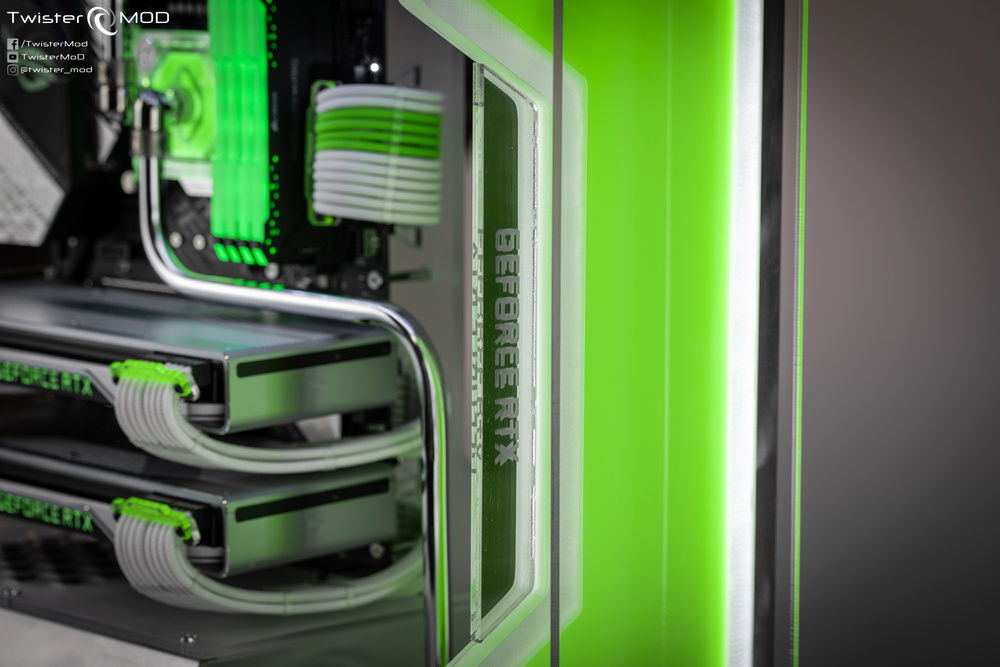 Twister Mod's Radioactive RTX condenses the concept of minimal design to emphasize the aesthetics of the new RTX 2080Ti Founders Edition by combining simple and essential lines with the classic NVIDIA green color pattern. The Obsidian 500D by Corsair is reduced to the minimum in this mod that leaves the internal hardware and custom loop entirely customized the task to amaze and give aesthetic elegance to another flagship work for Daniel "Twister" Bolognesi.