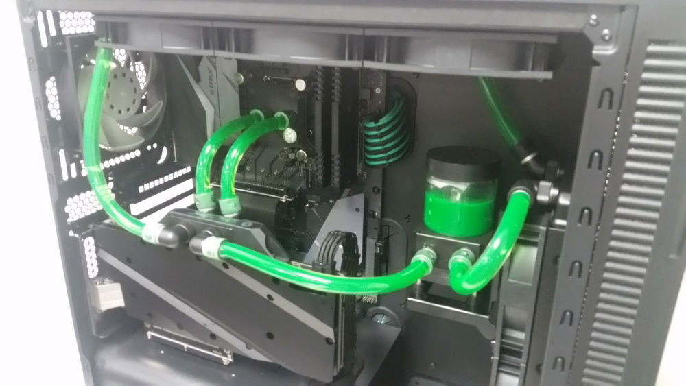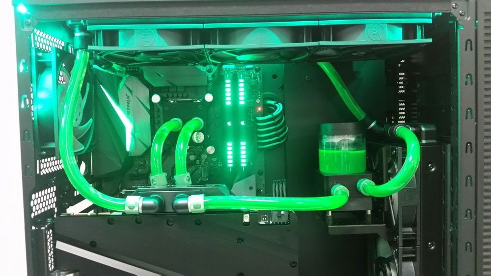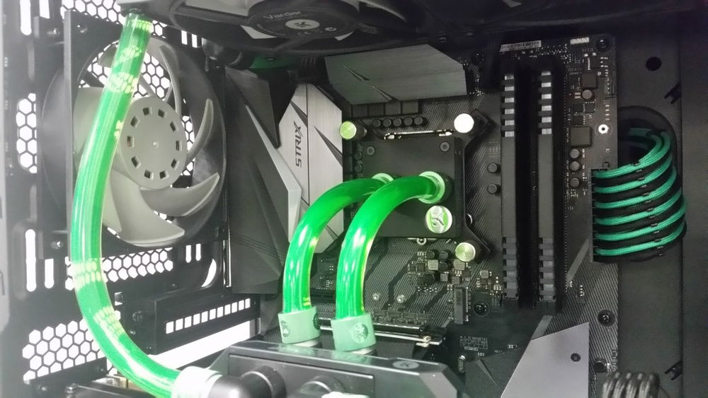So we took a Thermaltake F31 and put a bunch of good stuff in it and made it basically blacked out with green accents. The back wall of the F31 is an ugly hot mess when you remove all the cages so we used black vinyl skinned acrylic to clean it up. The loop is the EK Fluid Gaming and I'm so impressed with it I may never go back to copper again. We were able to get the 8700k to 5.0 but it took all of 1.4v and the extra heat didn't warrant the the extra Hz so it is 4.8 24/7, but not delidded either. Main thing, he is happy, and we plan to add some acrylic "accents" to it at some point, but time always gets away from you with these builds.