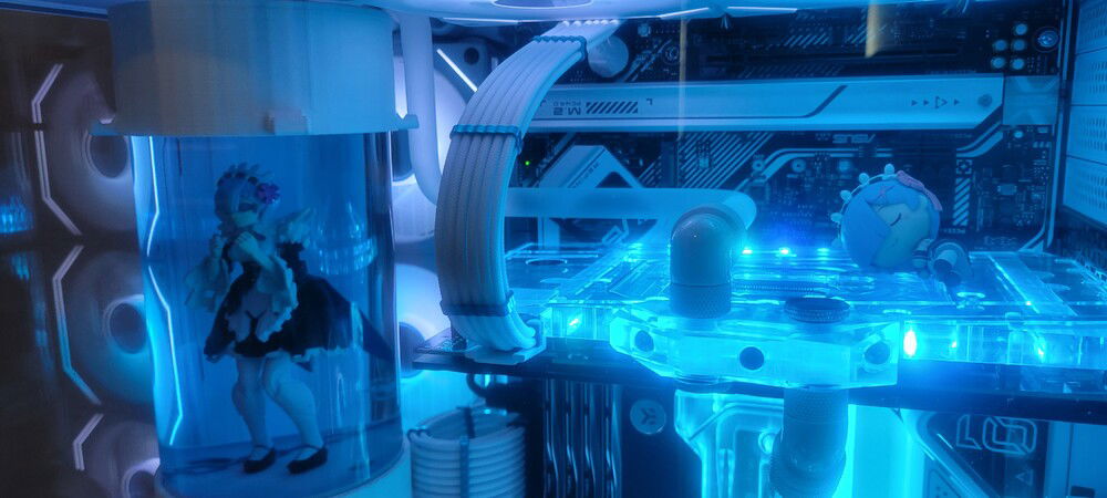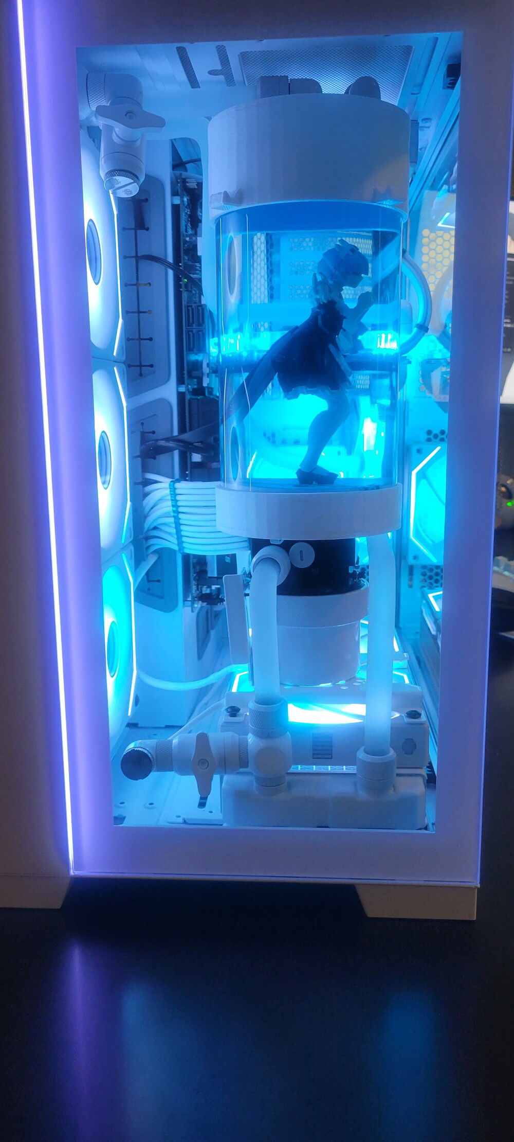 Custom-made reservoir. Acrylic cylinder welded closed with custom top and bottom. 3D printed (white) caps on the top and bottom.