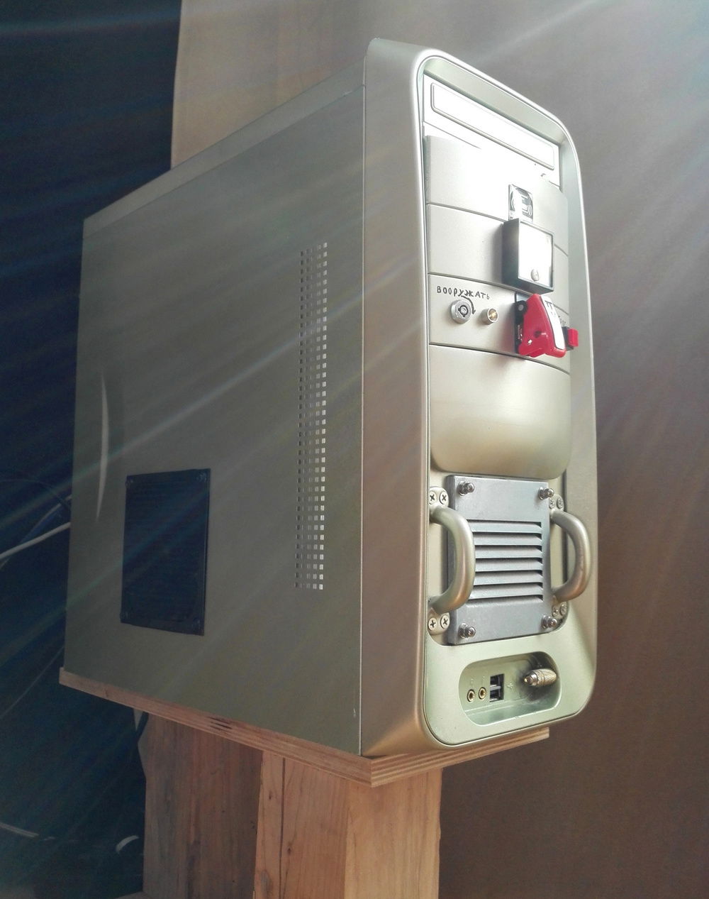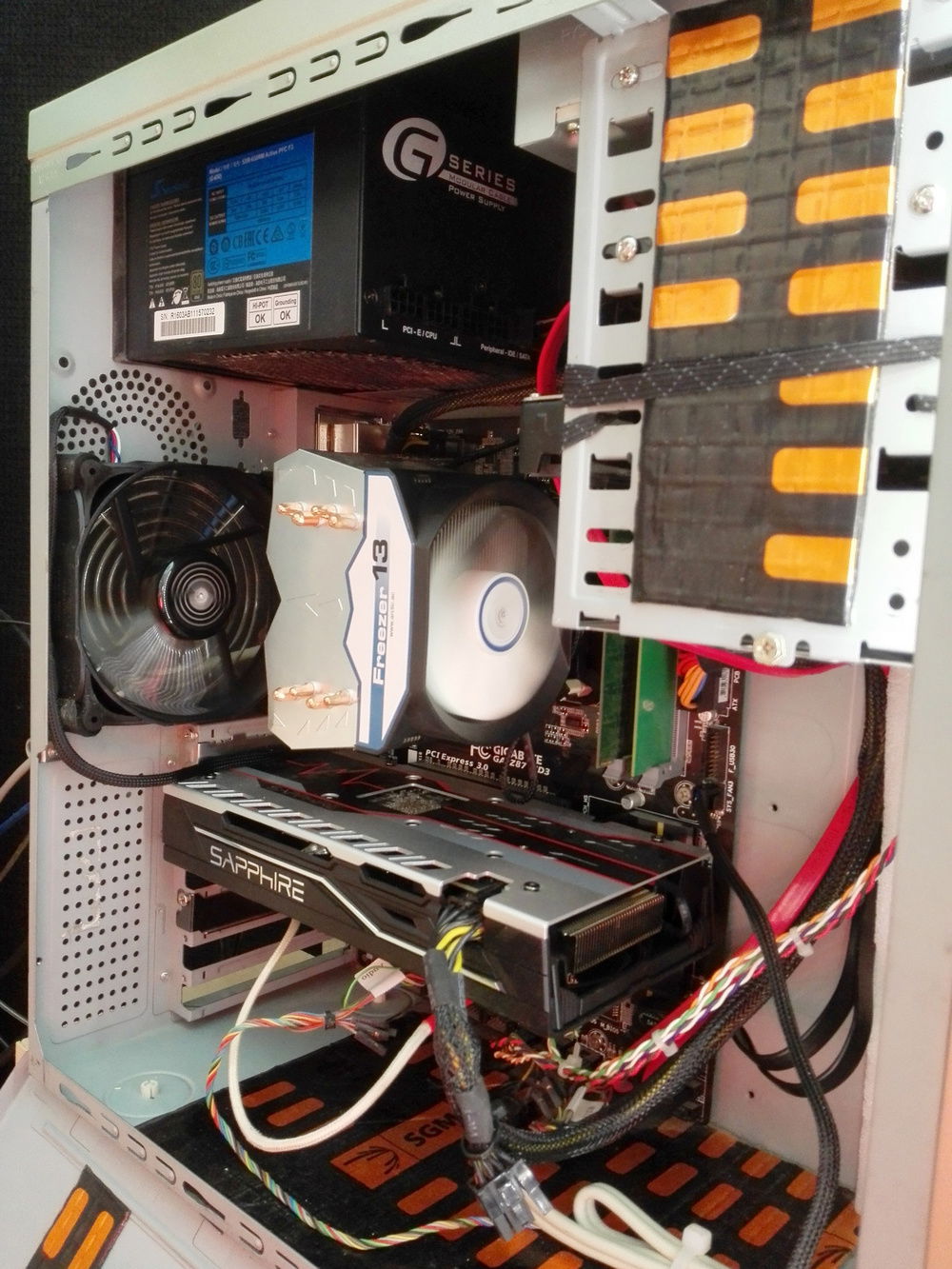 An old budget quiet overclocker build from 2014 (I recently replaced the old malfunctioning Radeon HD 7770 GPU with RX 570). Case salvaged from a prebuilt PC from mid-'00s, it's rather nice thick steel with no sharp edges. I modded it to my needs - 120 mm fan mounts, bitumen pads and closed-cell foam for noise control, a lot of filling, sanding and painting. Naturally the case has almost no options for cable management, but no window, so not a big issue for me. Build theme is after old 1960-s Soviet nuclear technology - think nuclear submarines, ICBM-s, breeder reactors. Pentium G3258 running at 4,5 GHz; DDR3 1333 MHz CL 9-9-9-27 memory at 2000 MHz CL 11-11-11-29; GPU at 1325 MHz boost VRAM at 1950 MHz.