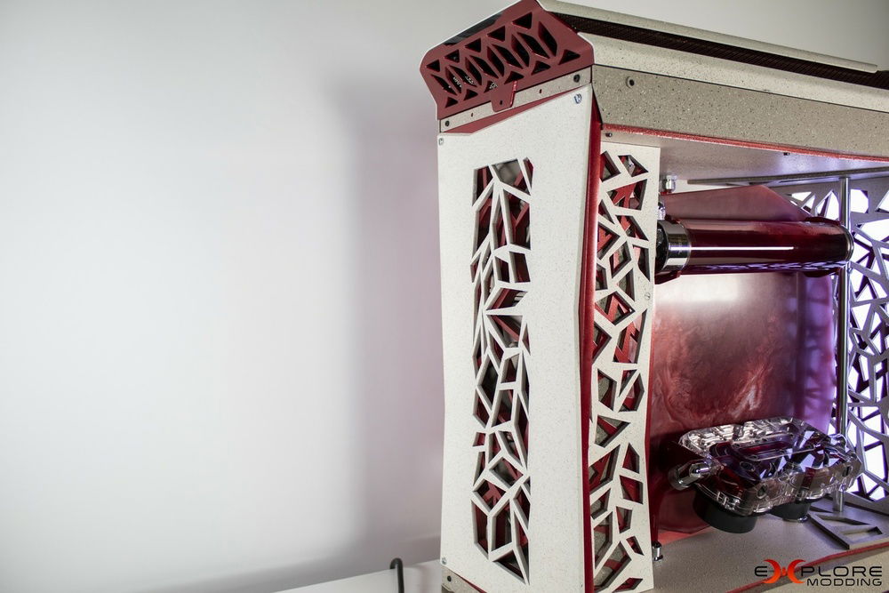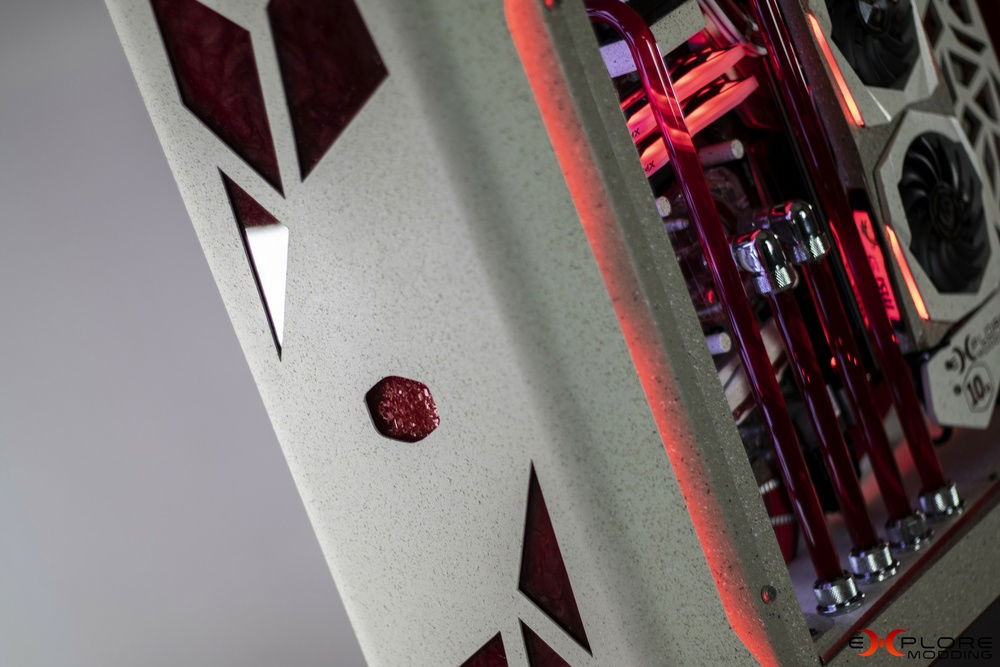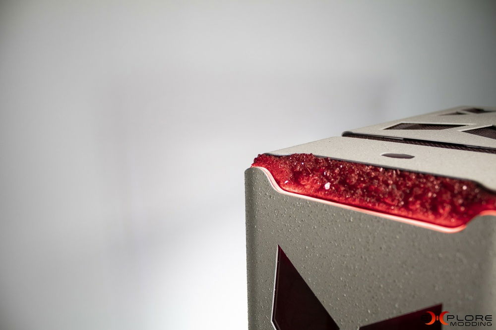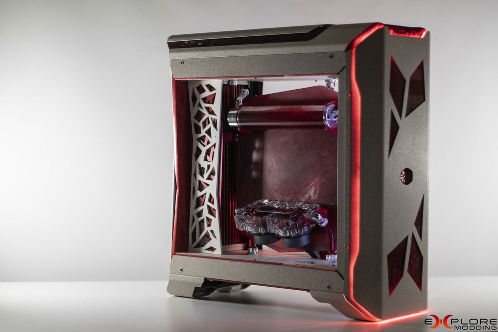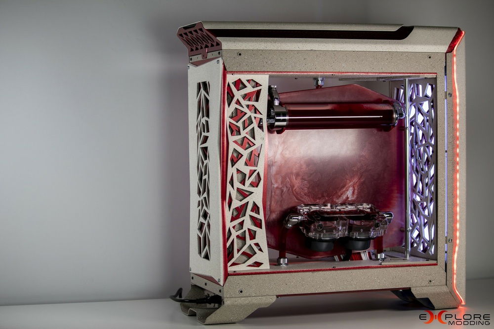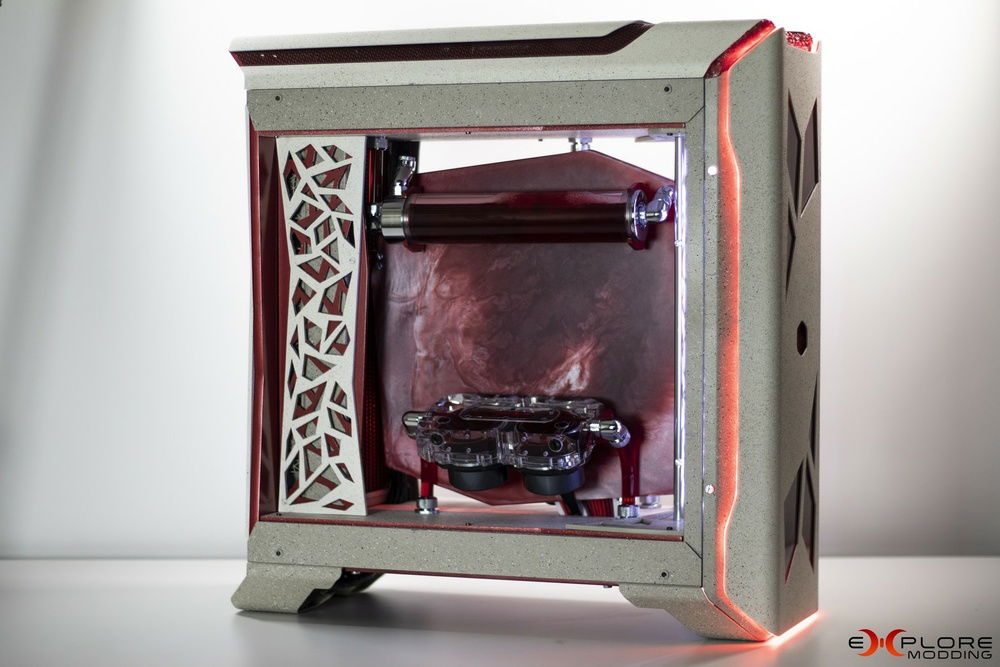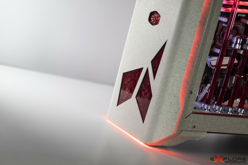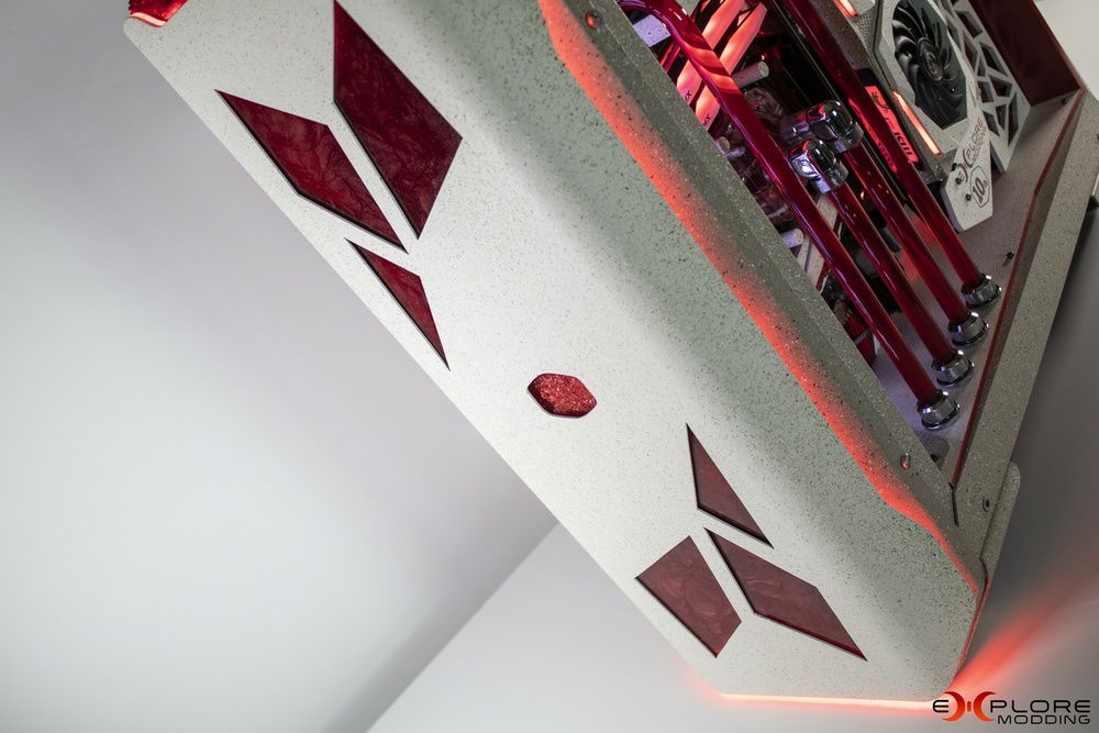 Realgar is a project inspired and designed following the rules of nature. Initially, the goal was to create a big stone monolith with a red geode inside, and I achieved that. In the end, it came out as what I like to call "controlled chaos": the resin texture, the handmade patterns on the panels, the crystals, were all designs that I didn't or couldn't plan exactly, that's why this build is connected to nature, unpredictable. Aside from that, Realgar features modifications for the SL600M that could be implemented in future versions, such as the lit trim on the front panel or the unique cable management sections. To break the naturalistic mood comes the watercooling loop, to which I gave a really modern and shiny look to achieve that contrast between nature and industry. The two main sides of Realgar feature two very different approaches, one being very minimalistic, and one more crowded, to please most eyes in different ways. The floating hardware panel inside is what makes this mod really pop, as I think it really looks like it's suspended in the air and it creates a really pleasant sight when looking at the internals.