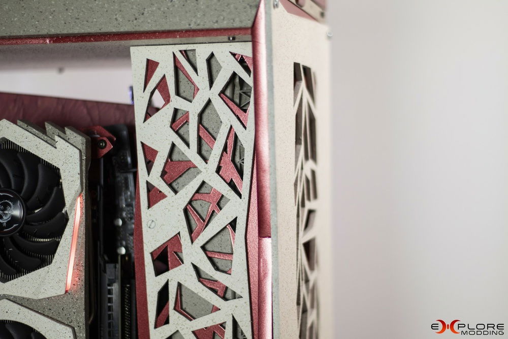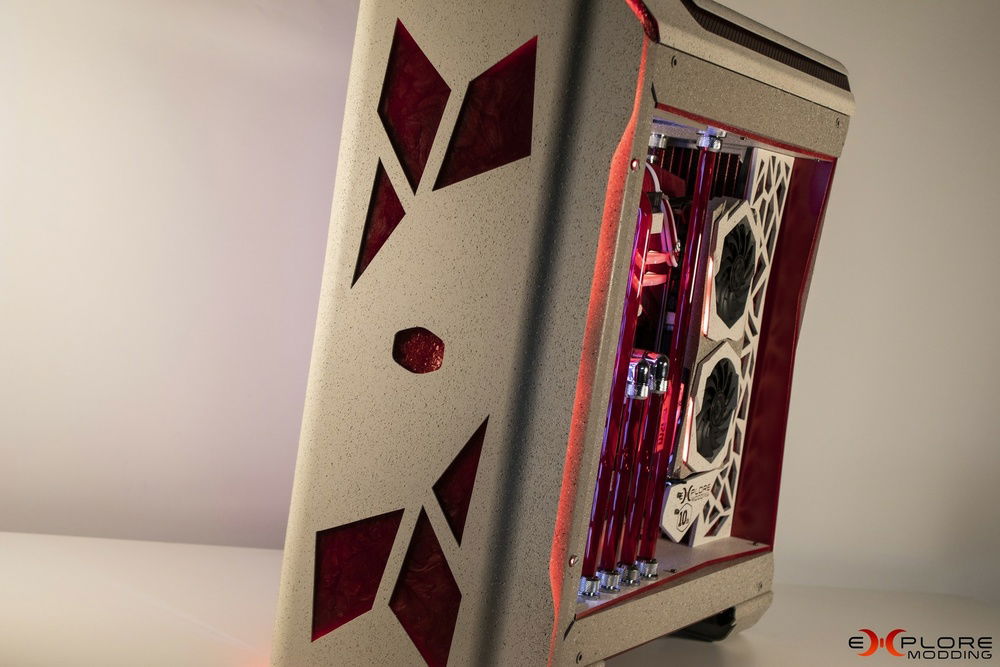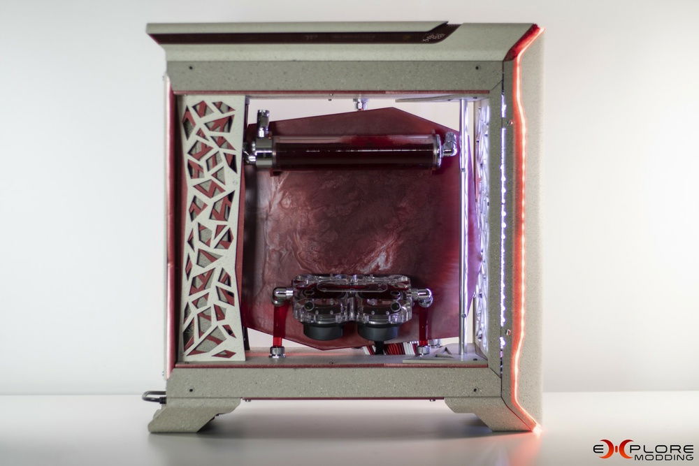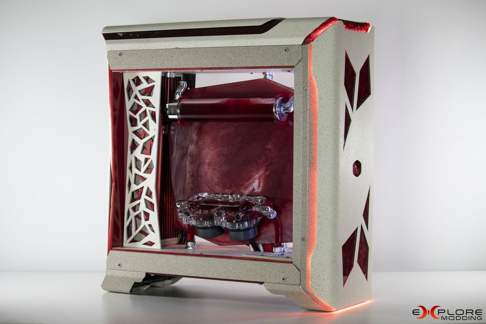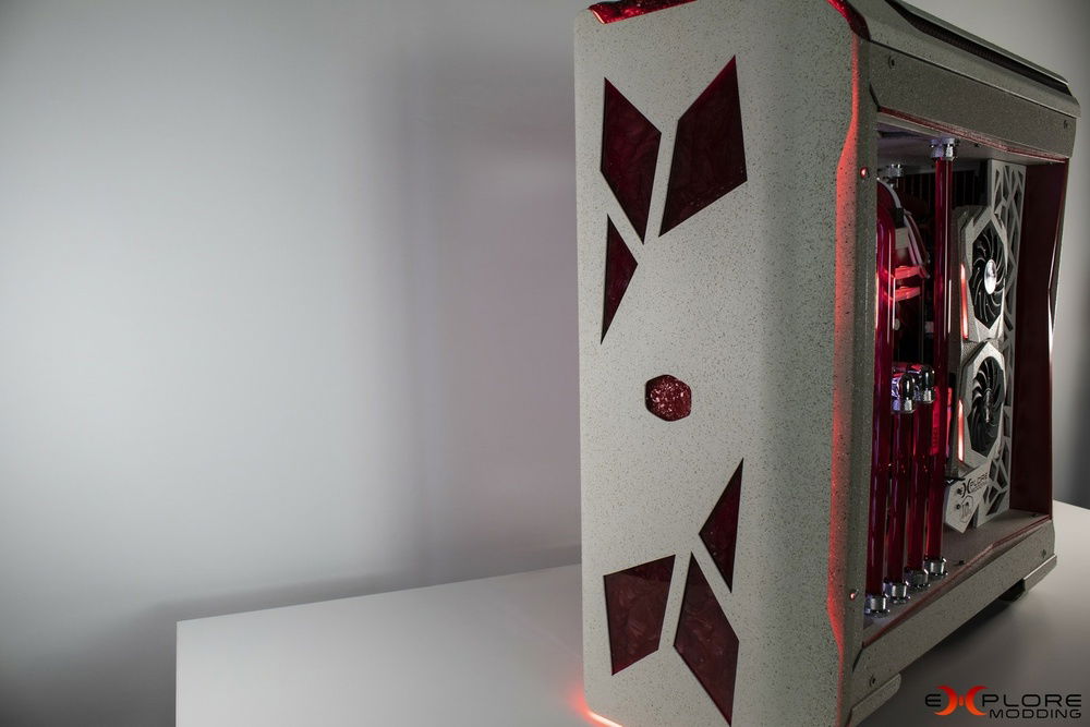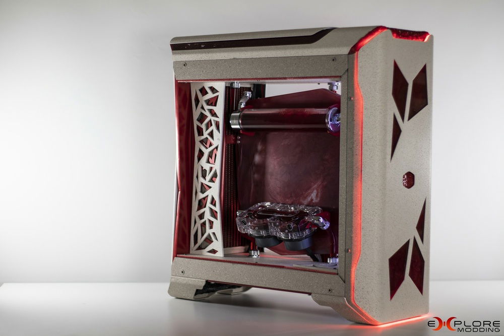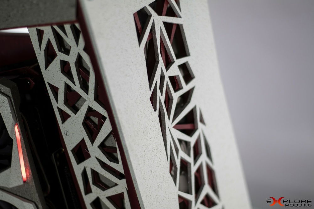 Realgar is a project inspired and designed following the rules of nature. Initially, the goal was to create a big stone monolith with a red geode inside, and I achieved that. In the end, it came out as what I like to call "controlled chaos": the resin texture, the handmade patterns on the panels, the crystals, were all designs that I didn't or couldn't plan exactly, that's why this build is connected to nature, unpredictable. Aside from that, Realgar features modifications for the SL600M that could be implemented in future versions, such as the lit trim on the front panel or the unique cable management sections. To break the naturalistic mood comes the watercooling loop, to which I gave a really modern and shiny look to achieve that contrast between nature and industry. The two main sides of Realgar feature two very different approaches, one being very minimalistic, and one more crowded, to please most eyes in different ways. The floating hardware panel inside is what makes this mod really pop, as I think it really looks like it's suspended in the air and it creates a really pleasant sight when looking at the internals.