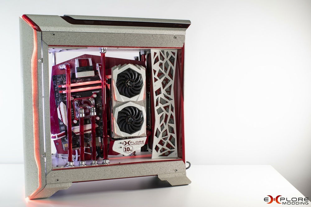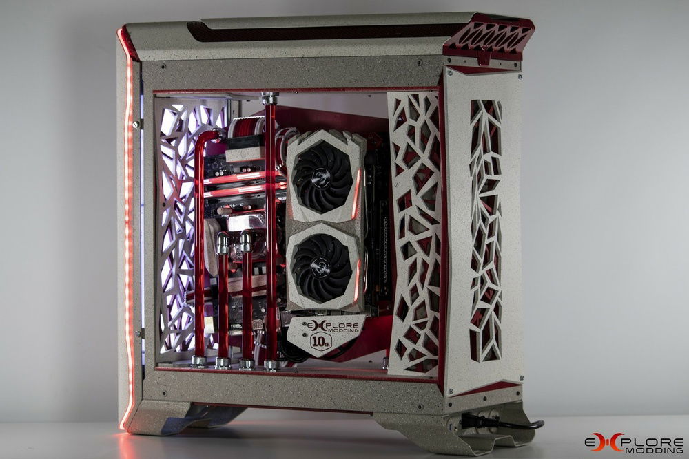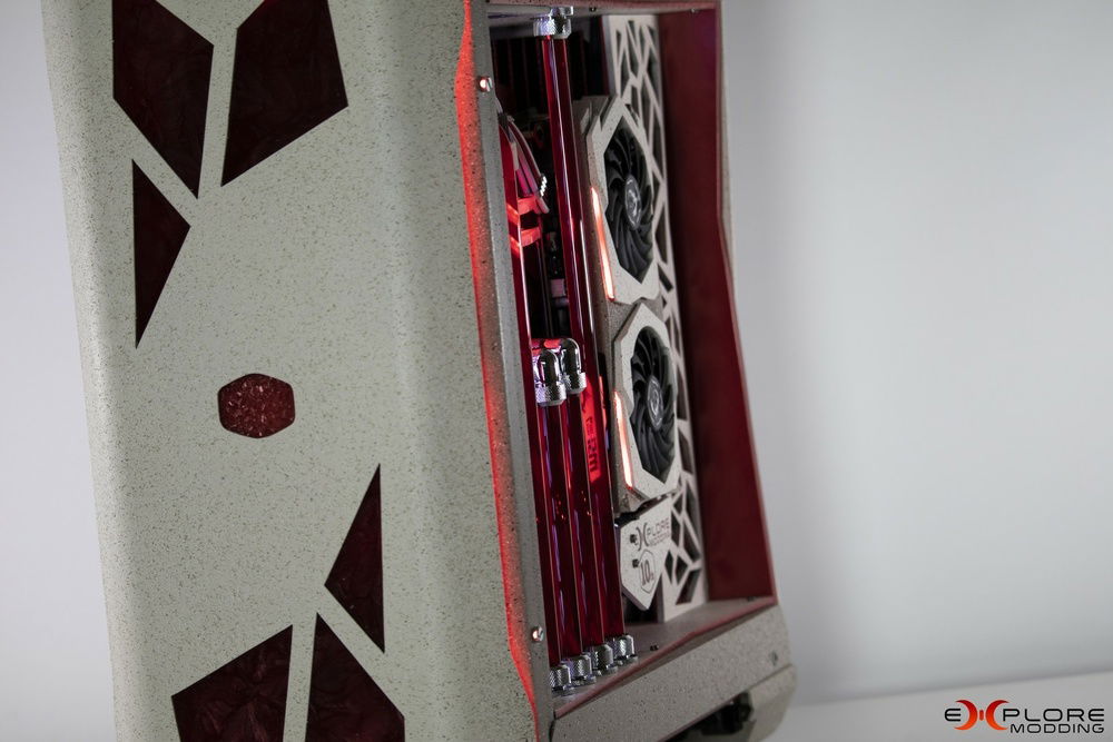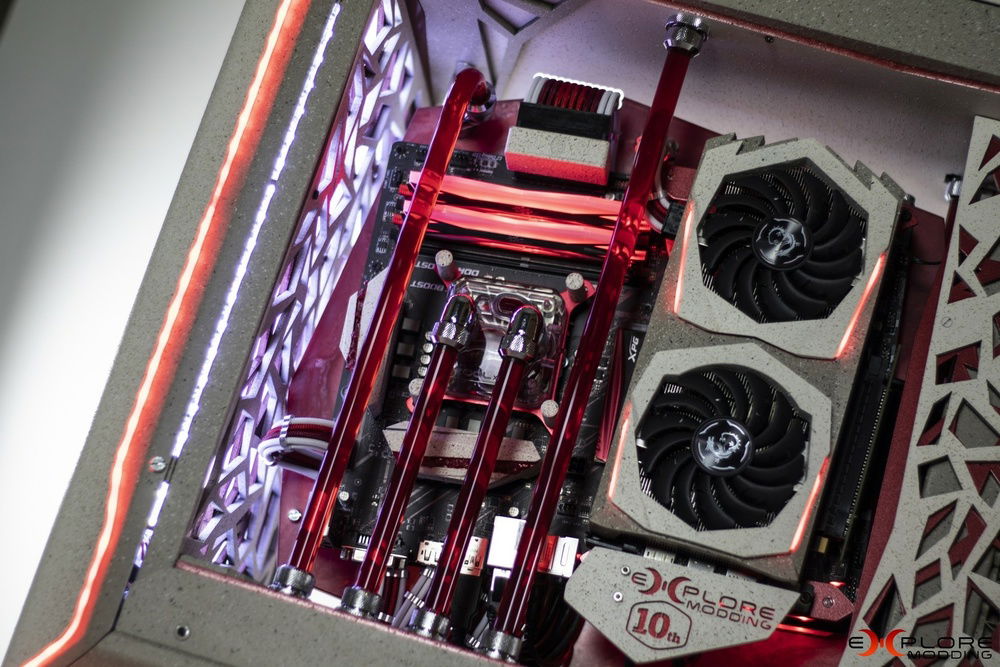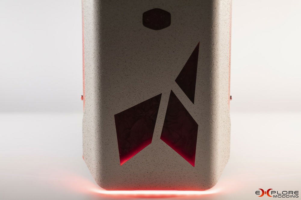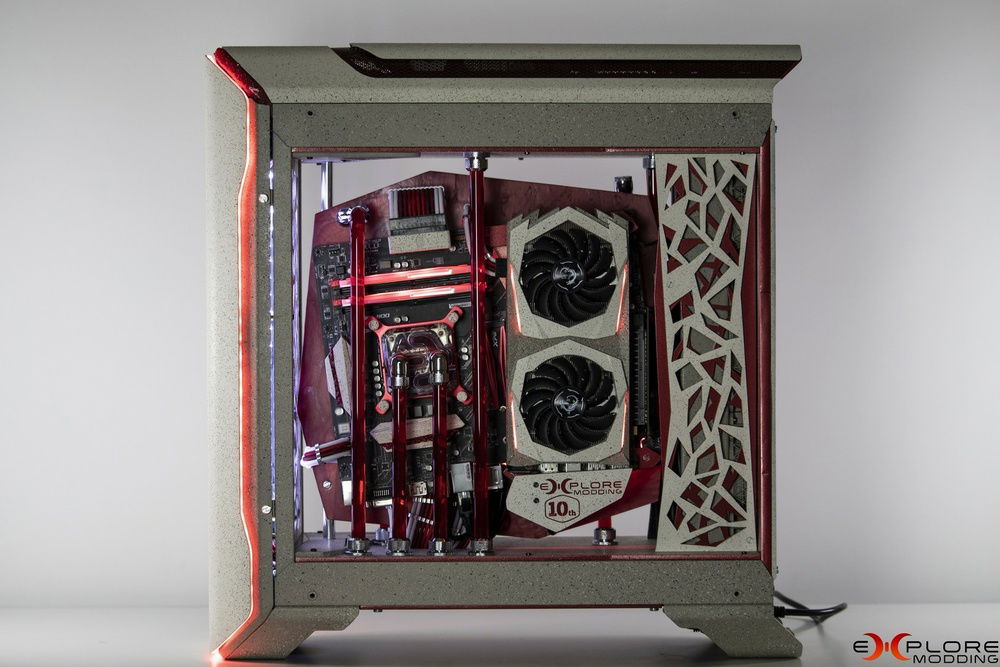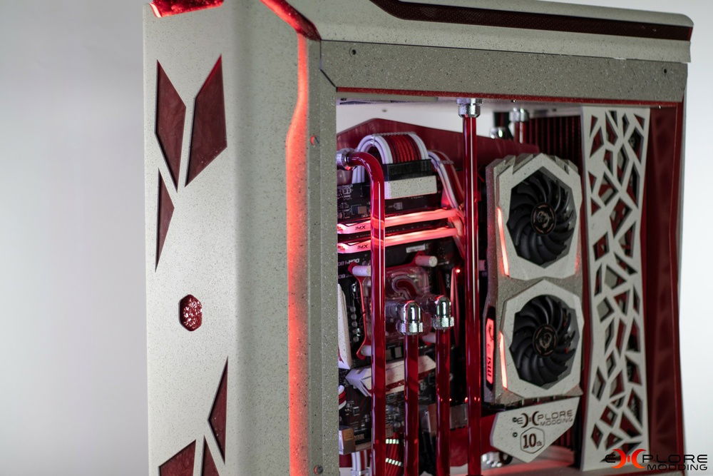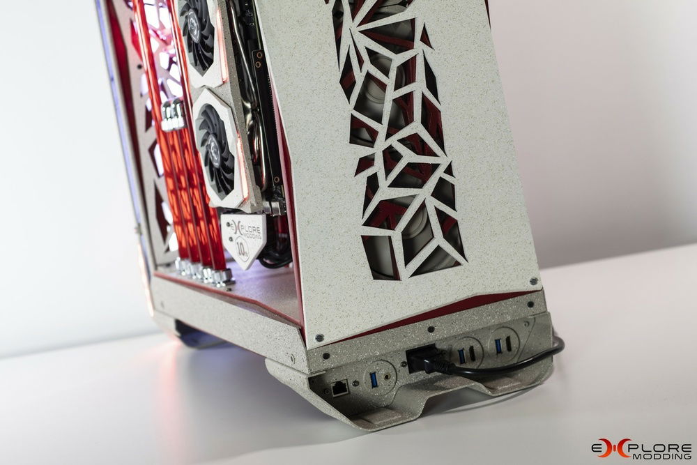 Realgar is a project inspired and designed following the rules of nature. Initially, the goal was to create a big stone monolith with a red geode inside, and I achieved that. In the end, it came out as what I like to call "controlled chaos": the resin texture, the handmade patterns on the panels, the crystals, were all designs that I didn't or couldn't plan exactly, that's why this build is connected to nature, unpredictable. Aside from that, Realgar features modifications for the SL600M that could be implemented in future versions, such as the lit trim on the front panel or the unique cable management sections. To break the naturalistic mood comes the watercooling loop, to which I gave a really modern and shiny look to achieve that contrast between nature and industry. The two main sides of Realgar feature two very different approaches, one being very minimalistic, and one more crowded, to please most eyes in different ways. The floating hardware panel inside is what makes this mod really pop, as I think it really looks like it's suspended in the air and it creates a really pleasant sight when looking at the internals.