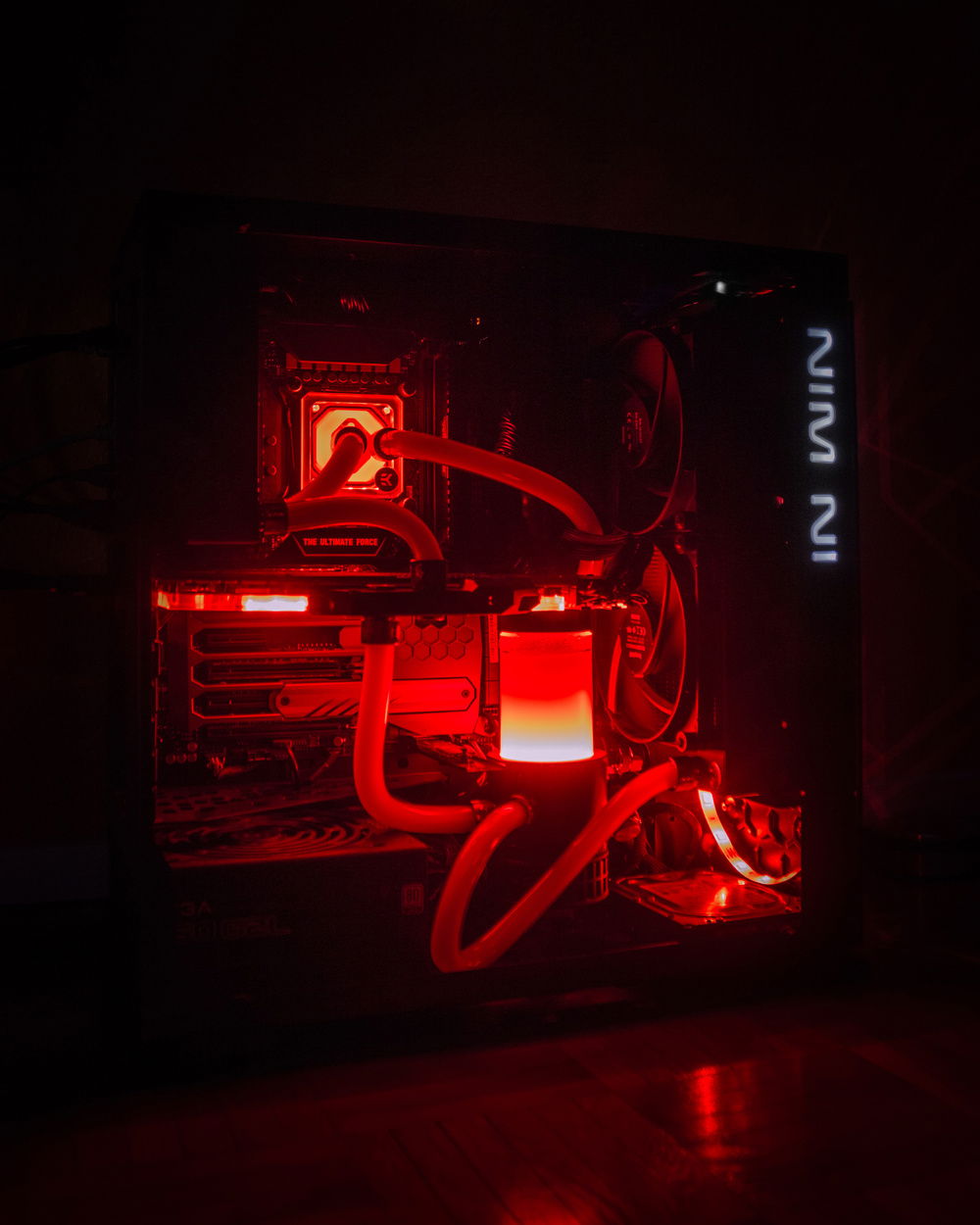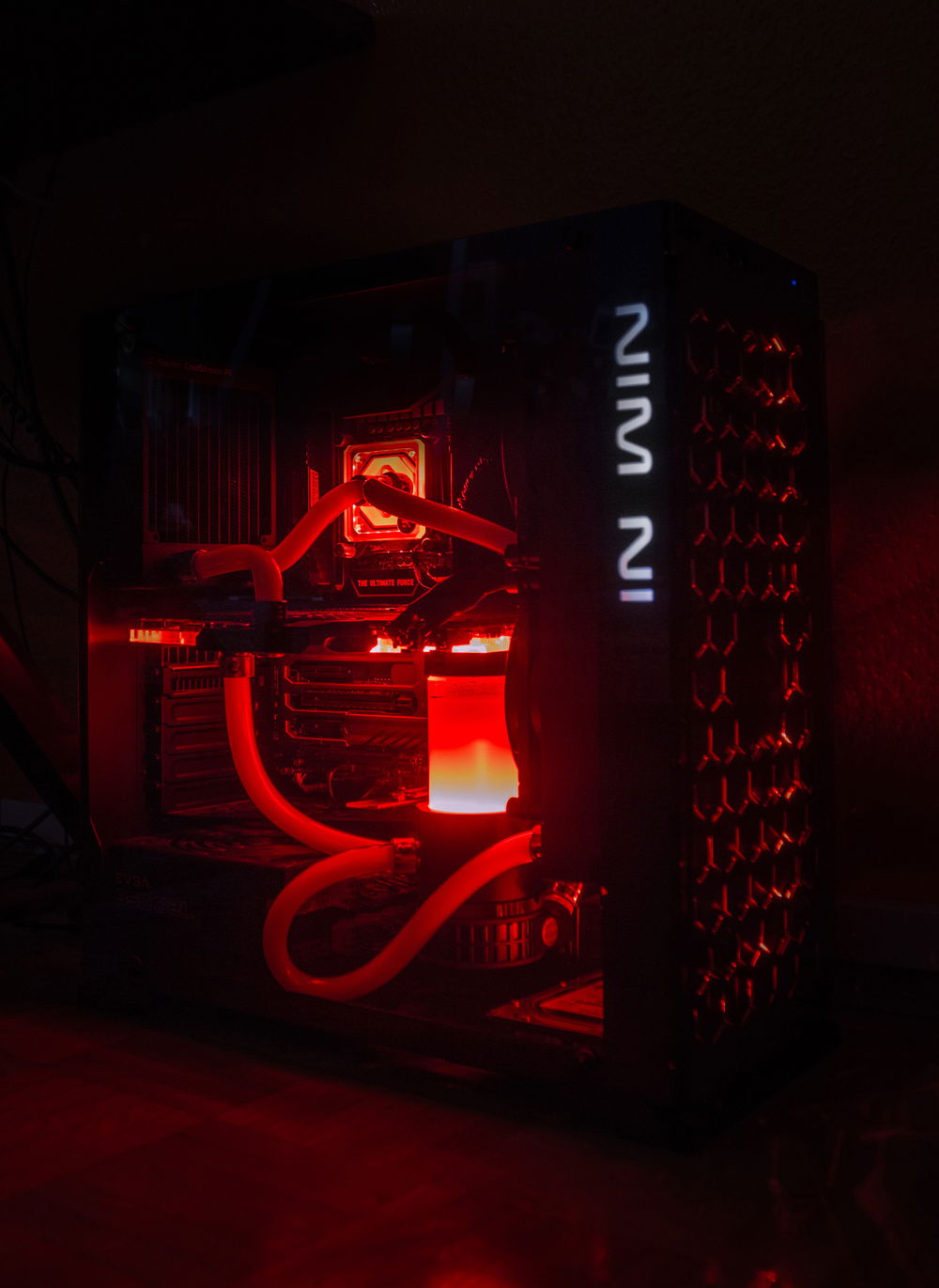 It is my first custom water cooled PC and it was quite a challenge in the In Win 805. I modified the case front so that the gap is a bit bigger and more air can come in through the 280mm radiator in the front. I put on four Be Quite Silent Wings as Push/Pull on that radiator and one Silent Wing in the back to cool the 120mm radiator.