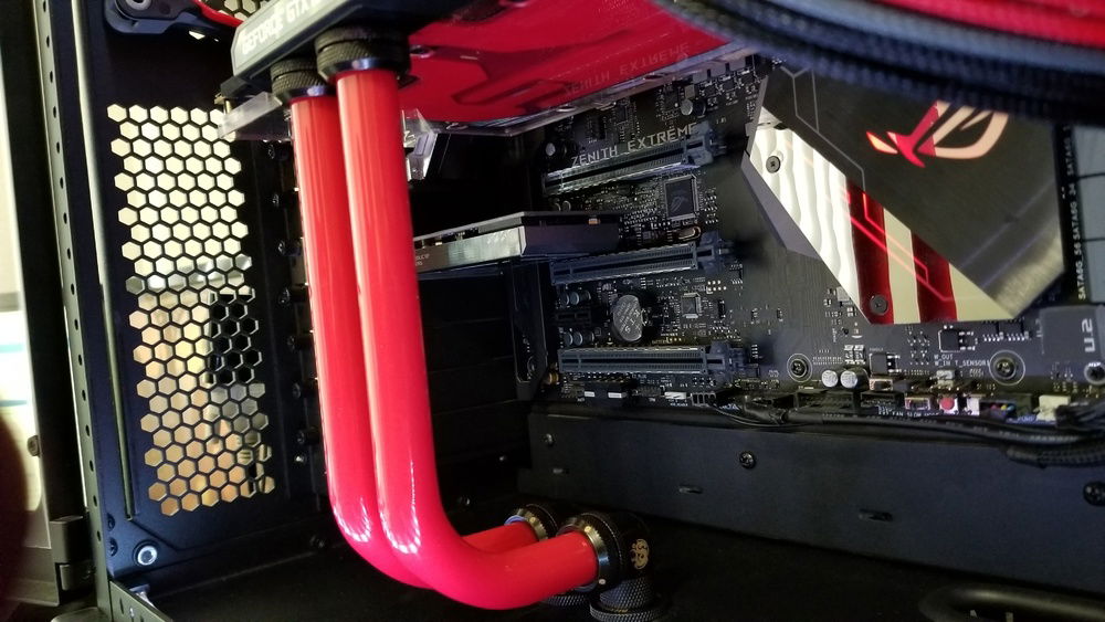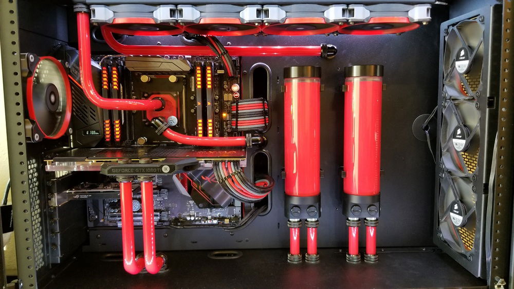 This is Red Blaze, my Threadripper 1950X system, obviously heavily influenced by JayzTwoCents' Skunkworks V2 build (without the SLI). The system is overclocked to 4.1GHz. I originally wanted 2 1080ti cards on SLI, but the budget just didn't allow it. I even have the extra set of sleeved cables already made for another card. I guess if I decide to put it in later I have them. Aside from that, I'm happy with the way it came out. This is my first ever rigid-tubing custom loop (dual). Drilling into this case (as expensive as it is) was nerve wrecking.