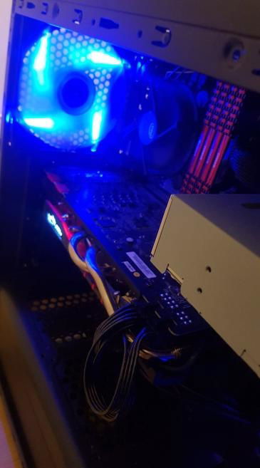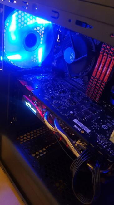 Close up of that juicy red ram and video card with the lovely blue lights overseeing it all.