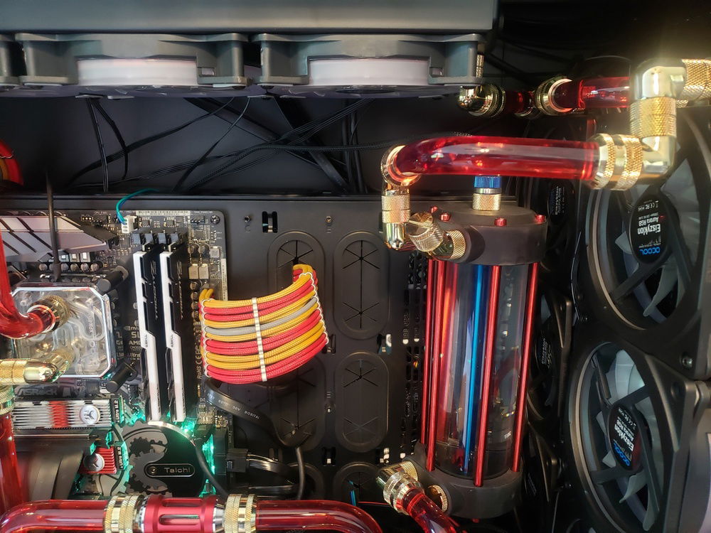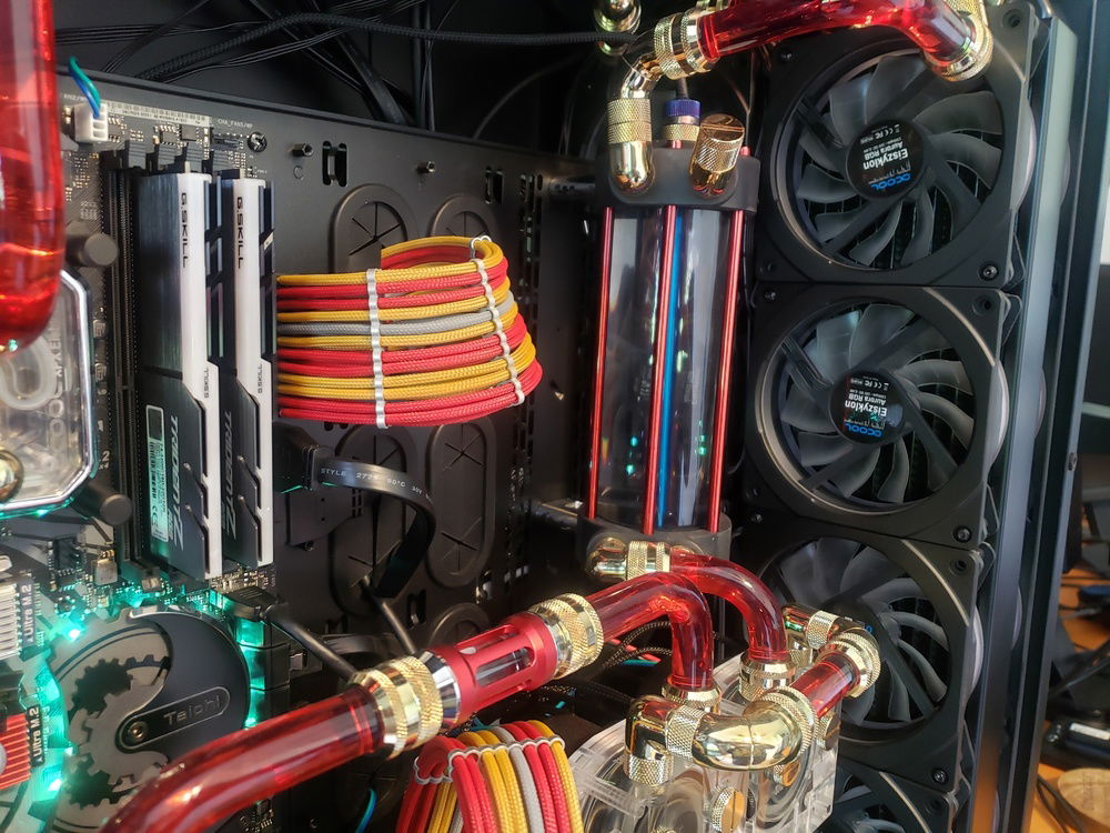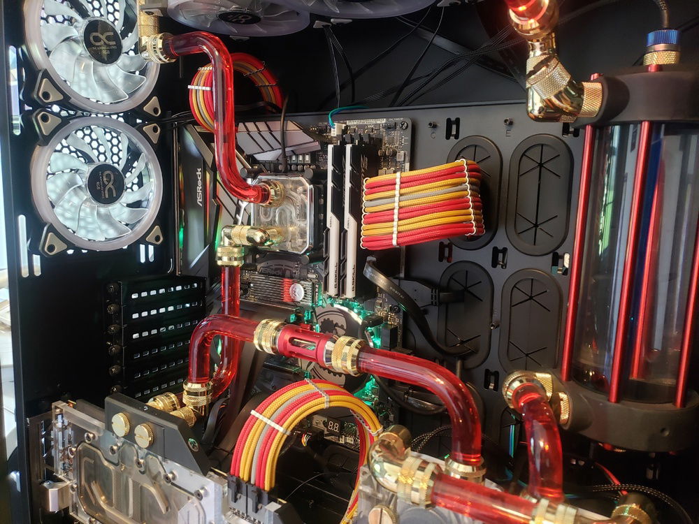 This was my first water-cooled build. I'm a big Iron Man fan, so I went for a red/gold/silver theme.