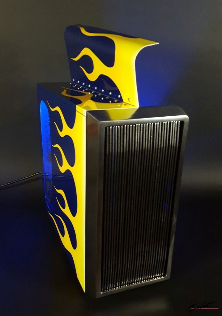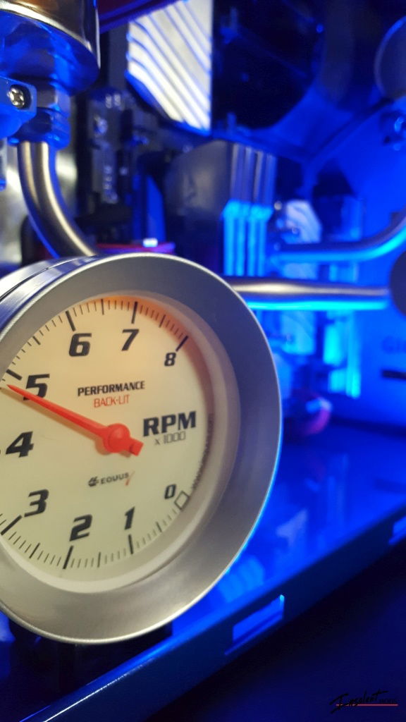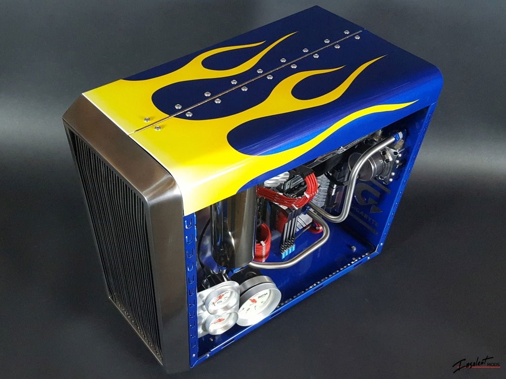 Details: hinged hood, stainless cooling lines with catch can reservoir, automotive gauges, custom grill and flame paint job, suede interior, and a fire extinguisher.