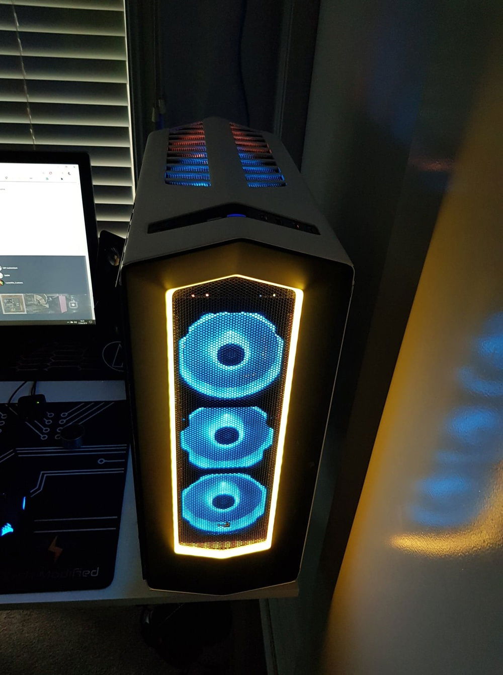 My second ever build, my 1st was a destiny themed but it has now gone, This is close 2 MAX RGB but it could have more, It has a custom mirror backplate for the GPU that i made myself Both exhaust fans on the rear are only blue, which is sad haha. Even my gaming chair is RGB from aerocool AC220 I have cutom removed the "grill"look of the front of the case which gives a much nicer, cleaner look
