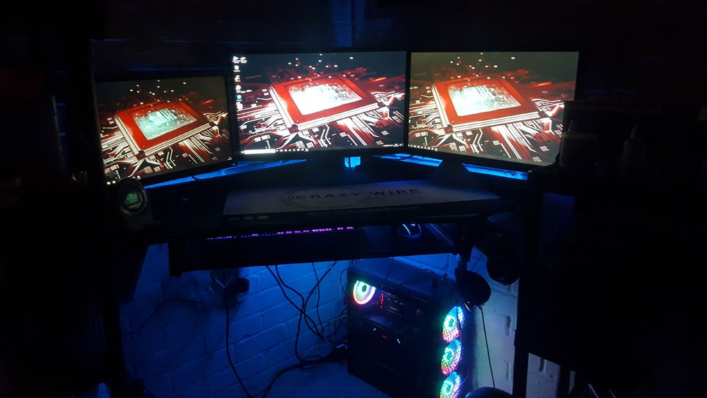 Custom built 'floating' desk with built in up and down RGB Case- cant remember brand, but modified it GA-990x gaming sli FX8350 black running at 4.8gh 16gb corsair vengeance GTX 980Ti Corsair 750w modular psu 500gb SSD 1TB HDD 4 x corsair LL120 running on node pro controller 240mm AIO