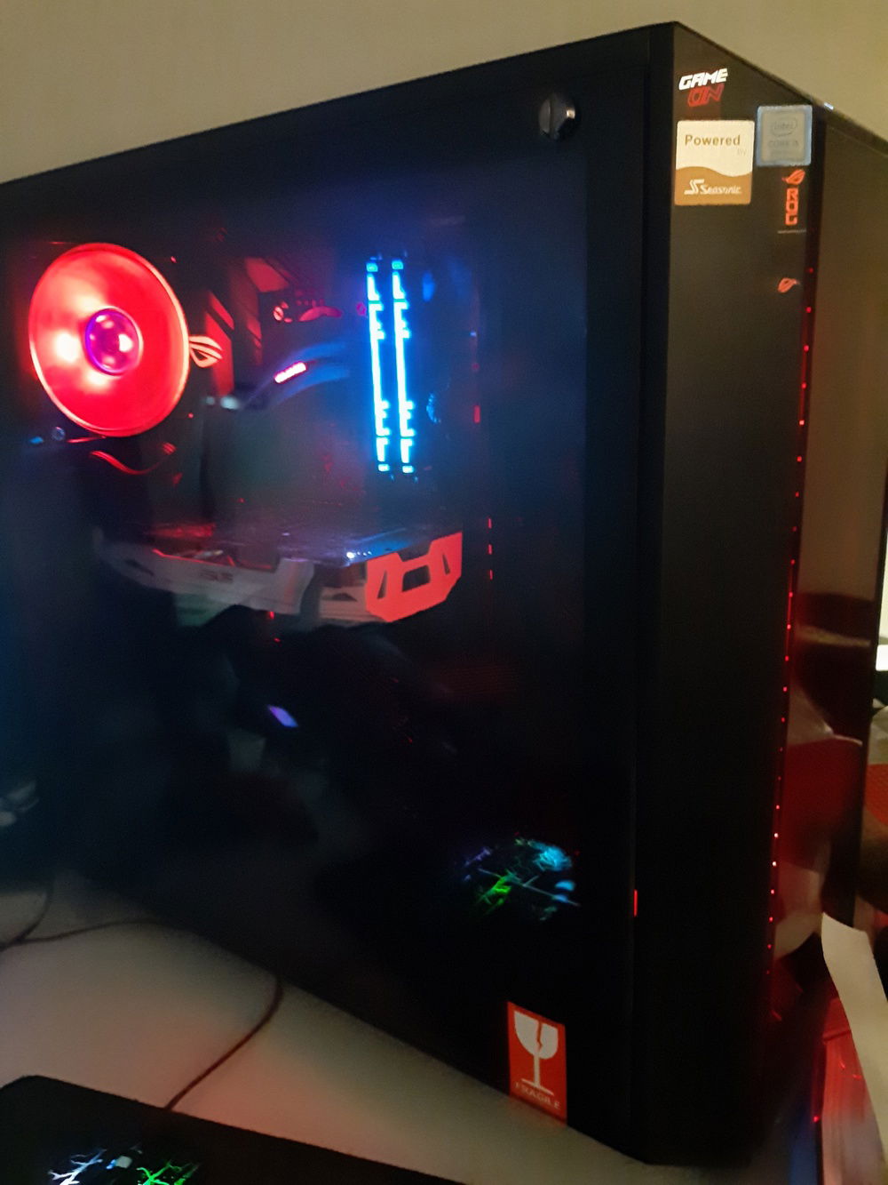 Was trying to build all in red and black within 1400 € in the end every cable came black. Asus Z390 H Atx edge Coolermaster aio rgb lights Coolermaster Pro 5 Rgb case I5-9600k oc edition Asus gtx 1070 8gb Oc Seasonic 620 bronze +80 fullmodular power suplly Kingston 2x8gb 3200 cl 17 rgb ddr4 Ram Samsung Ssd 250 gb (870) Samsung Ssd 500 gb (960) Seagate Hdd 1 tb green