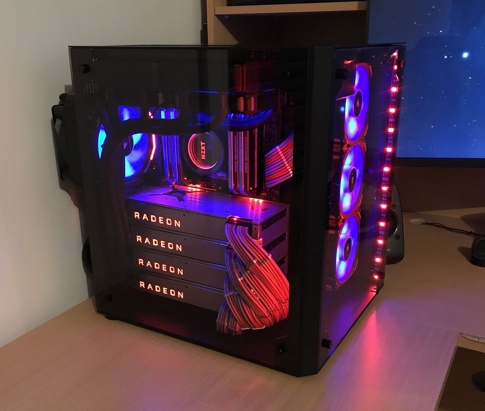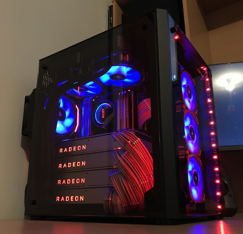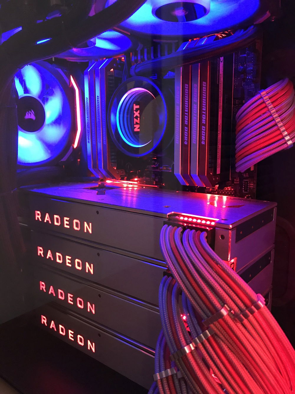 Rippin Red is my custom all AMD PC I built just under a year ago. Featuring a 1950X overclocked to 4ghz @1.35vcore, 32GB of Corsair Dominator Platinum @3200mhz and 4 XFX RX Vega 64 Liquid cooled GPUs.