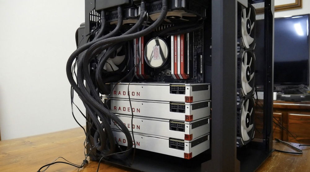 Mining Monero on my CPU and GPUs @ ~1800h/s on each Vega (CryptoNightV8) & ~1100h/s on my 1950x. Total system hashrate is ~ 8200h/s w/ GPU core underclocked & VRAM @ 1100mhz