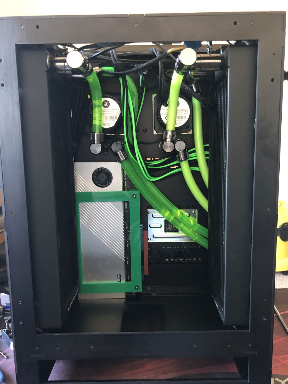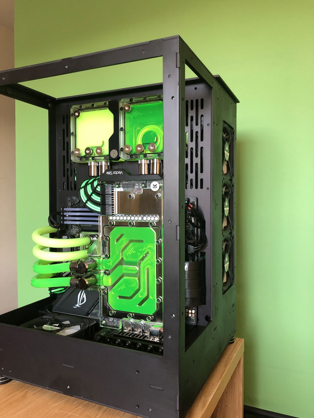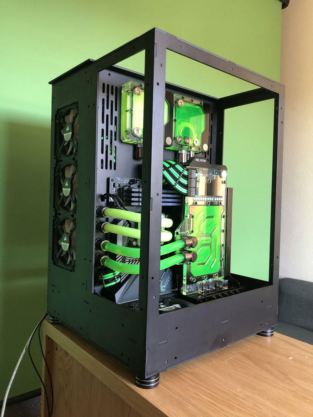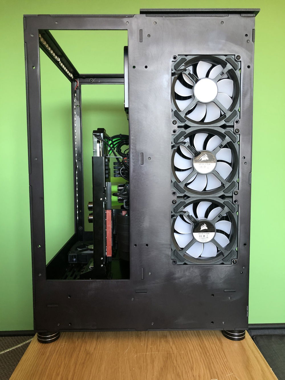 Home designed case base on dual loops set up with x2 PE360 radiators. With goal of displaying computer system while viewing at front, sides & top.