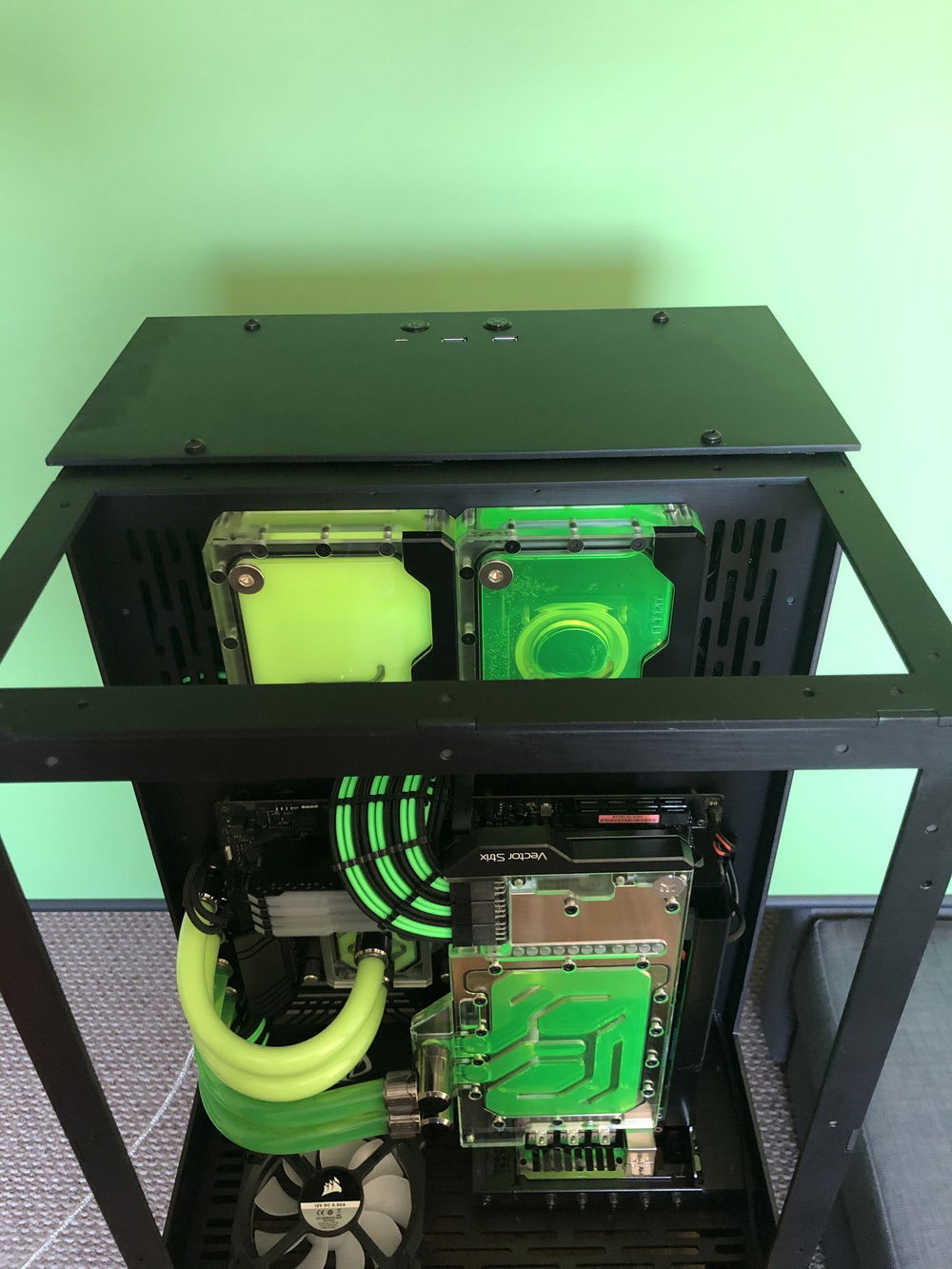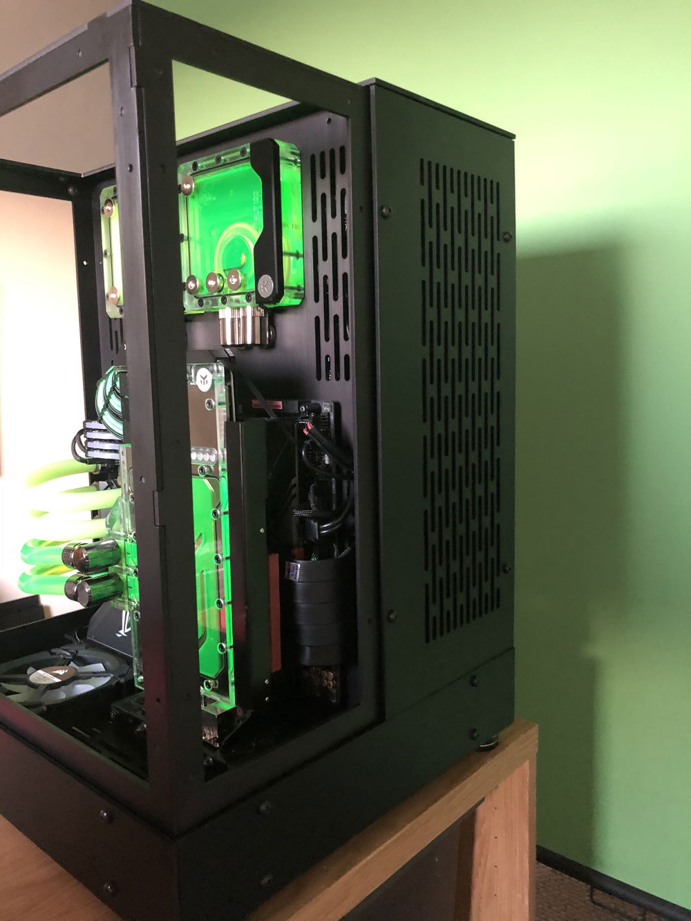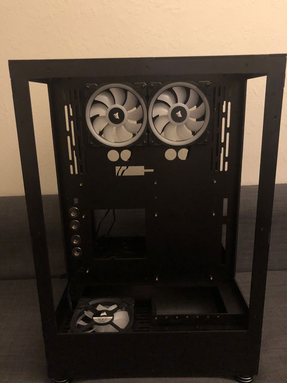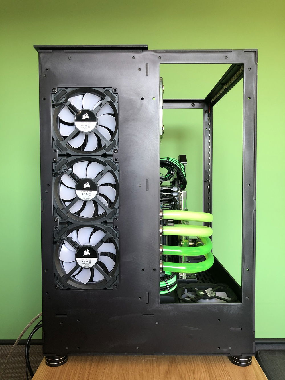 Home designed case base on dual loops set up with x2 PE360 radiators. With goal of displaying computer system while viewing at front, sides & top.