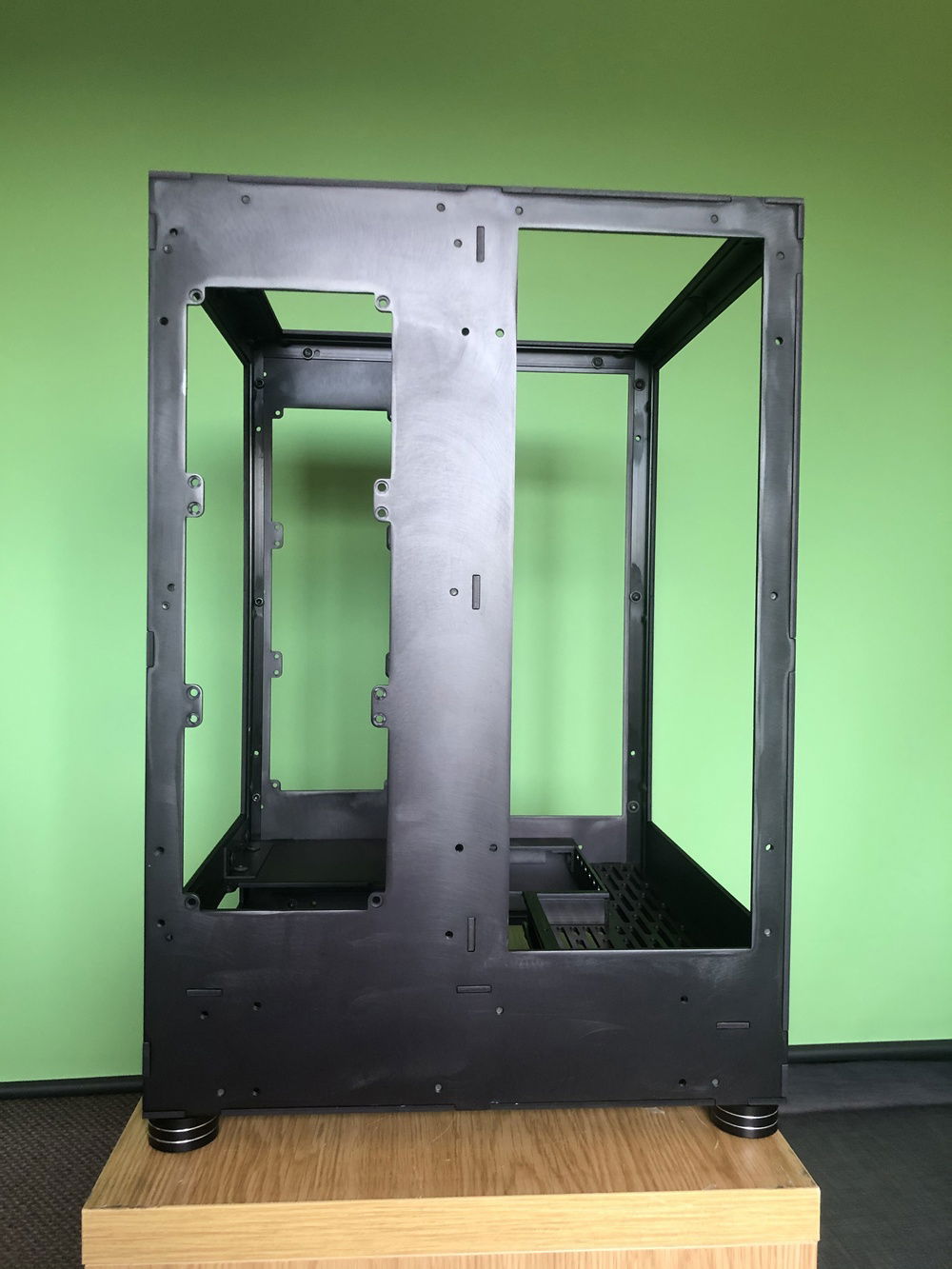 Chassis made with 4mm aluminium and can be flat packed as held together by screws. Exterior panels are 4mm aluminium too, all of them are anodised.