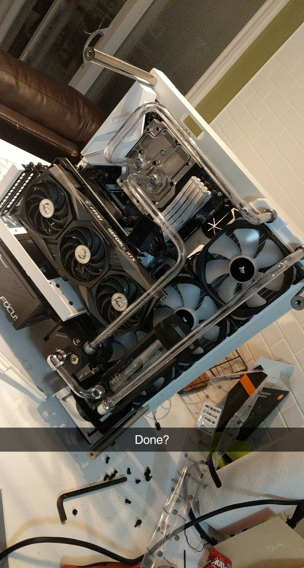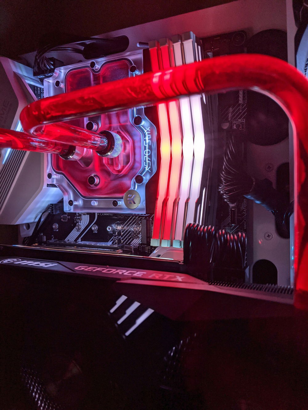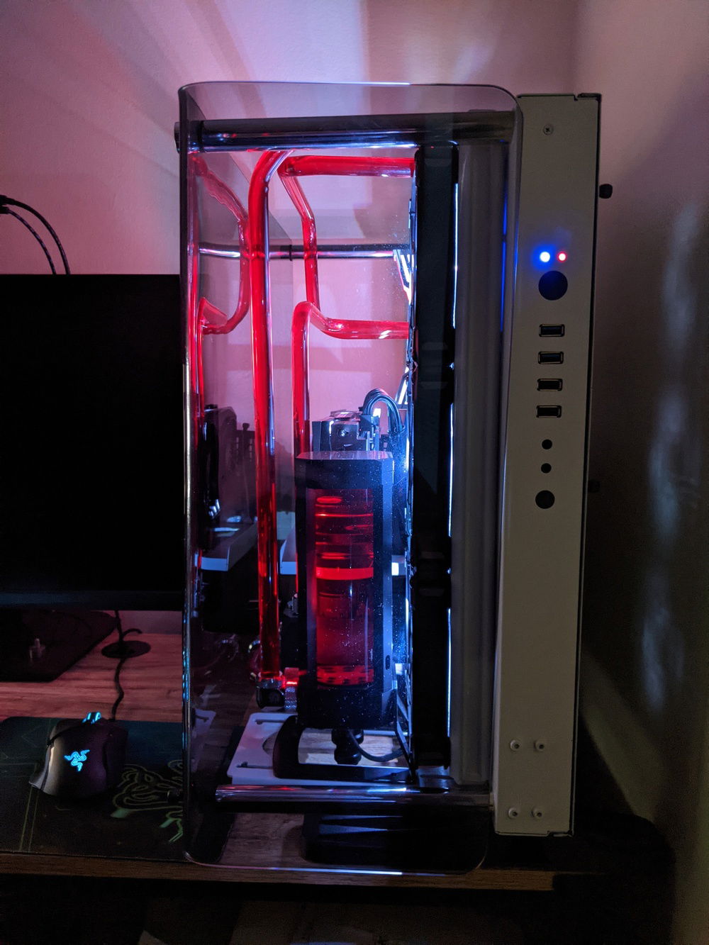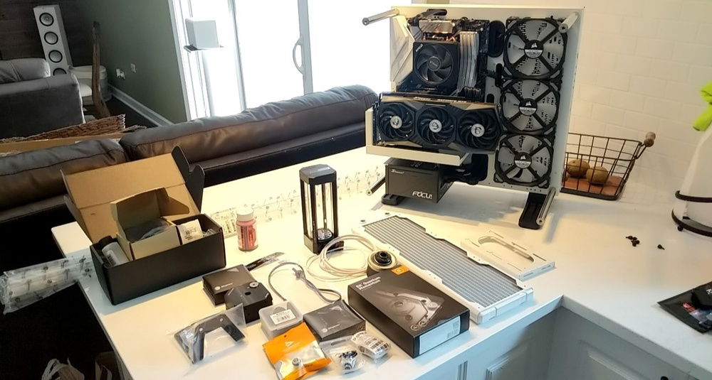 This ended up being a passion project for me. I've always wanted to do a custom loop in a pc, but I stopped gaming for a few years so never had a chance. I decided I wanted to build myself an overkill pc that showcased some of my handy work. The case is painted a glitter white, as for some reason thermaltake does not offer the curved p3 in any colors other than black. I had to custom mount the pump as I did not realize there is a reservoir version that includes a d5 mount, but I think it looks nice with it off to the side. It was also my first time bending tubing which was a lot of fun. Hope you guys enjoy!
