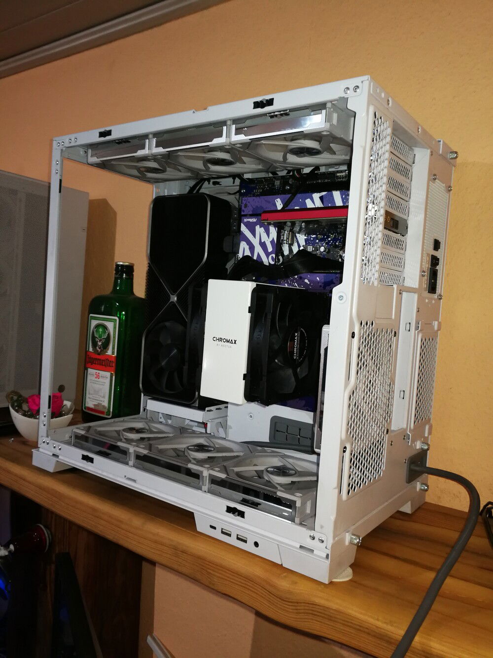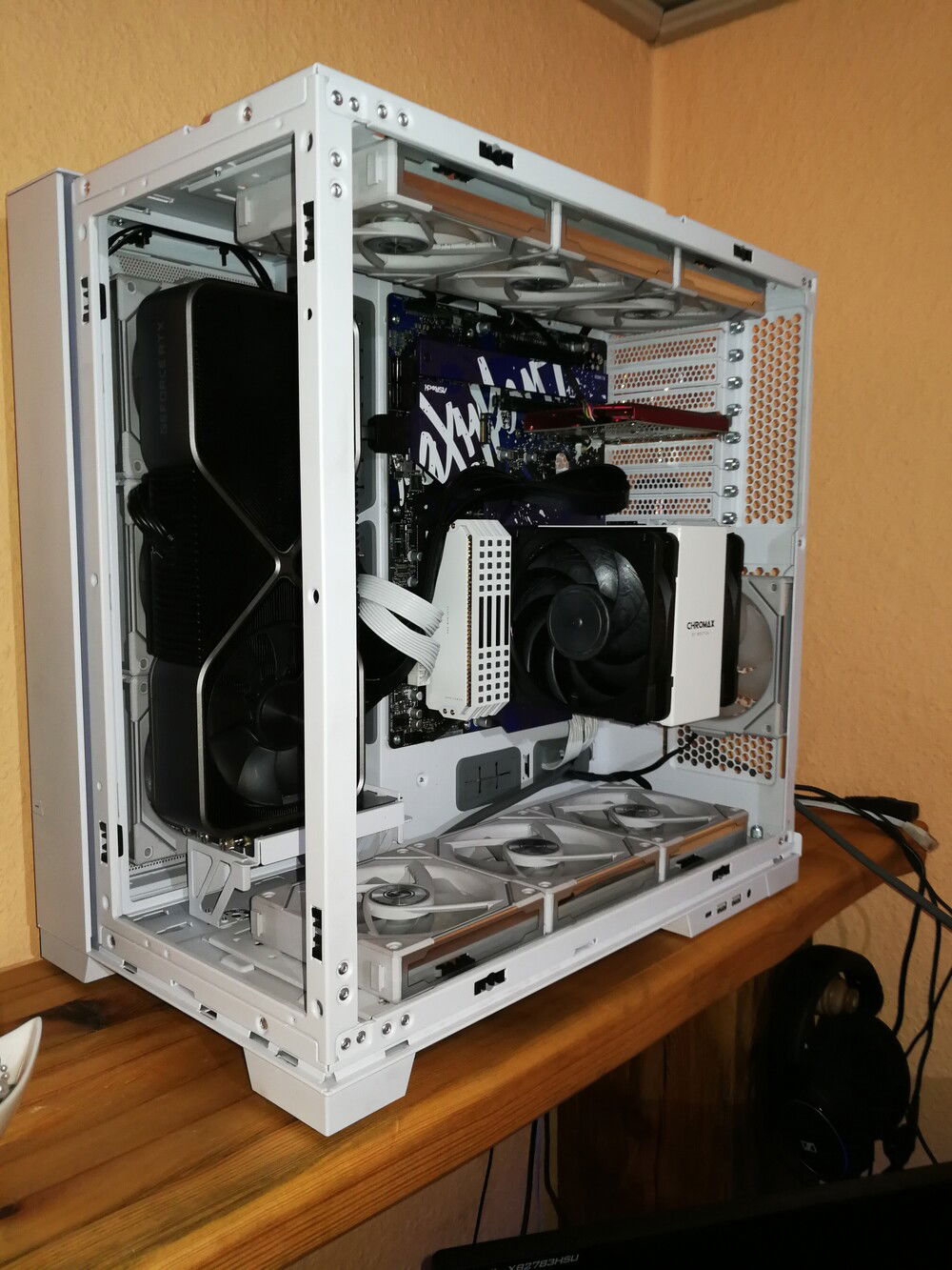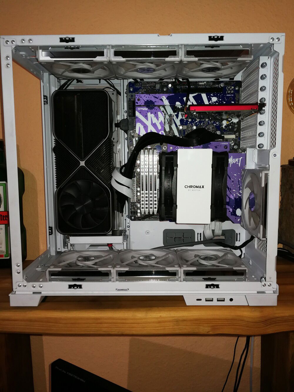 Livemixer... a mix of white "airbrush" with blue paint splashes on purple components and the board itself in black. What goes better with this than a white clad Noctua cooler and white Domiator RAM
