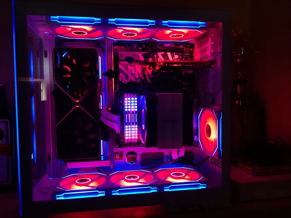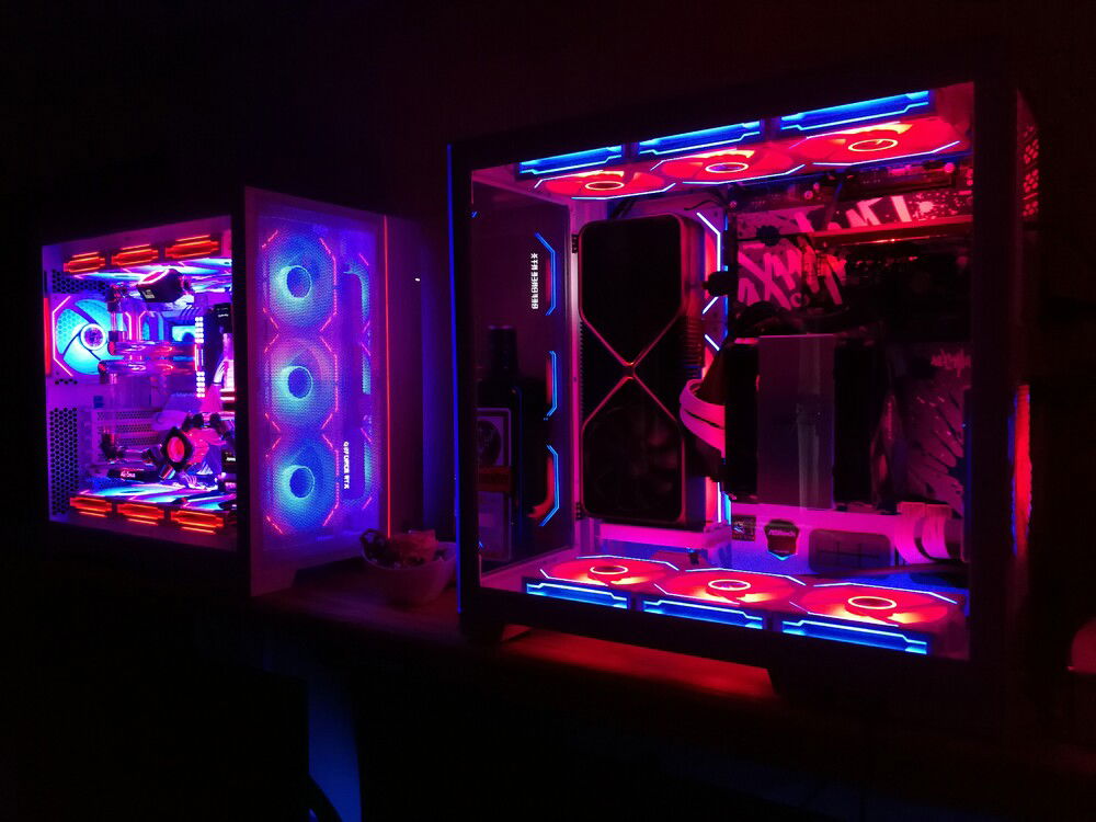 Both systems are colour-coordinated. One side has blue fan frames and red fan blades, the other side has the exact opposite. It's the same with RAM. On one side the base color blue and red stacks - the other side red base color and blue stacks.