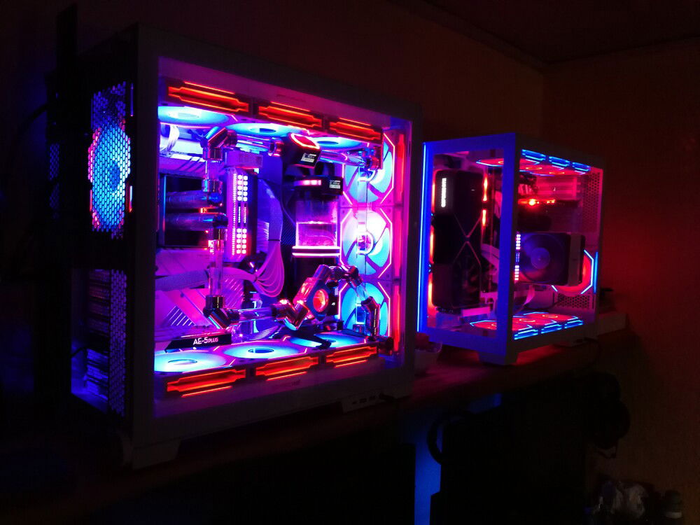 left system with custom water cooling for CPU and right system air-cooled CPU