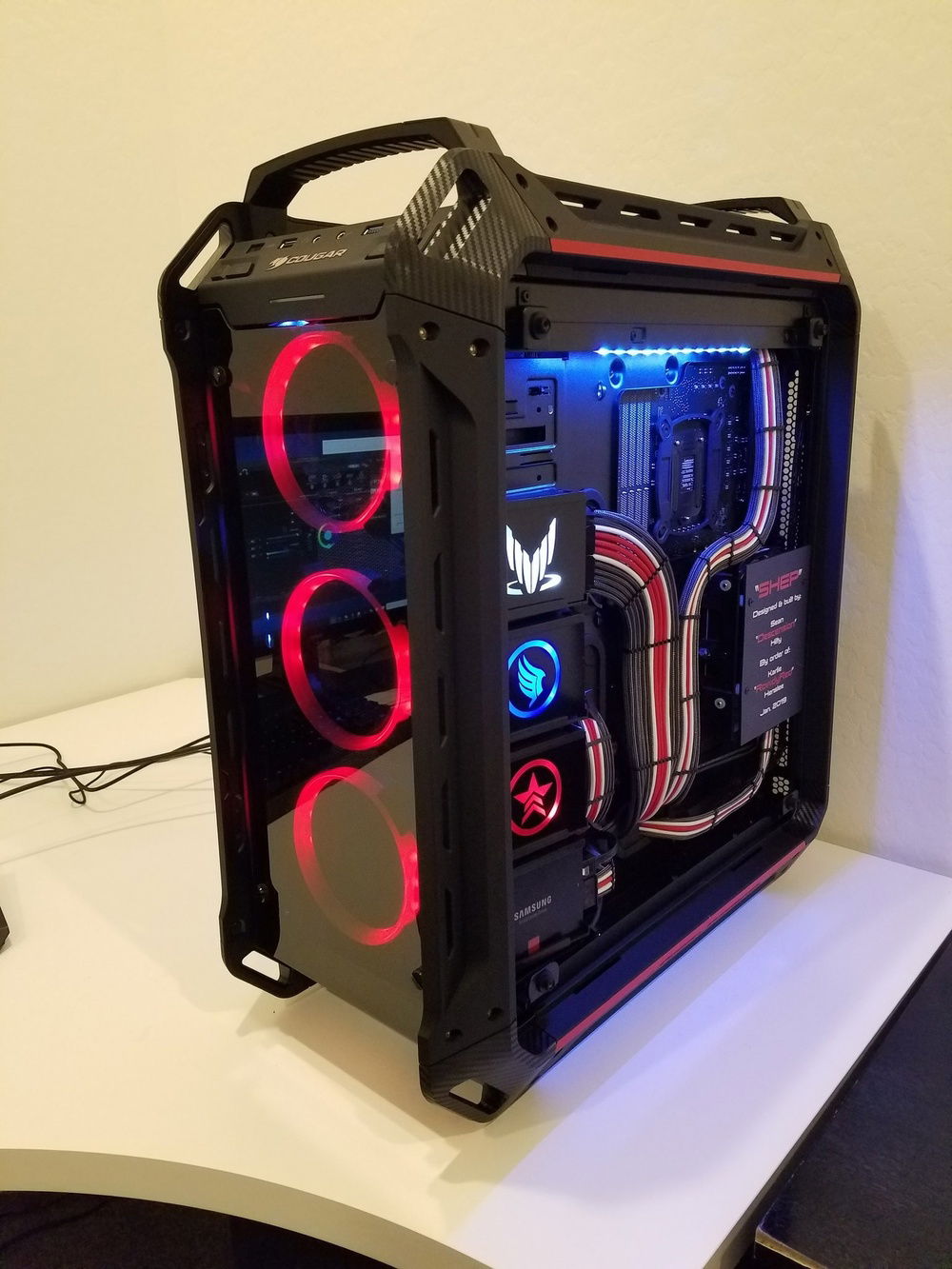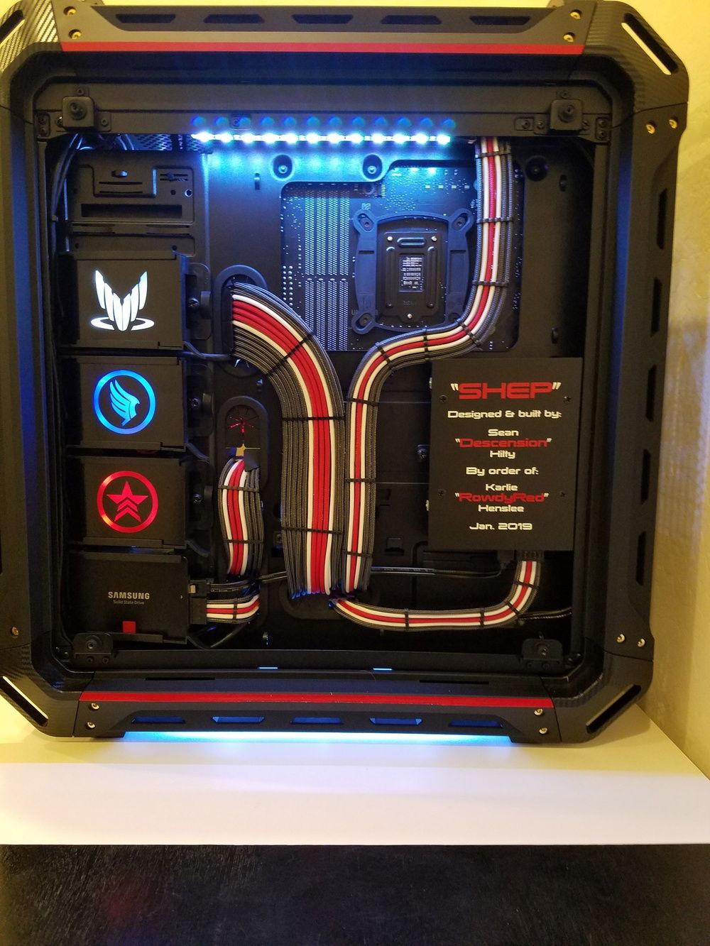 Red/white/carbon full sleeved psu cables. Custom led boxes were built into the extra SSD slots. Custom led box added to the front (Normandy). Custom harnessed/sleeved underglow and case lighting. All front panel and fan headers were custom harnessed or extended and sleeved. Psu basement was modded into a full cover. Psu basement magnetic plaque added to cover lower mobo connections. HDD "as built" plaque added to cover hdd pcb.
