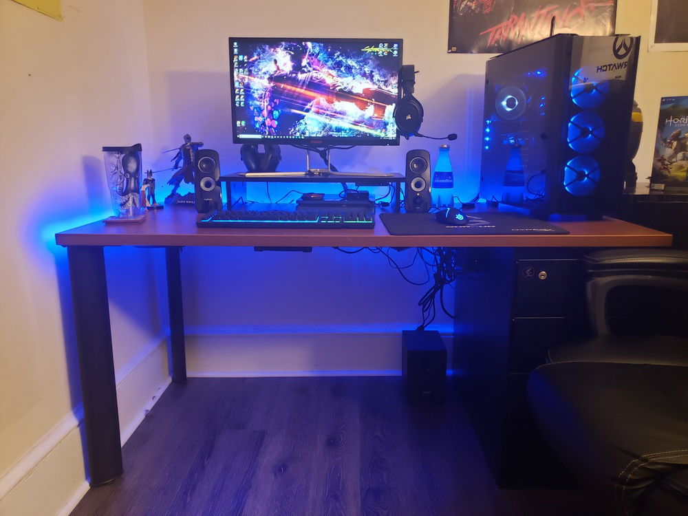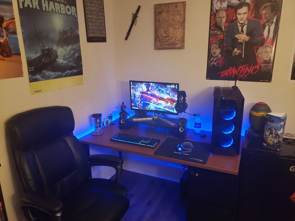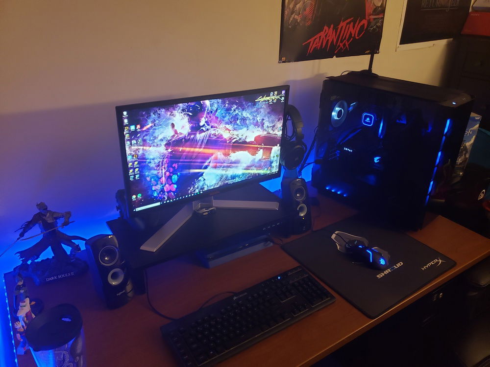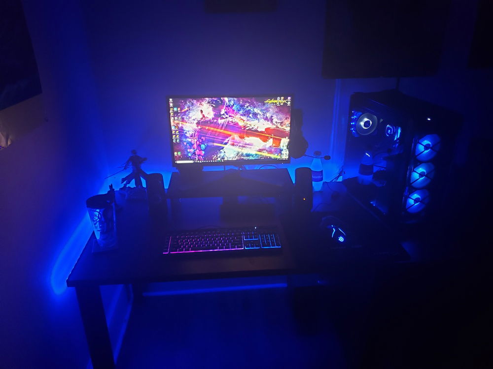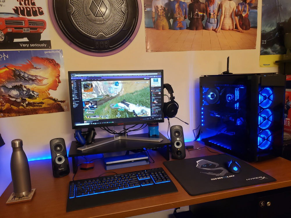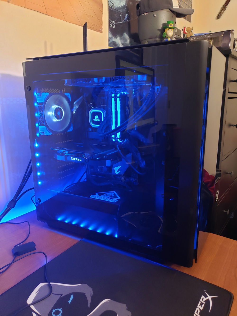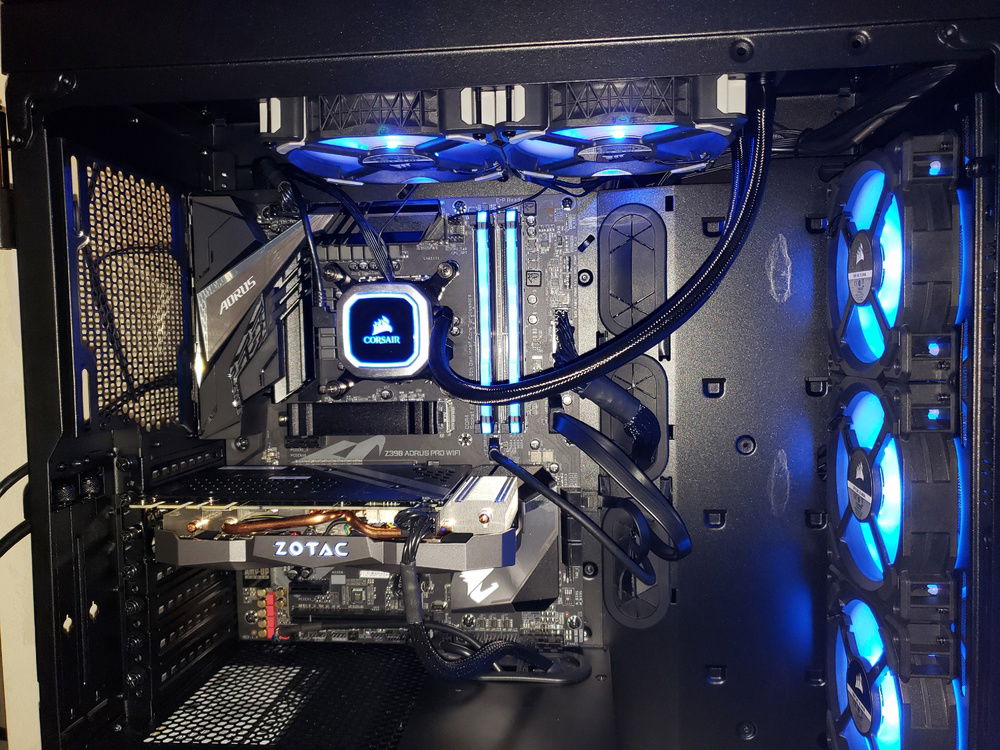 The Shroud Blue Build uses the corsair light strips, LL series and ML series RGB fans, but the rear exhaust is just a white LED version of the ML series to match the other small white accents in my build. I've been a fan of Shroud now for a while, and blue was already my favorite color, so this theme for my first PC build ever seemed like a no brainier. I was really grateful since my dad and brother helped me get the parts around Christmas, since I moved out of state, it really meant a lot to always have a piece of them with me. I'm happy with how the build turned out and am always improving on it. The pictures show I've moved the desk around even, for the better corner light on the desk. For some reason it doesn't list the zotac 1070ti mini, but that is the correct card i have.
