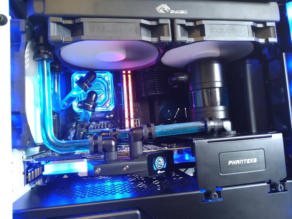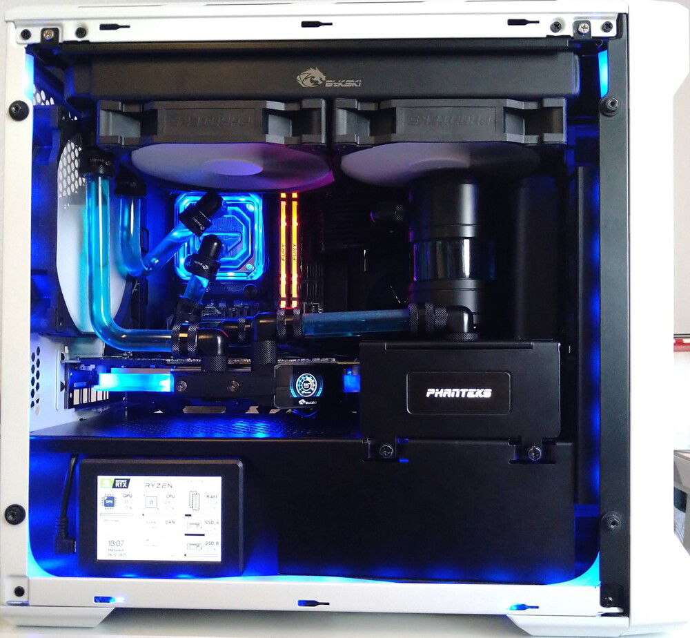 In that way it was a really big challenge to find the right cooling-block for the lovely MSI 2070 Super Ventus OC. But finally I found Bykski as a manufacturer; not only for the GPU-block, also for the CPU-block, fittings and everything else for the liquid-cooling. In the end I have only five labels in my setup: Phanteks, MSI, Kingston, Bykski and Seasonic (the info display is by GOverlay).