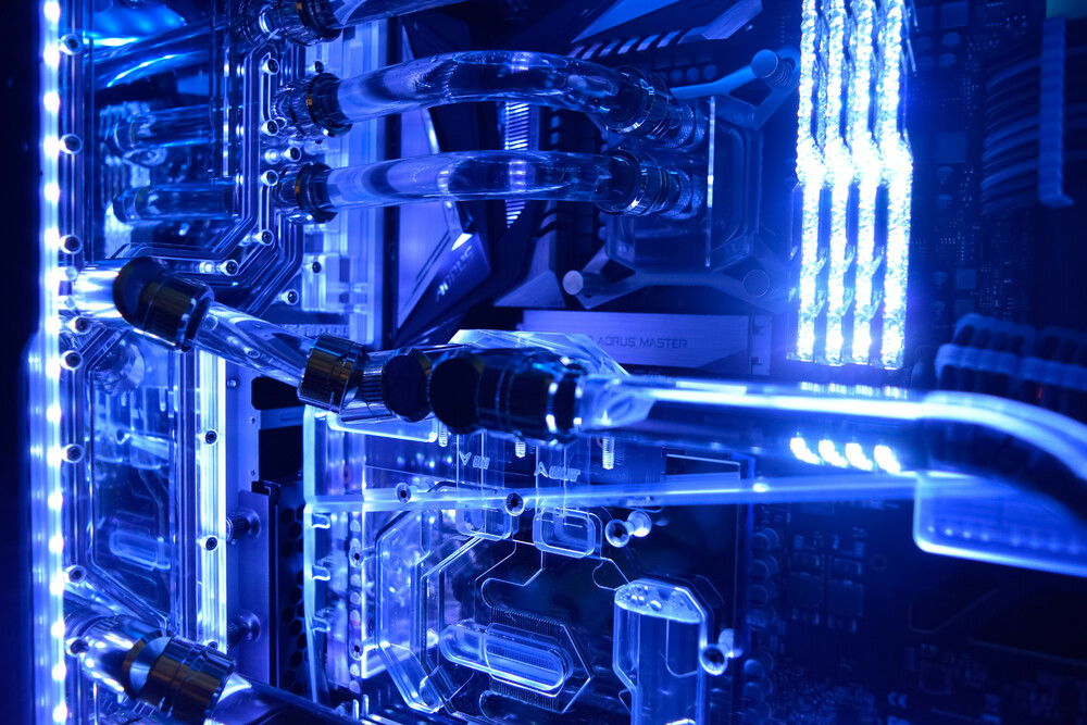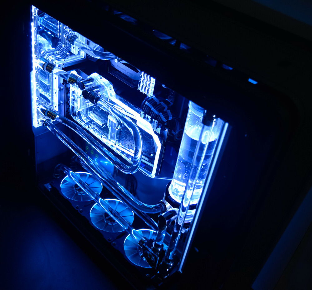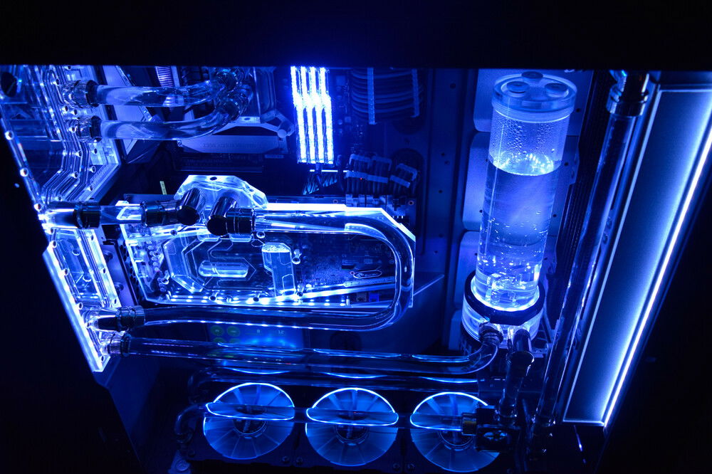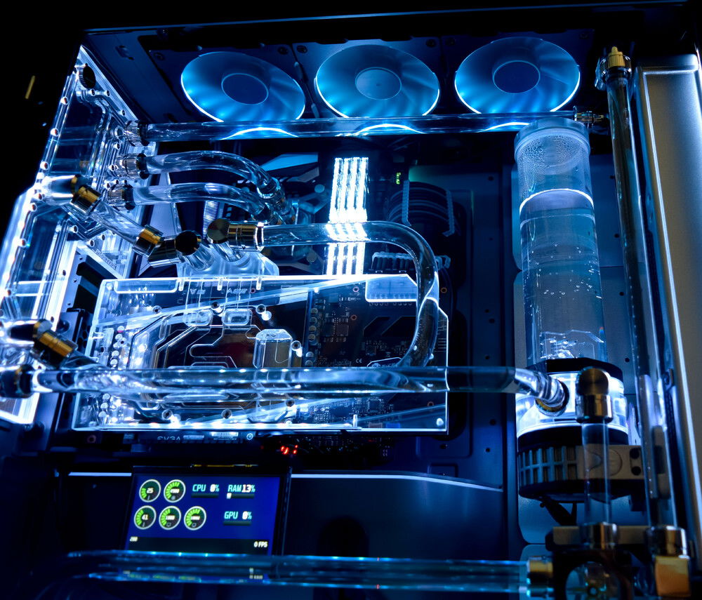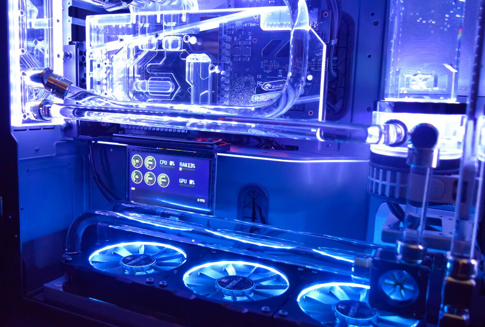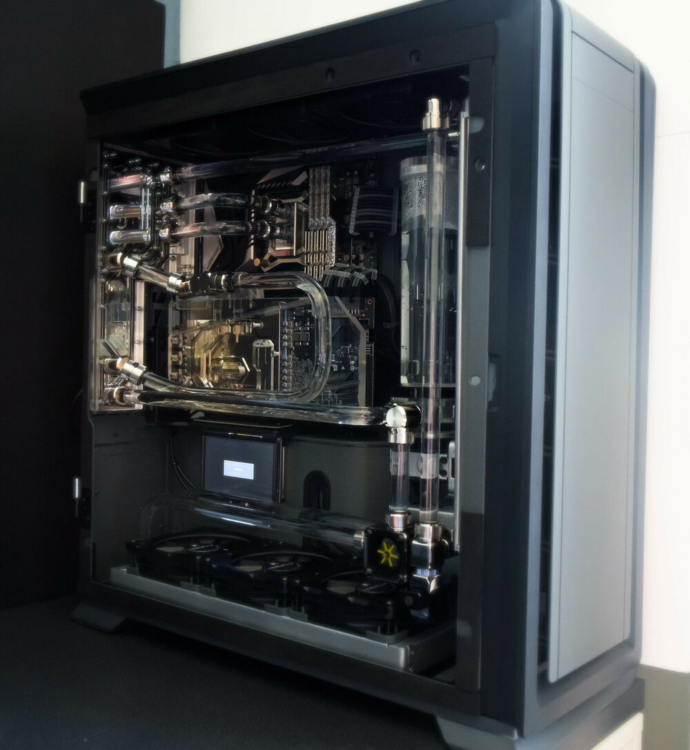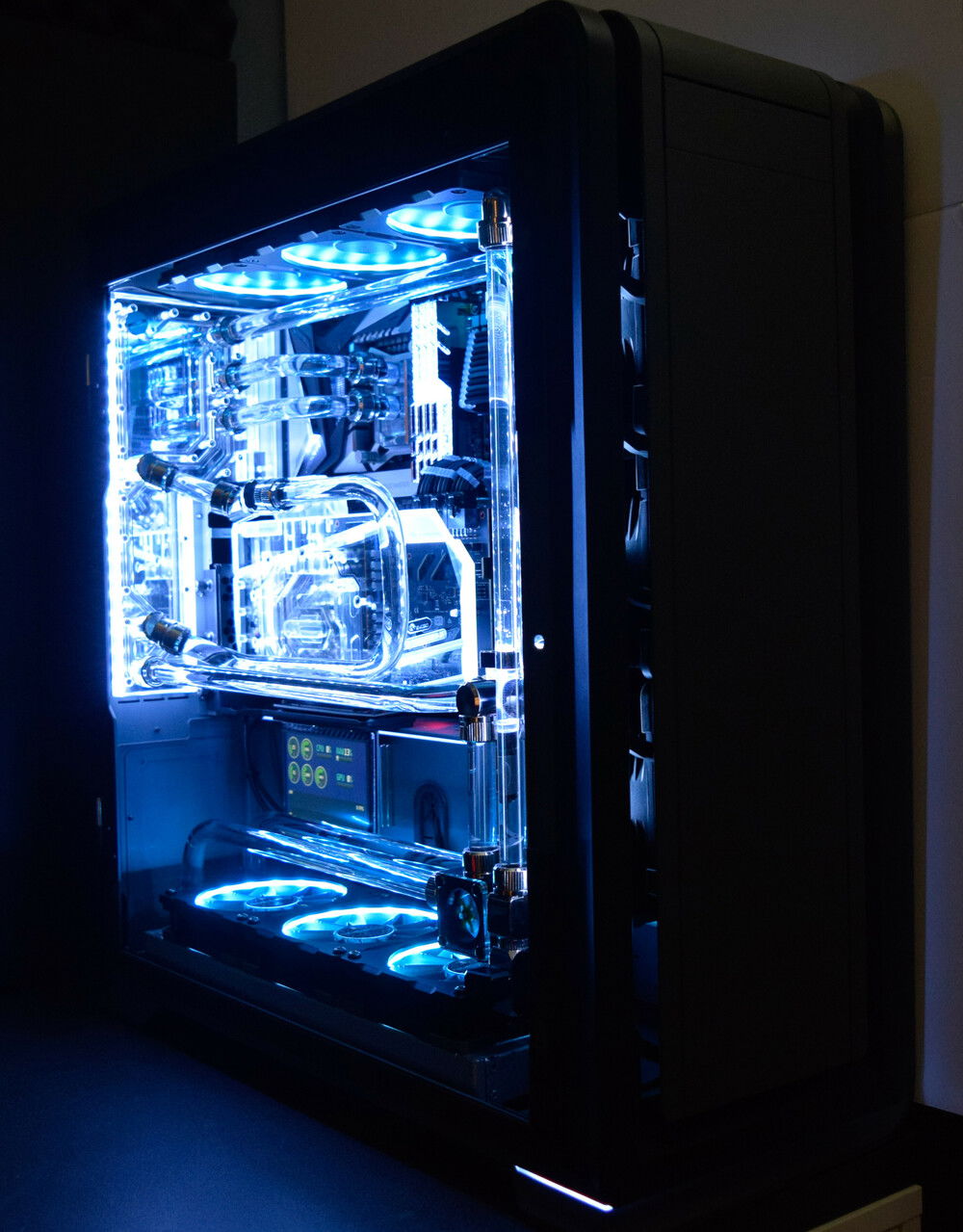 This is an updated customer build from December 2020. The build was only 3/4 completed, with temporary hardline runs, when I turned it over to him because he needed it to finish his 2020 year end projects. The build was incomplete because we didn’t have a GPU, so I lent him a spare 1080ti. After almost 7-months, he was finally able to get his 3000 series (3080 Ti) GPU using EVGA notifications.