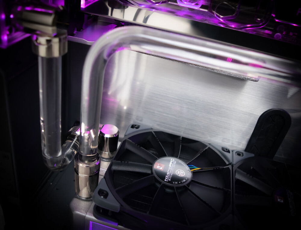 Prior to tear down, we flushed the system with Mayhems Blitz Part 2 for 24 hours. We then flushed and drained the loop 4x until the DI water was clear and pH up at 7. I then tore-down the entire loop and performed maintenance on the D5 pump and cleaned the dust from the case and the fans. Building in this case is quite easy, however, I am disappointed with the lack of cable management behind the motherboard shroud. I am surprised because this case is made for a dual-system configuration. The 140mm Phanteks Distro Plate does an excellent job in organizing the runs and keeping the majority of the tubing in the rear so my client can easily access the parts and provides the bonus seeing his hardware vs. tubing scattered throughout.