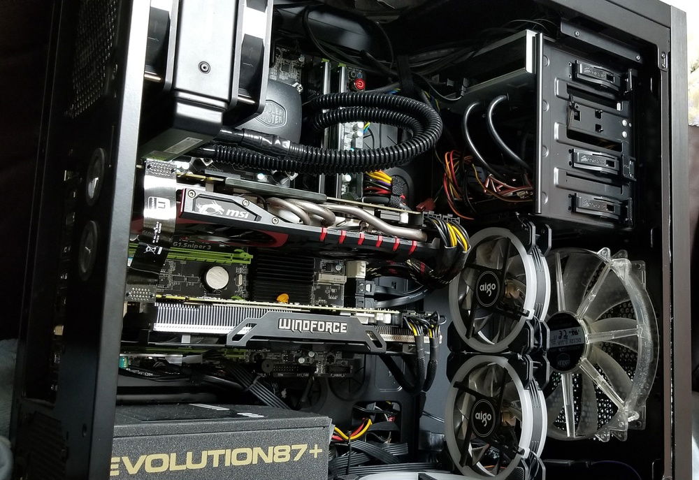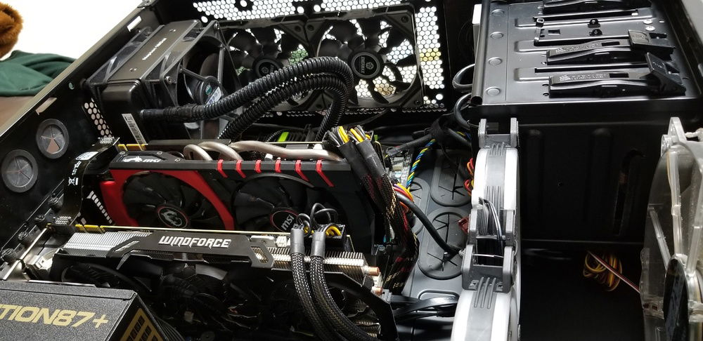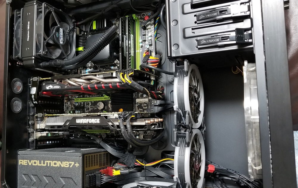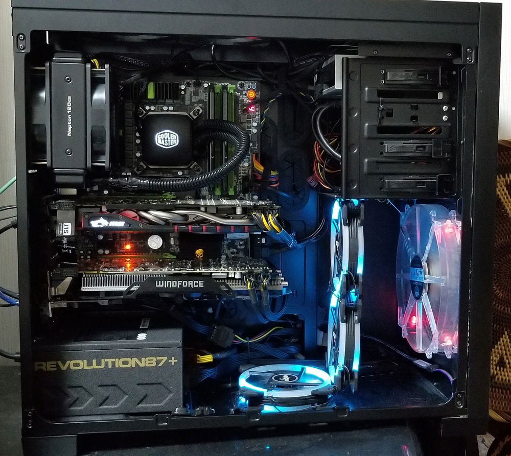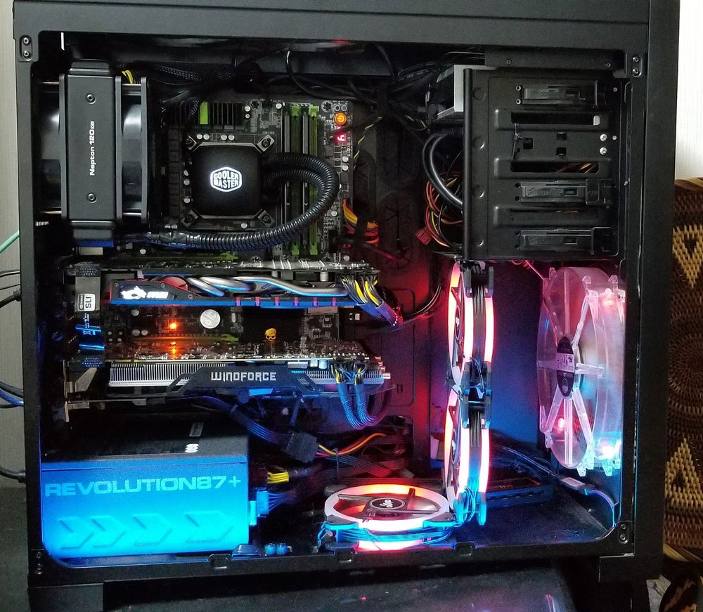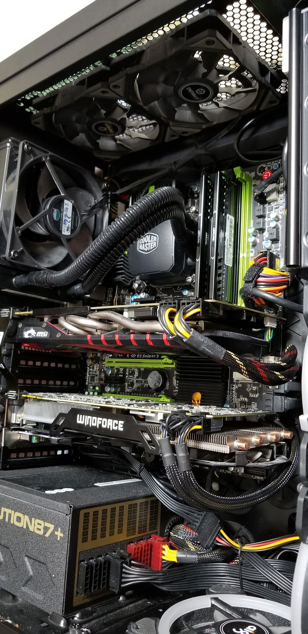 CPU: i7 - 2600K *I have it overclocked at 4.5GHz from its original base frequency of 3.4GHz. RAM: 16GB DDR3 1866MHz AIO: Cooler Master Nepton 120XL *I have the configeration at a Push/Pull in to the Case, because the heat produced by the SLI'd 980s was making the AIO struggle to keep the CPU cool. SLI: MSI GTX 980 and a Gigabyte Windforce GTX 980 *I have slightly overclocked them, so to match their clock speeds.