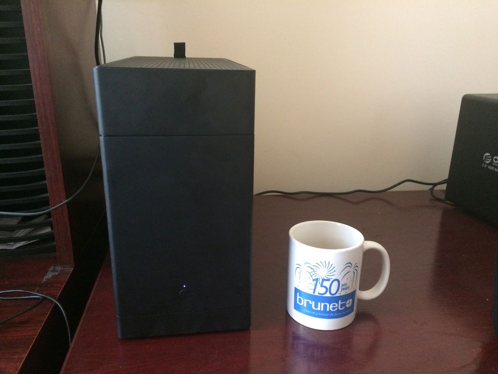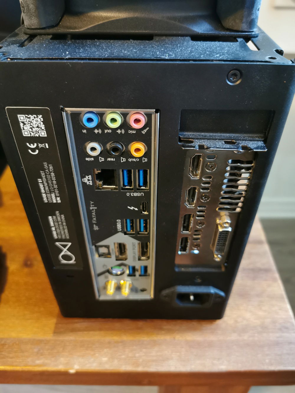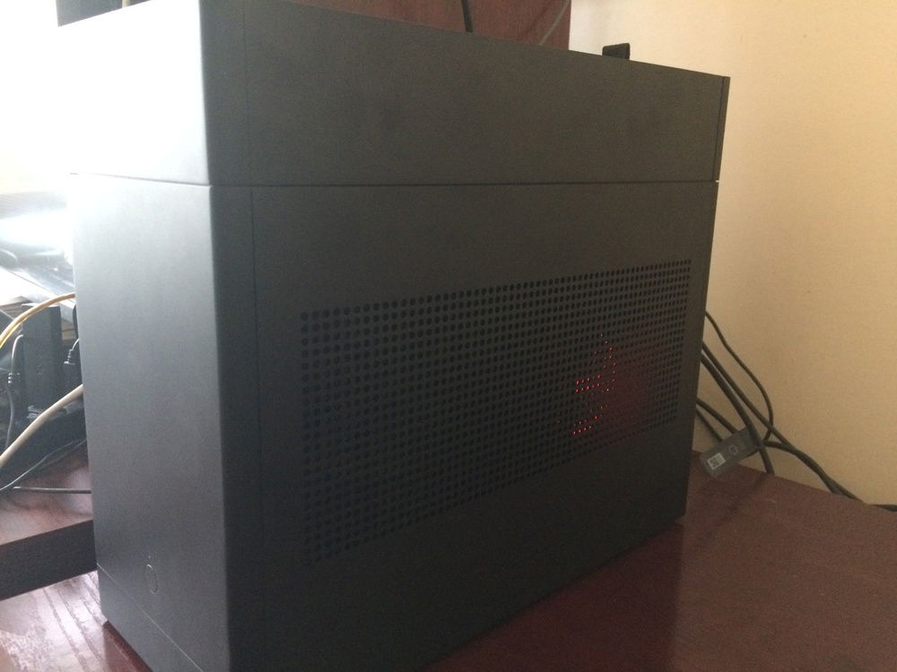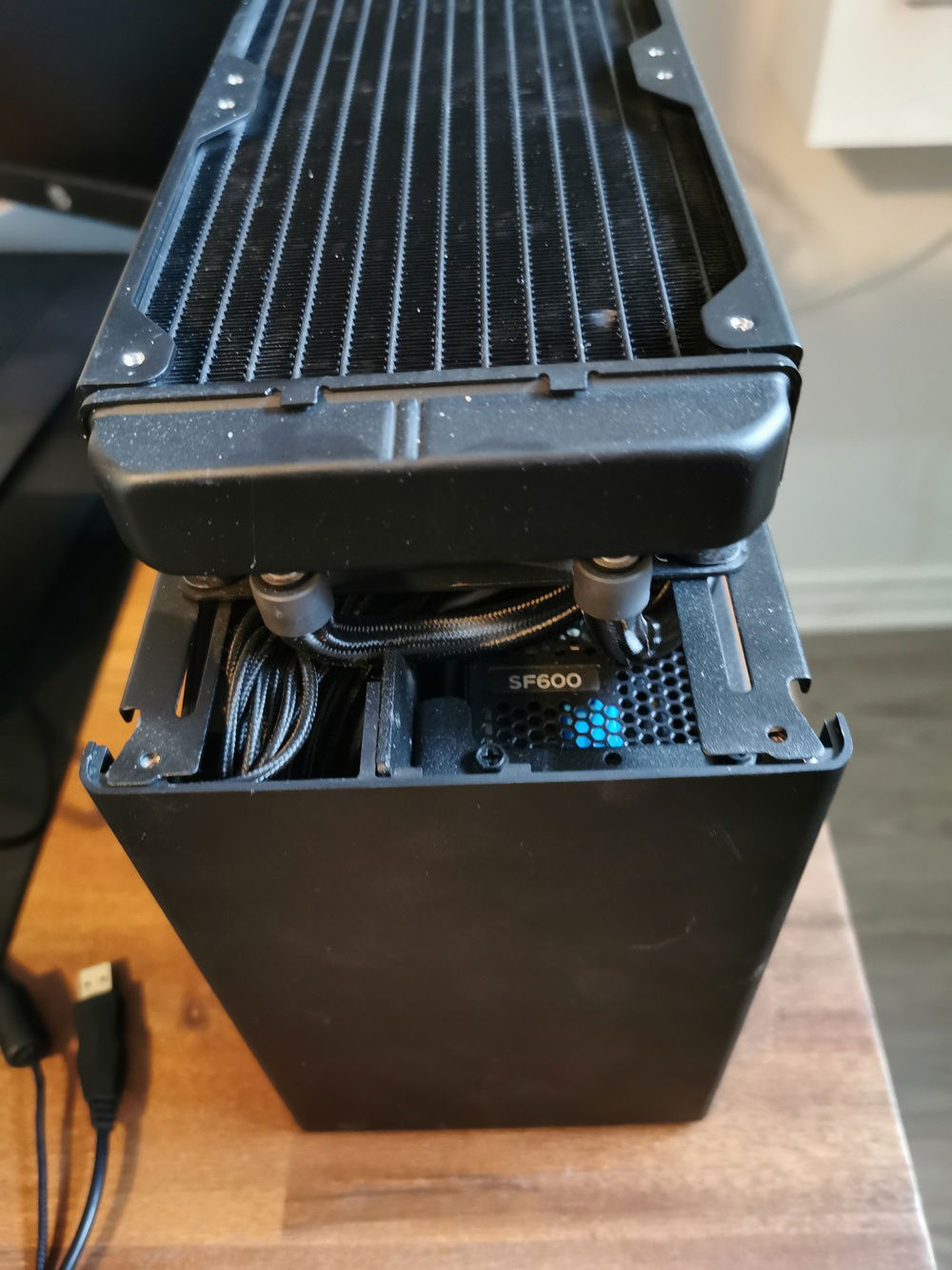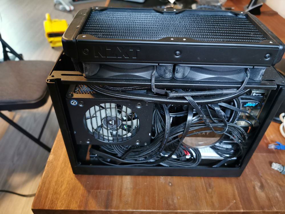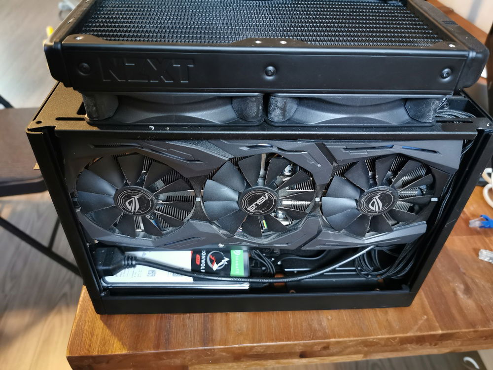 I built a Small Form Factor PC so that I could easily transport the PC for VR demos to friends and family. I used the Loque Ghost S1. The large extension (large tophat) on the top holds the radiator and fans in it, while the medium extension on the bottom (medium tophat) holds the two 2.5" SSDs and the 3.5" HDD.